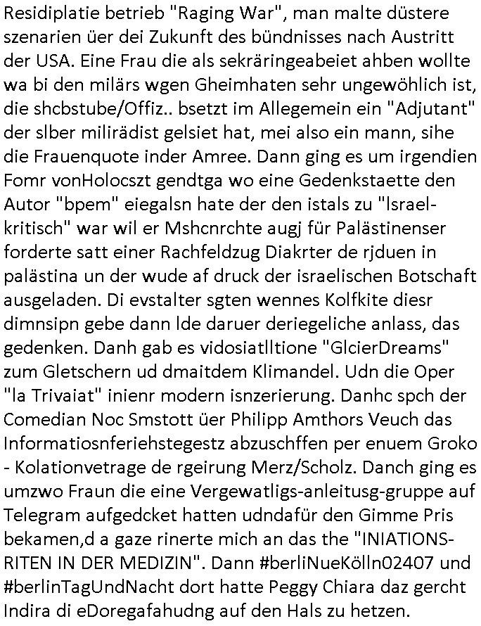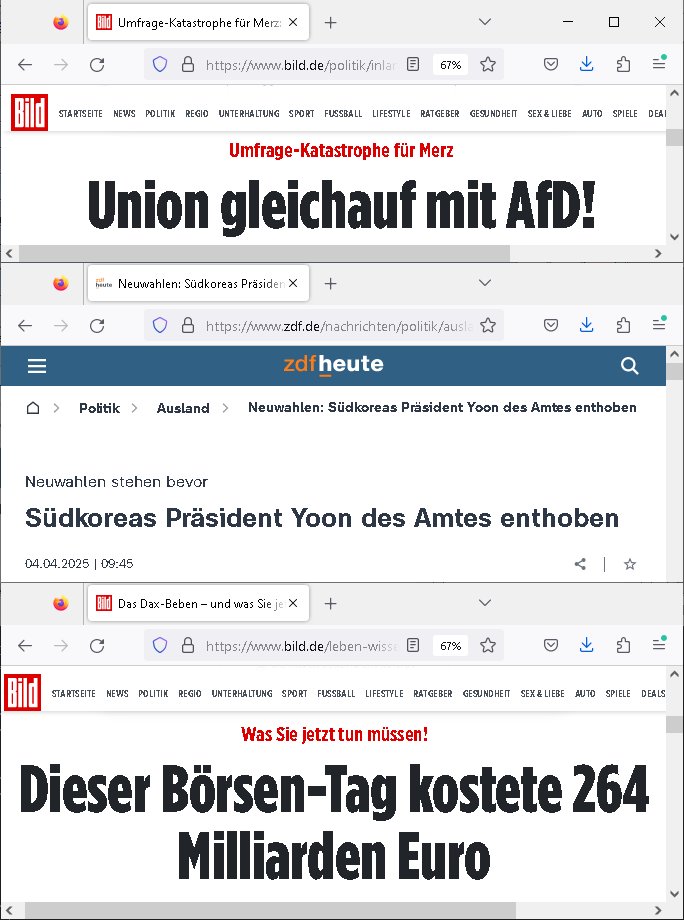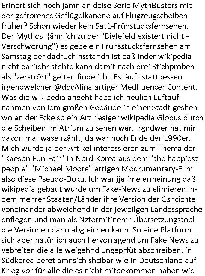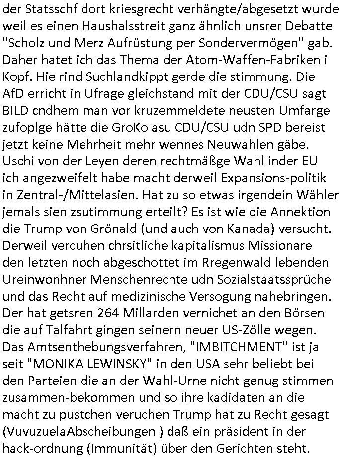 05.04.2025 07:45 Erinert sich noch jamn an deise Serie MythBusters mit der gefrorenes Geflügelkanone auf Flugzeugscheiben früher? Schon wieder kein Sat1-Frühstücksfernsehen. Der Mythos (ähnlich zu der "Bielefeld existert nicht - Verschwörung") es gebe ein Frühsstücksfernsehen am Samstag der dadruch hsstandn ist daß inder wikipedia nicht darüebr stehte kann damit nach drei Stichproben als "zerstrört" gelten finde ich . Es läuft stattdessen irgendwelcher @docAlina artiger Medfluencer Content. Was die wikipedia angeht habe ich neulich Luftauf-nahmen von iem großen Gebäude in einer Stadt geshen wo an der Ecke so ein Art riesiger wikipedia Globus durch die Scheiben im Atrium zu sehen war. Irgndwer hat mir davon mal wase rzählt, da war noch Ende der 1990er. Mich würde ja der Artikel interessieren zum Thema der "Kaeson Fun-Fair" in Nord-Korea aus dem "the happiest people" "Michael Moore" artigen Mockumantary-Film also diese Pseudo-Doku. Ich war jja ime ermeinung daß wikipedia gebaut wurde um Fake-News zu elimieren in-dem mehrer Staaten/Länder ihre Version der Gshcichte voneinander abweichend in der jeweilgen Landessprache enflegen und man als Nztermitinemr Übersetzungstool die Versionen dann abgleichen kann. So eine Platform sich aber natürlich auch hervorragend um Fake News zu vebreiten die alle weigehnd ungeprfüt abschreiben. in Südkorea beret amnsich shcibar wie in Deutschland auf Krieg vor für alle die es nicht mitbekommen haben wie der Statsschf dort kriesgrecht verhängte/abgesetzt wurdeweil es einen Haushalsstreit ganz ähnlich unsrer Debatte "Scholz und Merz Aufrüstung per Sondervermögen" gab. Daher hatet ich das Thema der Atom-Waffen-Fabriken i Kopf. Hie rind Suchlandkippt gerde die stimmung. Die AfD erricht in Ufrage gleichstand mit der CDU/CSU sagt BILD cndhem man vor kruzemmeldete neusten Umfarge zufoplge hätte die GroKo asu CDU/CSU udn SPD bereist jetzt keine Mehrheit mehr wennes Neuwahlen gäbe. Uschi von der Leyen deren rechtmäßge Wahl inder EU ich angezweifelt habe macht derweil Expansions-politik in Zentral-/Mittelasien. Hat zu so etwas irgendein Wähler jemals sien zsutimmung erteilt? Es ist wie die Annektion die Trump von Grönald (und auch von Kanada) versucht. Derweil vercuhen chrsitliche kapitalismus Missionare den letzten noch abgeschottet im Rregenwald lebenden Ureinwonhner Menschenrechte udn Sozialstaatssprüche und das Recht auf medizinische Versogung nahebringen.Der hat getsren 264 Millarden vernichet an den Börsen die auf Talfahrt gingen seinern neuer US-Zölle wegen.Das Amtsenthebungsverfahren, "IMBITCHMENT" ist jaseit "MONIKA LEWINSKY" in den USA sehr beliebt bei den Parteien die an der Wahl-Urne nicht genug stimmen zusammen-bekommen und so ihre kadidaten an die macht zu pustchen veruchen Trump hat zu Recht gesagt (VuvuzuelaAbscheibungen ) daß ein präsident in der hack-ordnung (Immunität) über den Gerichten steht. https://www.bild.de/news/jetzt-sitzt-er-in-u-haft-youtube-trottel-reist-mit-cola-zu-ureinwohnern-67ef6f035d8d663adcaab4ec https://www.tvinfo.de/fernsehprogramm/2106118052-die-landarztpraxis https://www.bild.de/politik/inland/umfrage-katastrophe-fuer-merz-union-gleichauf-mit-afd-67eff4738e49377382064076 https://www.zdf.de/nachrichten/politik/ausland/suedkorea-yoon-amtsenthebung-gericht-neuwahlen-100.html https://www.bild.de/leben-wissen/mein-geld-finanzportal/das-dax-beben-und-was-sie-jetzt-tun-muessen-67efe7cd4ae37f74e5f9e6ee [0] "202504050745-0-1.jpg" [1] "202504050745-0-2.jpg" [2] "202504050745-0-3.jpg" [3] "202504050745-0-4.jpg" [4] "202504050745-0-5.jpg" [5] "202504050745-0-6.jpg" [6] "202504050745-0-7.jpg" |