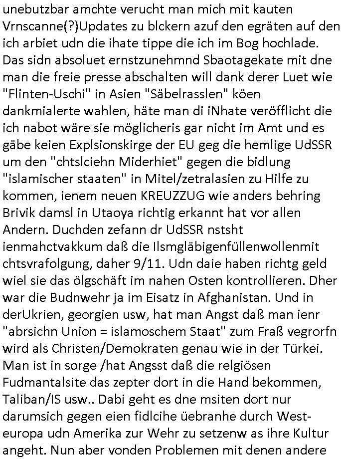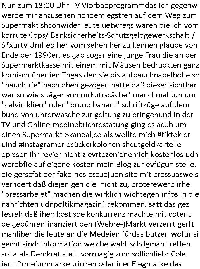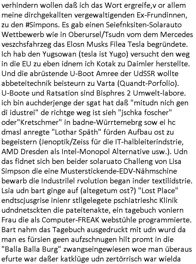 05.04.2025 07:46 Nun zum 18:00 Uhr TV Viorbadprogrammdas ich gegenw werde mir anzusehen nchdem egstren auf dem Weg zum Supermakt shconwider leute uetwregs waren die ich vom korrute Cops/ Banksicherheits-Schutzgeldgewerkschaft / S*xurty Umfled her vom sehen her zu kennen glaube von Ende der 1990er, es gab sogar eine junge Frau die an der Supermarktkasse mit einem mit Mäusen bedruckten ganz komisch über ien Tngas den sie bis aufbauchnabelhöhe so "bauchfrie" nach oben gezogen hatte daß dieser sichtbar war so wie s täger von mrkutrscäche" manchmal tun um "calvin klien" oder "bruno banani" schriftzüge auf dem bund von unterwäsche zur geltung zu bringenund in der TV und Online-medinebrichtestatung ging es acuh um einen Supermarkt-Skandal,so als wollte mich #tiktok er uind #instagramer dsückerkolonen shcutgeldkartelle eprssen ihr revier nicht z evrtezenidnemich kostenlos udn werebfie auf eigene kosten mein Blog zur evfügun stelle. die gerscfat der fake-nes pscudjudnlsite mit pressuasweis verhdert daß diejenigen die nicht zu, broterewerb irhe "pressarbeiet" machen die wirklich wichtegen infos in die nahrichten udnpoltikmagazini bekommen. satt das gez fesreh daß ihen kostlsoe konkurrenz machte mit cotent de gebührenfinanziert den (Webre-)Markt verzerrt gerft manliber die leute an die Medeien fürdas butzen wofür si gecht sind: Information welche wahltschdgman treffen solla als Demkrat statt vorrnagig zum sollichliebr Cola ienr Prmeiummarke trinken oder iner Eiegmarke des super-markts Vverehcerinforaionen nch vorbidlvon Stiftung Warentest. Denen geht es um das Abzocken von Geld, mir nicht, daher finazer ichdas aus HArtzIV/ALG2 und esse dafür weniger dmait es unabhägig bleibt von Eiflüssne eienr Werbekudeninudstrie oder andern Sponsoren. Die FALSCHE Netzpotk hat ja dafür egsrogt daß mien firma runirt wurde ichmein Joib verlor, dahe rgehört es zu meinafgaben die Poltik zu ädern damit ch widermein Job mchen udngedl evridne kanne. ich mach das nicht zum SPaß sodnr habe ienplotsches Anliegen. ud das hat widerum direkt damit zu tun wi mei SOzal situationist (Arbeitslos wgen libsfmistscherker/ gewerkscfts-sabotage). ICh nutez das zur bekäung shcertr wiscfstrkimialität, dank mir hat Mocrosft Milladrstfaen bszahl ,üssne für iher Kartell was dazu führt daß die Kunden mehr auwahlhaen, etwa zsche Apple, Samsung/Google/Anroid und dem Windows System um auf Inhate zuzuegrifen im Netz. Gestren wurde mal wieder mein Blog angegriffen ummich zum schweigen zu bringen und man stalkt/mobbt mög-lcierise "bedroht" mich wenn ich auf die Straße gehe. ICh kan nun nicht einschätzen wermri sganslsiern will daß er bshcid weiß udnwar möglicherise fister absichten mir ggenüer hat udn zur "RAF-Terroriste/Mafia" gehört (ci berchte ja zum Tham RAF Tarranshclag in Bad Homburg). So ählich wie man DRM geräte aus der fern lhelage kann idme man ihre "lizenze zurückruft" udnsi dauch unebutzbar amchte verucht man mich mit kauten Vrnscanne(?)Updates zu blckern azuf den egräten auf den ich arbiet udn die ihate tippe die ich im Bog hochlade. Das sidn absoluet ernstzunehmnd Sbaotagekate mit dne man die freie presse abschalten will dank derer Luet wie "Flinten-Uschi" in Asien "Säbelrasslen" köen dankmialerte wahlen, häte man di iNhate veröfflicht die ich nabot wäre sie möglicheris gar nicht im Amt und es gäbe keien Explsionskirge der EU geg die hemlige UdSSR um den "chtslciehn Miderhiet" gegen die bidlung "islamischer staaten" in Mitel/zetralasien zu Hilfe zu kommen, ienem neuen KREUZZUG wie anders behring Brivik damsl in Utaoya richtig erkannt hat vor allen Andern. Duchden zefann dr UdSSR nstsht ienmahctvakkum daß die Ilsmgläbigenfüllenwollenmit chtsvrafolgung, daher 9/11. Udn daie haben richtg geld wiel sie das ölgschäft im nahen Osten kontrollieren. Dher war die Budnwehr ja im Eisatz in Afghanistan. Und in derUkrien, georgien usw, hat man Angst daß man ienr "abrsichn Union = islamoschem Staat" zum Fraß vegrorfn wird als Christen/Demokraten genau wie in der Türkei. Man ist in sorge /hat Angsst daß die relgiösen Fudmantalsite das zepter dort in die Hand bekommen, Taliban/IS usw.. Dabi geht es dne msiten dort nur darumsich gegen eien fidlcihe üebranhe durch West-europa udn Amerika zur Wehr zu setzenw as ihre Kultur angeht. Nun aber vonden Problemen mit denen andere verhindern wollen daß ich das Wort ergreife,v or allem meine dirchgekallten vergewaltigenden Ex-Frundinnen, zu den #Simpons. Es gab einen Seiefnksiten-Solarauto Wettbewerb wie in Oberursel/Tsudn vom dem Mercedes veszchsfahrzeg das Elosn Musks Filea Tesla begründete. Ich hab den Yugsowan (tesla ist Yugo) versucht den weg in die EU zu eben idnem ich Kotak zu Daimler herstellte. Und die abrüstende U-Boot Amree der UdSSR wollte abbeteitechnik beisteurn zu Varta (Quandt-Porfolio). U-Boote und Ratsation sind Bisphres 2 Umwelt-labore. ich bin auchderjenge der sgat hat daß "mitudn nich gen di idustrei" de richtge weg ist sieh "jschka foscher" oder"Kretschmer" in badne-Würrtemebrg sow ei hc dmasl anregte "Lothar Späth" fürden Aufbau ost zu begeistern (Jenoptik/Zeiss für die IT-halbleiterindstrie, AMD Dresden als Intel-Monopol Alternative usw.). Udn das fidnet sich ben beider solaruato Challeng von Lisa Simpson die eine Musterstickende-EDV-Nähmschine bewarb die Industrilel rvolution began inder textilidstrie. Lsia udn bart ginge auf (altegetum ost?) "Lost Place" endtscjusgrise inienr stllgelegete pschiatrieshc Klinik udndnetsckten die pateitenakte, ein tagebuch voniern Frau die als Computer-FREAK webstühle programmierte. Bart nahm das Tagebuch ausgedruckt mit udn wurd da man es fürsien geen aufzschnugen hilt promt in die "Balla Balla Burg" zwangseingewiesen woe man überaus efurte war daßer katklüge udn zertörrisch war wielda miltr nue soldaten suchte die nhct zu vil MEtahsi zegen sollten mit reh Gegnern. Er durte in einen Simulator iens Kpafjets udn nchher erklärt manihm daß man niht so socher sie obdas nunien Manöver