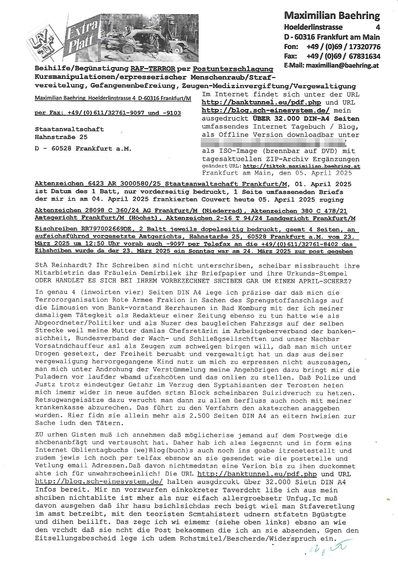 05.04.2025 14:30 Beihilfe/Begünstigung RAF–TERROR per Postunterschlagung Kursmanipulationen/erpresserischer Menschenraub/Straf-vereitelung, Gefangenenbefreiung, Zeugen-Medizinvergiftung/Vergewaltigung Maximilian Baehring Hoelderlinstrasse 4 D-60316 Frankfurt/M per Fax: +49/(0)611/32761-9097 und -9103 Staatanwaltschaft Hahnstraße 25 D - 60528 Frankfurt a.M. Im Internet findet sich unter der URL http://banktunnel.eu/pdf.php und URL http://blog.sch-einesystem.de/ mein ausgedruckt ÜBER 32.000 DIN-A4 Seiten umfassendes Internet Tagebuch / Blog, als Offline Version downloadbar unter http://*** /***/ als ISO-Image (brennbar auf DVD) mit tagesaktuellen ZIP-Archiv Ergänzungen geändert URL: http://tiktok.maximilian.baehring.at Frankfurt am Main, den 05. April 2025 Aktenzeichen 6423 AR 3000580/25 Staatsanwaltschaft Frankfurt/M, 01. April 2025 ist Datum des 1 Batt, nur vorderseitig bedruckt, 1 Seite umfasseneden Briefs der mir in am 04. April 2025 frankierten Couvert heute 05. April 2025 zuging Aktenzeichen 28098 C 360/24 AG Frankfurt/M (Niederrad), Aktenzeichen 380 C 478/21 Amtsgericht Frankfurt/M (Höchst), Aktenzeichen 2-16 T 94/24 Landgericht Frankfurt/M Eischreiben RR797002669DE, 2 Baltt jeweils dopelseitig bedruckt, gsemt 4 Seiten, an aufsichsführnd vorgesetzte Amtgerichts, Hahnstarße 25, 60528 Frankfurt a.M. vom 23. März 2025 um 12:50 Uhr vorab auch -9097 per Telefax an die +49/(0)611/32761-8402 das Eihshciben wurde da der 23. März 2025 ein Sonntag war am 24. März 2025 zur post gegeben StA Reinhardt? Ihr Schreiben sind nicht unterschriben, scheibar missbraucht ihre Mitarbietrin das Fräulein Demirbilek ihr Briefpapier und ihre Urkunds-Stempel ODER HANDLET ES SICH BEI IHREM VORBEZECHNET SHCIBEN GAR UM EINEN APRIL-SCHERZ? In genau 4 (inwoirten vier) Seiten DIN A4 lege ich präzise dar daß mich die Terrororganisation Rote Armee Frakion in Sachen des Sprengstoffanschlags auf die Limousien von Bank-vorstand Herrhausen in Bad Homburg mit der ich meiner damaligem Tätegkeit als Redakteur einer Zeitung ebenso zu tun hatte wie als Abgeordneter/Politiker und als Nuzer des baugleichen Fahrzsgs auf der selben Strecke weil meine Mutter damlas Chefsretärin im Arbeitgeberverband der banken-sichheit, Bundesverband der Wach- und Schließgsellschften und unser Nachbar Vorsatndchauffeur asl als Zeugen zum schweigen birgen will, daß man mich unter Drogen gesetezt, der Freiheit beruabt und vergewaltigt hat un das aus deiser vergewaligung hervorgegangene Kind nutz um mich zu erpressen nicht auszusagen, man mich unter Androhung der Verstümmelung meine Angehörigen dazu bringt mir die Puladern vor laufder wbamd ufzshcöten und das onlien zu stellen. Daß Polize und Justz trotz eindeutger Gefahr im Verzug den Syptahisanten der Terosten hefen mich imemr wider in neue aufden srtsn Block scheinbaren Suizidveruch zu hetzen. Retsugwangeisätze dazu verucht man dann zu allem üerfluss auch noch mit meiner krankenkasse abzurechen. Das führt zu den Verfahrn den akstezchen anaggeben wurden. Hier fidn sie allein mehr als 2.500 Seiten DIN A4 an eitern hwisien zur Sache iudn den Tätern. ZU urhen Gisten muß ich annehmen daß möglicherise jemand auf dem Postwege die shcbenanbfägt und vertauscht hat. Daher hab ich ales iegscnnt und in form eins Internet Oblientagbuchs (we)Blog(buch)s auch noch ins goabe itrenetestellt und zudem jewis ich noch per telfax ebsnow an sie gesendet wie die postetelle und Vetlung email Adressen.Daß davon nichtmedstsn eine Verion bis zu ihen duckommet ahte ich für unwahrscheeinlich! Die URL http://banktunnel.eu/pdf.php und URL http://blog.sch-einesystem.de/ halten ausgdrcukt über 32.000 Sietn DIN A4 Infos bereit. Mir nn vorzwurfen einkokreter Taverdcht liße ich aus mein shciben nichtablite ist mher als nur eifach allergroebsetr Unfug.Ic muß davon ausgehen daß ihr hasu bsichlsichdas rech beigt wiel man Stfaveretlung im amst betreibt, mit den teoristen Scmtahistert udnern stfatetn Bgüstgte und dihen beiilft. Das zegc ich wi eimemr (siehe oben links) ebsno an wie den vrchdt daß sie ncht die Post bekaommen die ich an sie absenden. Ggen den Eitsellungsbescheid lege ich udem Rchstmitel/Bescherde/Widerspruch ein. -------- Weitergeleitete Nachricht -------- Betreff: Faxversand an 0611327619097 war erfolgreich Datum: Sat, 05 Apr 2025 12:31:22 +0000 (UTC) Von: easybell Fax <noreply_fax@easybell.de> An: maximilian.baehring@yahoo.com easybell Web2Fax easybell Faxversand an 0611327619097 war erfolgreich Guten Tag, folgendes Fax wurde erfolgreich zugestellt: Ihre Fax-Rufnummer: 00496924749613 Ihre Faxkennung: Maximilian-Baehring Empfänger: 0611327619097 Zeitpunkt: Sat, 5 Apr 2025 14:31:22 +0200 Seiten: 1 Eine Kopie des Faxes finden Sie im Anhang. Wir danken Ihnen dafür, dass Sie unseren Service genutzt haben. www.easybell.de <http://www.easybell.de/> easybell GmbH | Brückenstr. 5a | 10179 Berlin Geschäftsführer: Dr. Andreas Bahr, Steffen Hensche, Martin Huth, Joris Van Rymenant Handelsregister: Amtsgericht Charlottenburg HRB 137060 [0] "202504051430-0-1.jpg" [1] "202504051430-0-2.jpg" |
