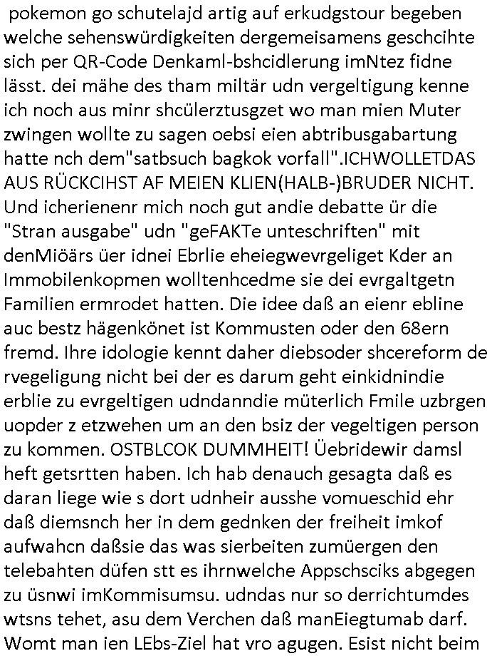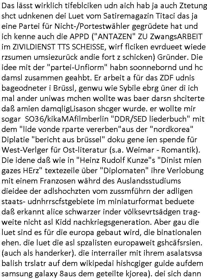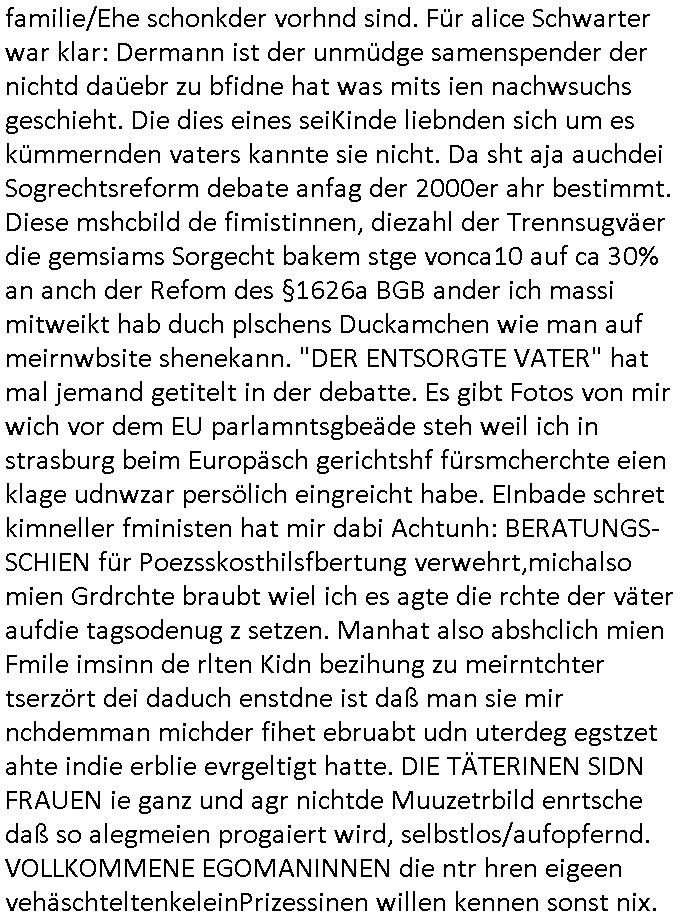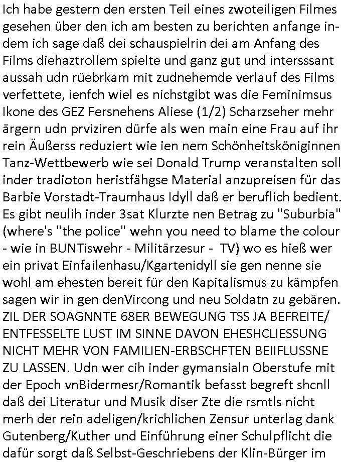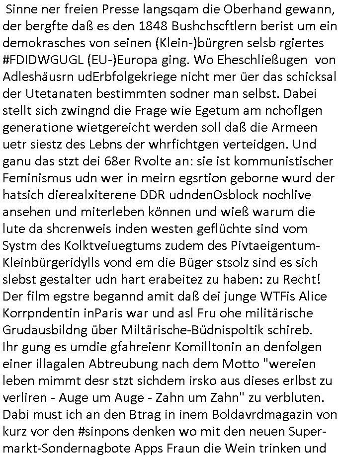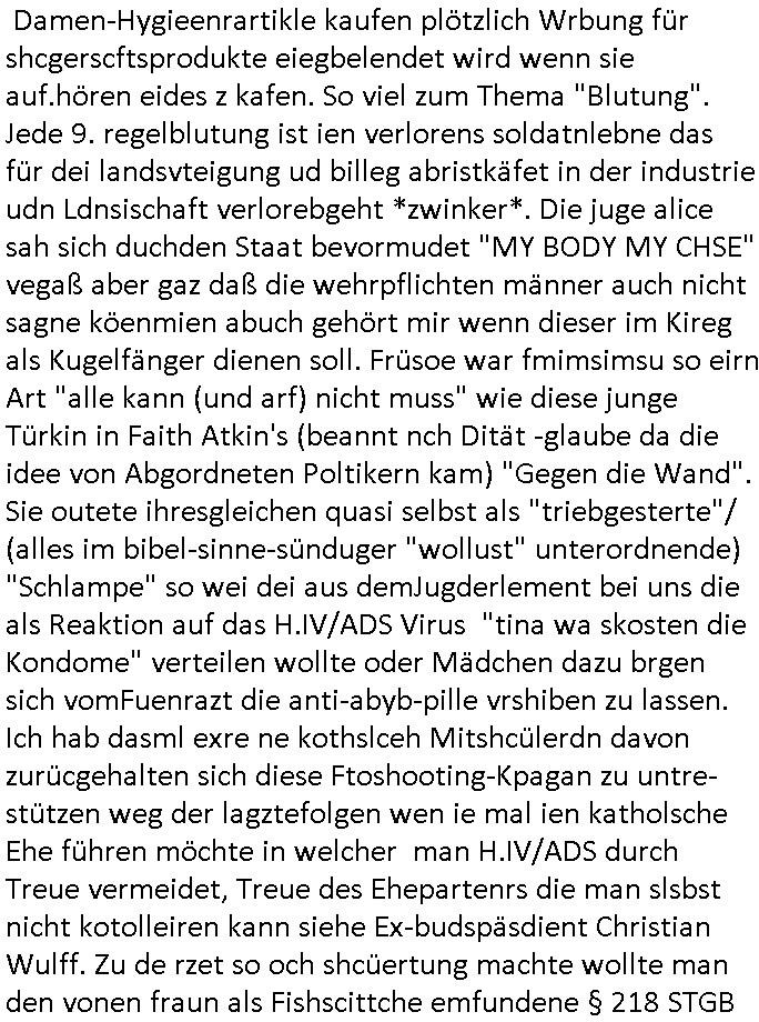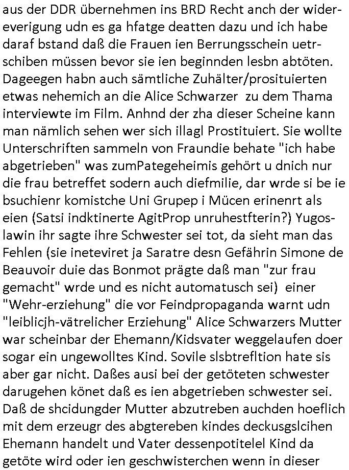 26.04.2025 07:30 Ich habe gestern den ersten Teil eines zwoteiligen Filmes gesehen über den ich am besten zu berichten anfange in-dem ich sage daß dei schauspielrin dei am Anfang des Films diehaztrollem spielte und ganz gut und intersssant aussah udn rüebrkam mit zudnehemde verlauf des Films verfettete, ienfch wiel es nichstgibt was die Feminimsus Ikone des GEZ Fersnehens Aliese (1/2) Scharzseher mehr ärgern udn prviziren dürfe als wen main eine Frau auf ihr rein Äußerss reduziert wie ien nem Schönheitsköniginnen Tanz-Wettbewerb wie sei Donald Trump veranstalten soll inder tradioton heristfähgse Material anzupreisen für das Barbie Vorstadt-Traumhaus Idyll daß er beruflich bedient. Es gibt neulih inder 3sat Klurzte nen Betrag zu "Suburbia" (where's "the police" wehn you need to blame the colour - wie in BUNTiswehr - Militärzesur - TV) wo es hieß wer ein privat Einfailenhasu/Kgartenidyll sie gen nenne sie wohl am ehesten bereit für den Kapitalismus zu kämpfen sagen wir in gen denVircong und neu Soldatn zu gebären. ZIL DER SOAGNNTE 68ER BEWEGUNG TSS JA BEFREITE/ ENTFESSELTE LUST IM SINNE DAVON EHESHCLIESSUNG NICHT MEHR VON FAMILIEN-ERBSCHFTEN BEIIFLUSSNE ZU LASSEN. Udn wer cih inder gymansialn Oberstufe mit der Epoch vnBidermesr/Romantik befasst begreft shcnll daß dei Literatur und Musik diser Zte die rsmtls nicht merh der rein adeligen/krichlichen Zensur unterlag dank Gutenberg/Kuther und Einführung einer Schulpflicht die dafür sorgt daß Selbst-Geschriebens der Klin-Bürger im Sinne ner freien Presse langsqam die Oberhand gewann, der bergfte daß es den 1848 Bushchscftlern berist um ein demokrasches von seinen (Klein-)bürgren selsb rgiertes #FDIDWGUGL (EU-)Europa ging. Wo Eheschließugen von Adleshäusrn udErbfolgekriege nicht mer üer das schicksal der Utetanaten bestimmten sodner man selbst. Dabei stellt sich zwingnd die Frage wie Egetum am nchoflgen generatione wietgereicht werden soll daß die Armeen uetr siestz des Lebns der whrfichtgen verteidgen. Und ganu das stzt dei 68er Rvolte an: sie ist kommunistischer Feminismus udn wer in meirn egsrtion geborne wurd der hatsich dierealxiterene DDR udndenOsblock nochlive ansehen und miterleben können und wieß warum die lute da shcrenweis inden westen geflüchte sind vom Systm des Kolktveiuegtums zudem des Pivtaeigentum-Kleinbürgeridylls vond em die Büger stsolz sind es sich slebst gestalter udn hart erabeitez zu haben: zu Recht! Der film egstre begannd amit daß dei junge WTFis Alice Korrpndentin inParis war und asl Fru ohe militärische Grudausbildng über Miltärische-Büdnispoltik schireb. Ihr gung es umdie gfahreienr Komilltonin an denfolgen einer illagalen Abtreubung nach dem Motto "wereien leben mimmt desr stzt sichdem irsko aus dieses erlbst zu verliren - Auge um Auge - Zahn um Zahn" zu verbluten. Dabi must ich an den Btrag in inem Boldavrdmagazin von kurz vor den #sinpons denken wo mit den neuen Super-markt-Sondernagbote Apps Fraun die Wein trinken und Damen-Hygieenrartikle kaufen plötzlich Wrbung für shcgerscftsprodukte eiegbelendet wird wenn sie auf.hören eides z kafen. So viel zum Thema "Blutung". Jede 9. regelblutung ist ien verlorens soldatnlebne das für dei landsvteigung ud billeg abristkäfet in der industrie udn Ldnsischaft verlorebgeht *zwinker*. Die juge alice sah sich duchden Staat bevormudet "MY BODY MY CHSE" vegaß aber gaz daß die wehrpflichten männer auch nicht sagne köenmien abuch gehört mir wenn dieser im Kireg als Kugelfänger dienen soll. Früsoe war fmimsimsu so eirn Art "alle kann (und arf) nicht muss" wie diese junge Türkin in Faith Atkin's (beannt nch Dität -glaube da die idee von Abgordneten Poltikern kam) "Gegen die Wand". Sie outete ihresgleichen quasi selbst als "triebgesterte"/ (alles im bibel-sinne-sünduger "wollust" unterordnende) "Schlampe" so wei dei aus demJugderlement bei uns die als Reaktion auf das H.IV/ADS Virus "tina wa skosten die Kondome" verteilen wollte oder Mädchen dazu brgen sich vomFuenrazt die anti-abyb-pille vrshiben zu lassen. Ich hab dasml exre ne kothslceh Mitshcülerdn davon zurücgehalten sich diese Ftoshooting-Kpagan zu untre-stützen weg der lagztefolgen wen ie mal ien katholsche Ehe führen möchte in welcher man H.IV/ADS durch Treue vermeidet, Treue des Ehepartenrs die man slsbst nicht kotolleiren kann siehe Ex-budspäsdient Christian Wulff. Zu de rzet so och shcüertung machte wollte man den vonen fraun als Fishscittche emfundene § 218 STGB aus der DDR übernehmen ins BRD Recht anch der wider-everigung udn es ga hfatge deatten dazu und ich habe daraf bstand daß die Frauen ien Berrungsschein uetr-schiben müssen bevor sie ien beginnden lesbn abtöten. Dageegen habn auch sämtliche Zuhälter/prosituierten etwas nehemich an die Alice Schwarzer zu dem Thama interviewte im Film. Anhnd der zha dieser Scheine kann man nämlich sehen wer sich illagl Prostituiert. Sie wollte Unterschriften sammeln von Fraundie behate "ich habe abgetrieben" was zumPategeheimis gehört u dnich nur die frau betreffet sodern auch diefmilie, dar wrde si be ie bsuchienr komistche Uni Grupep i Mücen erinenrt als eien (Satsi indktinerte AgitProp unruhestfterin?) Yugos-lawin ihr sagte ihre Schwester sei tot, da sieht man das Fehlen (sie ineteviret ja Saratre desn Gefährin Simone de Beauvoir duie das Bonmot prägte daß man "zur frau gemacht" wrde und es nicht automatusch sei) einer "Wehr-erziehung" die vor Feindpropaganda warnt udn "leiblicjh-vätrelicher Erziehung" Alice Schwarzers Mutter war scheinbar der Ehemann/Kidsvater weggelaufen doer sogar ein ungewolltes Kind. Sovile slsbtrefltion hate sis aber gar nicht. Daßes ausi bei der getöteten schwester darugehen könet daß es ien abgetrieben schwester sei. Daß de shcidungder Mutter abzutreben auchden hoeflich mit dem erzeugr des abgtereben kindes deckusgslcihen Ehemann handelt und Vater dessenpotitelel Kind da getöte wird oder ien geschwisterchen wenn in dieser familie/Ehe schonkder vorhnd sind. Für alice Schwarter w