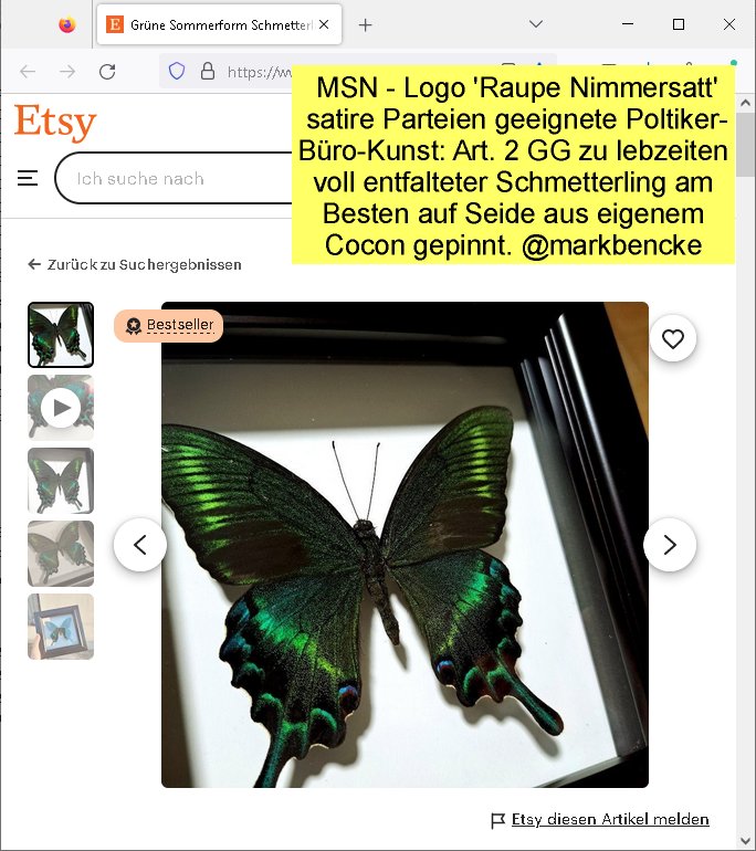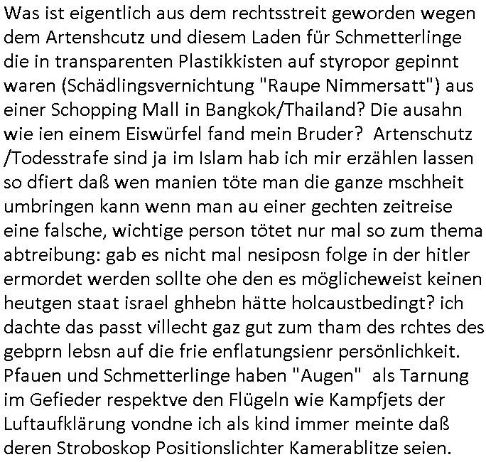 26.04.2025 07:31 Was ist eigentlich aus dem rechtsstreit geworden wegen dem Artenshcutz und diesem Laden für Schmetterlinge die in transparenten Plastikkisten auf styropor gepinnt waren (Schädlingsvernichtung "Raupe Nimmersatt") aus einer Schopping Mall in Bangkok/Thailand? Die ausahn wie ien einem Eiswürfel fand mein Bruder? Artenschutz /Todesstrafe sind ja im Islam hab ich mir erzählen lassen so dfiert daß wen manien töte man die ganze mschheit umbringen kann wenn man au einer gechten zeitreise eine falsche, wichtige person tötet nur mal so zum thema abtreibung: gab es nicht mal nesiposn folge in der hitler ermordet werden sollte ohe den es möglicheweist keinen heutgen staat israel ghhebn hätte holcaustbedingt? ich dachte das passt villecht gaz gut zum tham des rchtes des gebprn lebsn auf die frie enflatungsienr persönlichkeit. Pfauen und Schmetterlinge haben "Augen" als Tarnung im Gefieder respektve den Flügeln wie Kampfjets der Luftaufklärung vondne ich als kind immer meinte daß deren Stroboskop Positionslichter Kamerablitze seien. https://de.wikipedia.org/wiki/MSN_(Microsoft_Network)#/media/Datei:MSN_logo.svg https://www.etsy.com/de/shop/ButterflyDecorStore MSN - Logo 'Raupe Nimmersatt' satire Parteien geeignete Poltiker- Büro-Kunst: Art. 2 GG zu lebzeiten voll entfalteter Schmetterling am Besten auf Seide aus eigenem Cocon gepinnt. @markbencke [0] "202504260731-0-1.jpg" [1] "202504260731-0-2.jpg" |