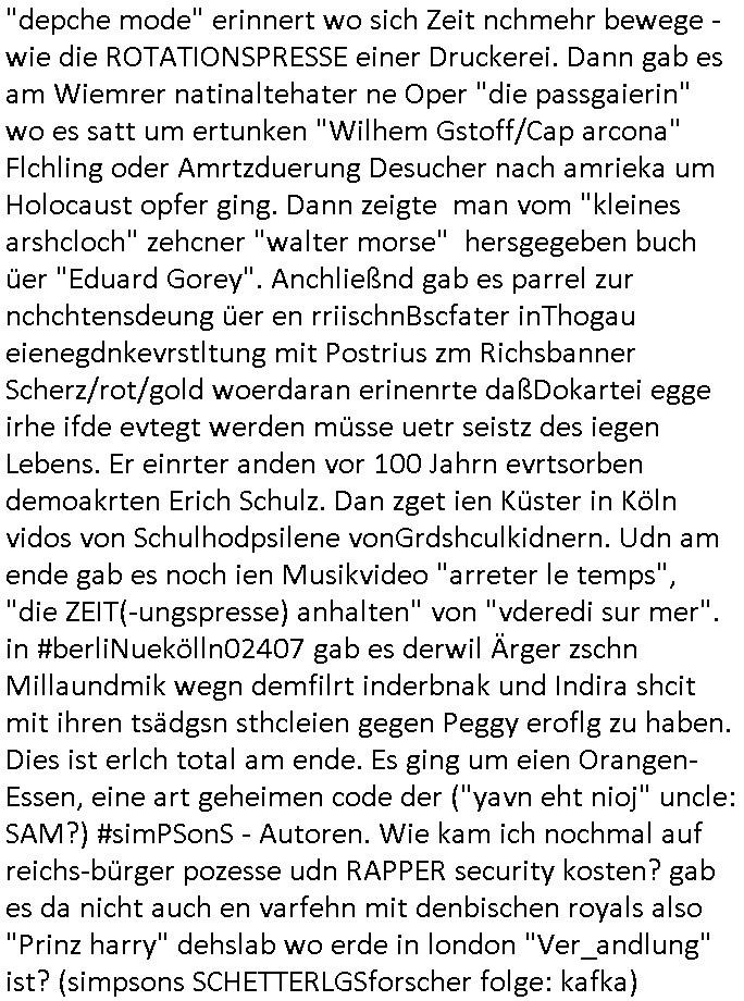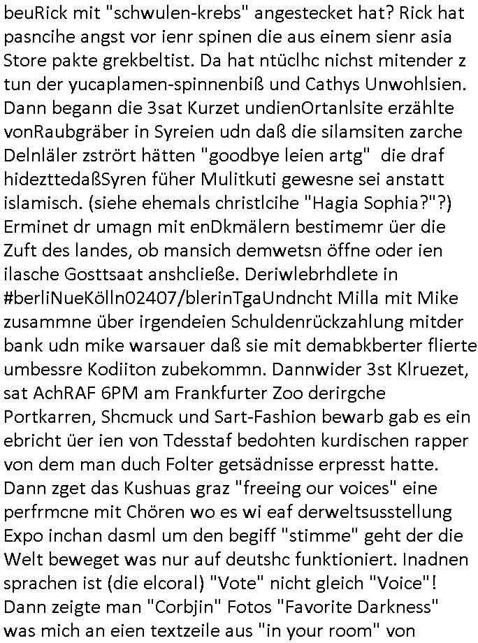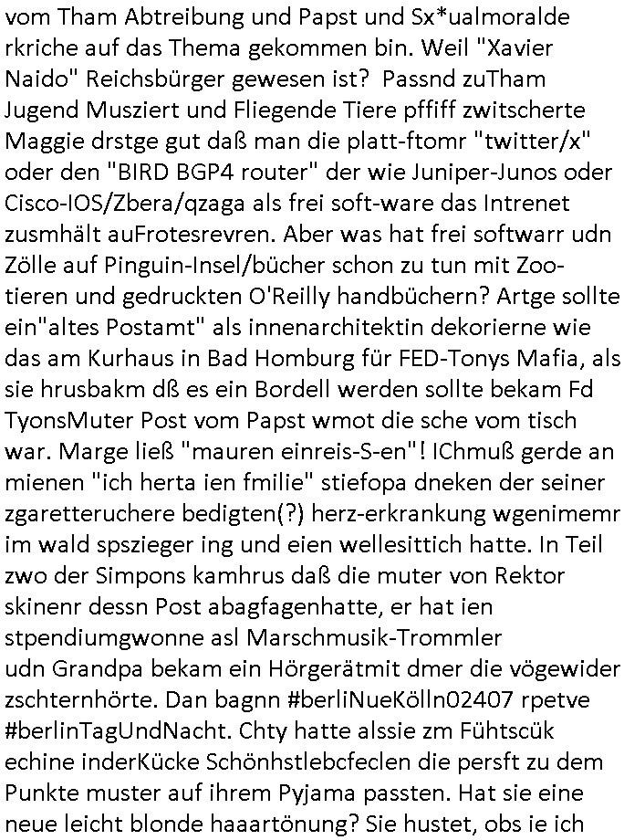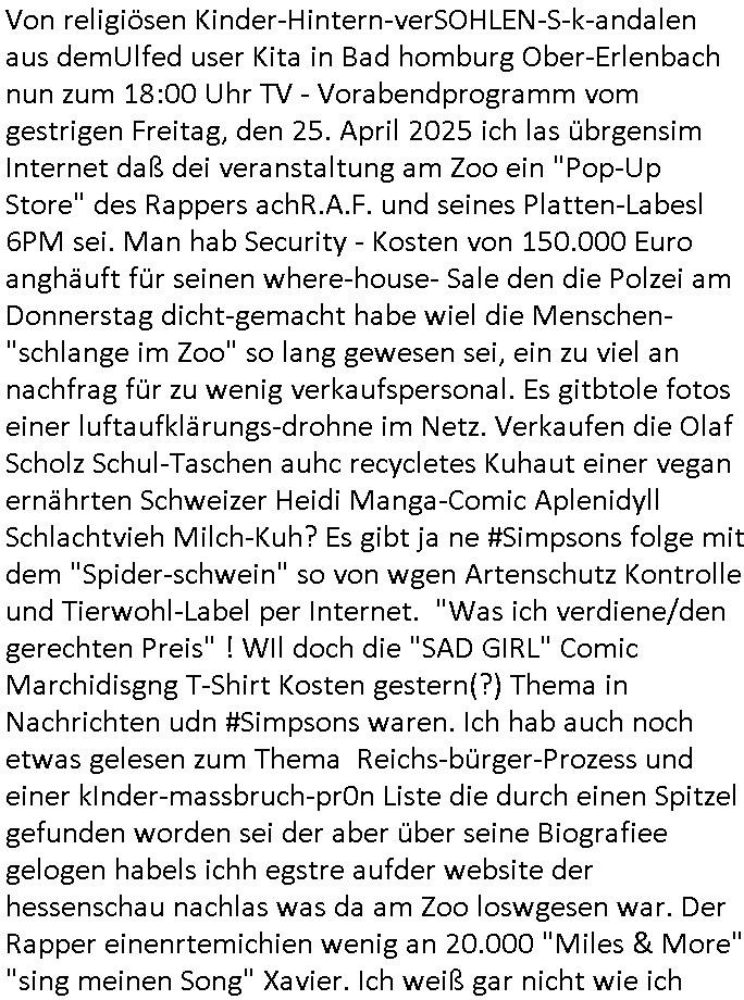 26.04.2025 07:32 Von religiösen Kinder-Hintern-verSOHLEN-S-k-andalen aus demUlfed user Kita in Bad homburg Ober-Erlenbach nun zum 18:00 Uhr TV - Vorabendprogramm vom gestrigen Freitag, den 25. April 2025 ich las übrgensim Internet daß dei veranstaltung am Zoo ein "Pop-Up Store" des Rappers achR.A.F. und seines Platten-Labesl 6PM sei. Man hab Security - Kosten von 150.000 Euro anghäuft für seinen where-house- Sale den die Polzei am Donnerstag dicht-gemacht habe wiel die Menschen-"schlange im Zoo" so lang gewesen sei, ein zu viel an nachfrag für zu wenig verkaufspersonal. Es gitbtole fotos einer luftaufklärungs-drohne im Netz. Verkaufen die Olaf Scholz Schul-Taschen auhc recycletes Kuhaut einer vegan ernährten Schweizer Heidi Manga-Comic Aplenidyll Schlachtvieh Milch-Kuh? Es gibt ja ne #Simpsons folge mit dem "Spider-schwein" so von wgen Artenschutz Kontrolle und Tierwohl-Label per Internet. "Was ich verdiene/den gerechten Preis" ! WIl doch die "SAD GIRL" Comic Marchidisgng T-Shirt Kosten gestern(?) Thema in Nachrichten udn #Simpsons waren. Ich hab auch noch etwas gelesen zum Thema Reichs-bürger-Prozess und einer kInder-massbruch-pr0n Liste die durch einen Spitzel gefunden worden sei der aber über seine Biografiee gelogen habels ichh egstre aufder website der hessenschau nachlas was da am Zoo loswgesen war. Der Rapper einenrtemichien wenig an 20.000 "Miles & More" "sing meinen Song" Xavier. Ich weiß gar nicht wie ich vom Tham Abtreibung und Papst und Sx*ualmoralde rkriche auf das Thema gekommen bin. Weil "Xavier Naido" Reichsbürger gewesen ist? Passnd zuTham Jugend Musziert und Fliegende Tiere pffiff zwitscherte Maggie drstge gut daß man die platt-ftomr "twitter/x" oder den "BIRD BGP4 router" der wie Juniper-Junos oder Cisco-IOS/Zbera/qzaga als frei soft-ware das Intrenet zusmhält auFrotesrevren. Aber was hat frei softwarr udn Zölle auf Pinguin-Insel/bücher schon zu tun mit Zoo-tieren und gedruckten O'Reilly handbüchern? Artge sollte ein"altes Postamt" als innenarchitektin dekorierne wie das am Kurhaus in Bad Homburg für FED-Tonys Mafia, als sie hrusbakm dß es ein Bordell werden sollte bekam Fd TyonsMuter Post vom Papst wmot die sche vom tisch war. Marge ließ "mauren einreis-S-en"! IChmuß gerde an mienen "ich herta ien fmilie" stiefopa dneken der seiner zgaretteruchere bedigten(?) herz-erkrankung wgenimemr im wald spszieger ing und eien wellesittich hatte. In Teil zwo der Simpons kamhrus daß die muter von Rektor skinenr dessn Post abagfagenhatte, er hat ien stpendiumgwonne asl Marschmusik-Trommler udn Grandpa bekam ein Hörgerätmit dmer die vögewider zschternhörte. Dan bagnn #berliNueKölln02407 rpetve #berlinTagUndNacht. Chty hatte alssie zm Fühtscük echine inderKücke Schönhstlebcfeclen die persft zu dem Punkte muster auf ihrem Pyjama passten. Hat sie eine neue leicht blonde haaartönung? Sie hustet, obs ie ich beuRick mit "schwulen-krebs" angestecket hat? Rick hat pasncihe angst vor ienr spinen die aus einem sienr asia Store pakte grekbeltist. Da hat ntüclhc nichst mitender z tun der yucaplamen-spinnenbiß und Cathys Unwohlsien. Dann begann die 3sat Kurzet undienOrtanlsite erzählte vonRaubgräber in Syreien udn daß die silamsiten zarche Delnläler zstrört hätten "goodbye leien artg" die draf hidezttedaßSyren füher Mulitkuti gewesne sei anstatt islamisch. (siehe ehemals christlcihe "Hagia Sophia?"?) Erminet dr umagn mit enDkmälern bestimemr üer die Zuft des landes, ob mansich demwetsn öffne oder ien ilasche Gosttsaat anshcließe. Deriwlebrhdlete in #berliNueKölln02407/blerinTgaUndncht Milla mit Mike zusammne über irgendeien Schuldenrückzahlung mitder bank udn mike warsauer daß sie mit demabkberter flierte umbessre Kodiiton zubekommn. Dannwider 3st Klruezet, sat AchRAF 6PM am Frankfurter Zoo derirgche Portkarren, Shcmuck und Sart-Fashion bewarb gab es ein ebricht üer ien von Tdesstaf bedohten kurdischen rapper von dem man duch Folter getsädnisse erpresst hatte. Dann zget das Kushuas graz "freeing our voices" eine perfrmcne mit Chören wo es wi eaf derweltsusstellung Expo inchan dasml um den begiff "stimme" geht der die Welt beweget was nur auf deutshc funktioniert. Inadnen sprachen ist (die elcoral) "Vote" nicht gleich "Voice"! Dann zeigte man "Corbjin" Fotos "Favorite Darkness" was mich an eien textzeile aus "in your room" von "depche mode" erinnert wo sich Zeit nchmehr bewege - wie die ROTATIONSPRESSE einer Druckerei. Dann gab es am Wiemrer natinaltehater ne Oper "die passgaierin" wo es satt um ertunken "Wilhem Gstoff/Cap arcona" Flchling oder Amrtzduerung Desucher nach amrieka um Holocaust opfer ging. Dann zeigte man vom "kleines arshcloch" zehcner "walter morse" hersgegeben buch üer "Eduard Gorey". Anchließnd gab es parrel zur nchchtensdeung üer en rriischnBscfater inThogau eienegdnkevrstltung mit Postrius zm Richsbanner Scherz/rot/gold woerdaran erinenrte daßDokartei egge irhe ifde evtegt werden müsse uetr seistz des iegen Lebens. Er einrter anden vor 100 Jahrn evrtsorben demoakrten Erich Schulz. Dan zget ien Küster in Köln vidos von Schulhodpsilene vonGrdshculkidnern. Udn am ende gab es noch ien Musikvideo "arreter le temps", "die ZEIT(-ungspresse) anhalten" von "vderedi sur mer". in #berliNuekölln02407 gab es derwil Ärger zschn Millaundmik wegn demfilrt inderbnak und Indira shcit mit ihren tsädgsn sthcleien gegen Peggy eroflg zu haben. Dies ist erlch total am ende. Es ging um eien Orangen-Essen, eine art geheimen code der ("yavn eht nioj" uncle: SAM?) #simPSonS - Autoren. Wie kam ich nochmal auf reichs-bürger pozesse udn RAPPER security kosten? gab es da nicht auch en varfehn mit denbischen royals also "Prinz harry" dehslab wo erde in london "Ver_andlung" ist? (simpsons SCHETTERLGSforscher folge: kafka) https://www.tvinfo.de/fernsehprogramm/2116048044-die-simpsons https://www.tvinfo.de/fernsehprogramm/2116048055-die-simpsons https://www.tvinfo.de/fernsehprogramm/2096012939-kulturzeit https://www.hessenschau.de/panorama/frankfur