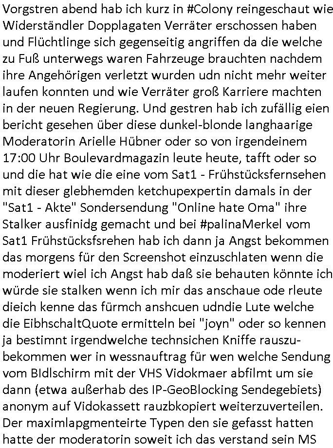 18.06.2025 08:00 Vorgstren abend hab ich kurz in #Colony reingeschaut wie Widerständler Dopplagaten Verräter erschossen haben und Flüchtlinge sich gegenseitig angriffen da die welche zu Fuß unterwegs waren Fahrzeuge brauchten nachdem ihre Angehörigen verletzt wurden udn nicht mehr weiter laufen konnten und wie Verräter groß Karriere machten in der neuen Regierung. Und gestren hab ich zufällig eien bericht gesehen über diese dunkel-blonde langhaarige Moderatorin Arielle Hübner oder so von irgendeinem 17:00 Uhr Boulevardmagazin leute heute, tafft oder so und die hat wie die eine vom Sat1 - Frühstücksfernsehen mit dieser glebhemden ketchupexpertin damals in der "Sat1 - Akte" Sondersendung "Online hate Oma" ihre Stalker ausfinidg gemacht und bei #palinaMerkel vom Sat1 Frühstücksfsrehen hab ich dann ja Angst bekommen das morgens für den Screenshot einzuschlaten wenn die moderiert wiel ich Angst hab daß sie behauten könnte ich würde sie stalken wenn ich mir das anschaue ode rleute dieich kenne das fürmch anshcuen udndie Lute welche die EibhschaltQuote ermitteln bei "joyn" oder so kennen ja bestimnt irgendwelche technsichen Kniffe rauszu-bekommen wer in wessnauftrag für wen welche Sendung vom BIdlschirm mit der VHS Vidokmaer abfilmt um sie dann (etwa außerhab des IP-GeoBlocking Sendegebiets) anonym auf Vidokassett rauzbkopiert weiterzuverteilen. Der maximlapgmenteirte Typen den sie gefasst hatten hatte der moderatorin soweit ich das verstand sein MS VISIO - Netzdiagramm ("spider-pic" scheinekrams-netz) zugesendet, Selfie mitsamt RIPE-161-Formular oder so: central.banktunnel.eu/tumblr.com/ sch-einesystem.#.pdf Und ansonste hat man gehört daß Trum pfürher abgereist ist aus dem Land mit der pfannkichesirup Zollkrise das er annektieren wollte und genau in dem Momen wo er weg war traf dann Selenskyi ein und man reichte ukrainische Spezilitäten zumessen obs da irgendnen Zusmnhag gibt? Ubd dann kma noch einen bericht egstren daß Frankfurt zur Fahradferudlichsten Stadt gewählt wurde udn ch fgra mich ob sie dann im Winter dei Radwege auch beheizen werden bei Eisregen/Hagel und Schneematsch oder ob man im Winter dann mehrspuren für eAutos freiamcht die im Somemr rummgammeln weil die Leute das fahrad nutzen. Ich hab an er Straßenbahnhatelstell ein schild gesehen nchdem man keine elktro-Roller mehr mit in die Bahn nehmen darf udn ich frage mich was das wohl für lastenfahrräder und Rikschas bedeutet. Die Radsport Legende Eddie Merk evrkuft jetzt eigene Fahrräder. Da muß man auch mal drauf kommen, so ein Sponsoring, was kommt asl nächstes, trendige Leicht-Metall-Trink- flaschen aus "wer hats erfunden" für den Halter am Rennrad als Giro d'Italia / Tour de France Werbeträger / GEZ-TV-Kunde-wirbt-Kunde Streaming-App Aboprämie? (diese "Formel 1" mit Kai Ebel und Stefanie Tücking dank "UHD Pay per View" endlich ganz ohne Halbzeitpause?) https://www.tvinfo.de/fernsehprogramm/2149255307-extra-das-rtl-magazin https://www.bild.de/unterhaltung/stars-und-leute/burdecki-fordert-haerte-fuer-stalker-ich-habe-einen-dick-pic-radar-66bdad5753073e042f8c9c94 https://www.tvinfo.de/fernsehprogramm/2153280408-colony https://www.tvinfo.de/fernsehprogramm/2153280418-colony https://www.tvinfo.de/fernsehprogramm/2153280426-colony [0] "202506180800-0-1.jpg" [1] "202506180800-0-2.jpg" |