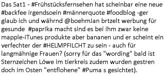 18.06.2025 09:30 Das Sat1 - #Frühstücksfernsehen hat scheinbar eine neue #backfee irgendsoein #männerquote #foodblog -ger glaub ich und währnd @boehmJan brtzelt werbung für gesunde #paprika macht sind es bei ihm zwar keine mapple-iTunes produkte aber bananen und er scheint ein verfechter der #HELMPFILCHT zu sein - auch für langmähnige Frauen? (sorry für das "wording" bald ist Sternzeichen Löwe im tierkreis zudem wurden gestren doch im Osten "entflohene" #Puma s gesichtet). https://de.wikipedia.org/wiki/Puma_(Sch%C3%BCtzenpanzer) [0] "202506180930-0-1.jpg" [1] "202506180930-0-2.jpg" |