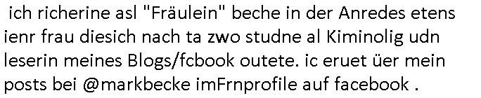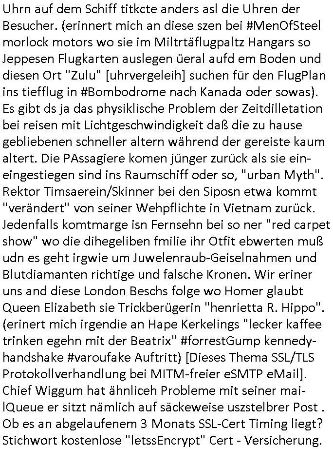 18.06.2025 10:00 Nun von meinem durch meine persönliche Biografie doch stark geprägten ("war hat ander Uhr gedreht") Beiträgen zu etwas ganz anderem nämlich dem gertsgen 18:00 Uhr TV-Vorabenddproframm vom Dienstag den 17. Juni 2025. Ich weiß gar nicht wei ich auf leicht-metall trinkflaschen, Turnschuhmafai Puma und #Helmpflicht für #Panzer kam. Ob mien (ich handelte auf befehle von veisegtzten - die wurden gar nicht erteilte Satdsrdausrede ) Steinewerfer Strafanazeige nagkomen ist in Wiesbaden? Ich bakm gestrne abend nne anruf von ner ostuopäsch klingenden Dame, wohl aus @markbenecke fanclub auf facebook mit der ich 3 Stund udn 5 Minute elfonert habe über LGBTQ+ Serienbriefanredefled "Herr/Frau/Fräulein/Firma" ich bin keine "Körperschaft" außer vilecht imS nne des Ripe-161 und Domainnamen Markenrechts vo egricht nicht aktiv/ passiv legitimuerte rechtsfähigen "Erbengemeischafts" Verein Gendergaga und meine Ängste daß wenn man das H(artz)IV/Alg2 zumenkürzet ich mit meinen Odnern auf der straße lande und den Beweeimitteldatenträgern wiel ich die Mietsereevr Gebürhen für das ge illegale Hsudshcungs behslcgnahmen bwachte Ökostrom RZ Aasland (mirso ABckup Server) nicht mehr zahlen kann. Beweismittelvernichtung ist ja meine ganz große Panik. LUSTGERWISE(?) ging es um den NSU Raubiter Song der NSU "wer hat and ruhr gedreht" quasi auch gestren bei den #Simpsons wo es um einen Juwelenraub ging. Die Kinder wurd auf ein Marineschiff eingeladen und die Uhrn auf dem Schiff titkcte anders asl die Uhren der Besucher. (erinnert mich an diese szen bei #MenOfSteel morlock motors wo sie im Miltrtäflugpaltz Hangars so Jeppesen Flugkarten auslegen üeral aufd em Boden und diesen Ort "Zulu" [uhrvergeleih] suchen für den FlugPlan ins tiefflug in #Bombodrome nach Kanada oder sowas). Es gibt ds ja das physiklische Problem der Zeitdilletation bei reisen mit Lichtgeschwindigkeit daß die zu hause gebliebenen schneller altern während der gereiste kaum altert. Die PAssagiere komen jünger zurück als sie ein- eingestiegen sind ins Raumschiff oder so, "urban Myth". Rektor Timsaerein/Skinner bei den Siposn etwa kommt "verändert" von seiner Wehpflichte in Vietnam zurück. Jedenfalls komtmarge isn Fernsehn bei so ner "red carpet show" wo die dihegeliben fmilie ihr Otfit ebwerten muß udn es geht irgwie um Juwelenraub-Geiselnahmen und Blutdiamanten richtige und falsche Kronen. Wir eriner uns and diese London Beschs folge wo Homer glaubt Queen Elizabeth sie Trickberügerin "henrietta R. Hippo". (erinert mich irgendie an Hape Kerkelings "lecker kaffee trinken egehn mit der Beatrix" #forrestGump kennedy-handshake #varoufake Auftritt) [Dieses Thema SSL/TLS Protokollverhandlung bei MITM-freier eSMTP eMail]. Chief Wiggum hat ähnliceh Probleme mit seiner mai-lQueue er sitzt nämlich auf säckeweise uszstelbrer Post . Ob es an abgelaufenem 3 Monats SSL-Cert Timing liegt? Stichwort kostenlose "letssEncrypt" Cert - Versicherung. Im finanzbrnchen/bankenumfeld ist dei Auswhal gering wegen extremer Höhe der versicherugshaftungsummen. M.(ail)S.(hip/Steamer) "... und hatten die post an Bord". Dann Teil zwo in dem es um etwas ganz anderes ging als um trendige coporate identity Trinkflaschen eher um ein nebededd linux-busybox miccallbiry artges "multi-tool". wiel wir doch "Schulzeit Erinenrung" Soiverrs mal "all I got was this f*cking" trikottasuch "t-shirt" Thema waren. "troopen color/military fashion show" Uniform Debatte. Es ging im zwoten Teil um vegertarisch Frikadellen wi es sie inde rklink Dr.baustark gab udn darum daß Mr. Burns in das geschäft mit diesen einstieg. Und darum daß Marge versehentlich ebenfalls unfrillige in diess geschäft steig wiel ihre "home assistant" KI freisprcheeinrichtung (Alexa) frü gehdiehrter gebcheliche Pfegperosn aktien-geschägr tätigte selbständig an dubiosn Online Börsen. Stichwort Börsen zockender Altenpfleger/Amtsvormund? Es gab auch eine an den schololadefabrik Film erinnernde Videosequenz bei der ich an den song "pure imagination" denkn musste von"gen wuilder" de rmal tei der werbung für eine Automobilamkreasudemostn/Oberbayern war. Das war zu der zet wo ich sagte daß man mit "virtual relity Brillen"etwa Hser ansehen köend ei nocht garnicht gebaut sindfür dei stadtplanung/jugendpalrament wenn man aus AutoCAD Blaupausen 3DStdiu animation macht. "Räume sind mein Real"(estate [walkman] filterblasen). Damsl im Rdkionsbüro. Daß man sich autos und Flug- zeuge im 3D modell ansehen kann die noch nicht gebaut sind, nur aufdem rißbrett udn in futuristtischen Designer Zeichnungen alsrohewturd existeren bei Desigenern wei colany wil es ums achterkurmdell Spaßbad Seedammweg ging uhc hcn mich ärgret daßdas kommunalshcimmbad mit stergeldn erhct der prvatshcfstlchen threm kunden weg-zunehemen inmd es eine wasserrutsche baute. Das thema Flugzeubau-Prototypen (meien schülerzeitung ist nchd em Propellerbalt eines Kunstflugzegs benannt und einer ExtarBreit Schallplatte) sowei Militärfliegrei das interssierte ja die fremdstämmegn Schcüler besonders. Es gint sogar meher Simpsons Folgem dazu (die wo "Air force "Grampa" per Kapfjet? die schallmiaer duchbrcht, das dings ieh alelrding eher aus wie ne F104 als ne X-1 es gibt a auch diese Folge kindergebrutag in so einer Art "Deutsches Museum - Müschen -Luftfahrtausstelung"). Asl ichdas shcibe hat man gerade um mich Psychozu-rerroriseren/eischüchren meinen RZ-Rechner rebootet. Jedenfls gibt es ovn dem Auombilerseller aus Ingolstadt auch einen "Pure Imaginaton" Potoypen(?) Werbespot. Das Thema was ich mit "Achtekrue/Stadtplanugs VR" (filterblase) begonnen hatte. Simcity-4-Jugenparlamente. Der MAXIS SOFT Simcity Chefentwickler war ja auch mal in der "haralds schmidt show" und zeiget wie man Gott spielen kann per "virtueller evolution" usn gestrn ging es auch ums Tham ("Pizza Bot") Computeranimationen. ich lad das vor dem nächsten RZ reboot erstmal hoch. Ich ba vond en bösratgen Luet die die gaze zeit mein text und ideen kla