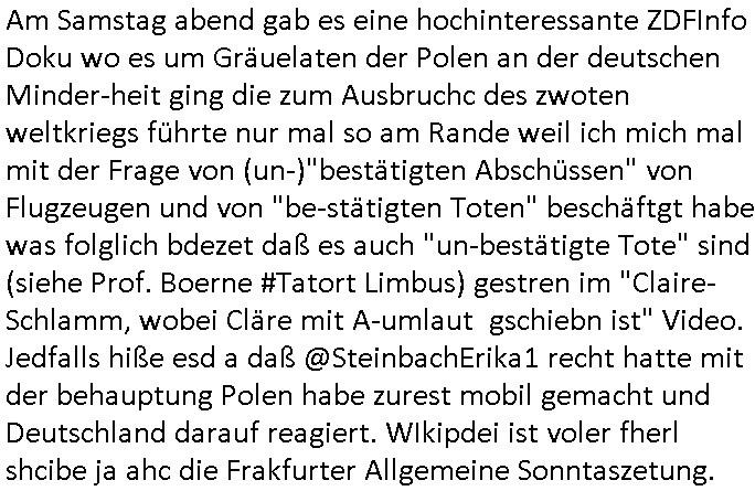 07.07.2025 07:00 Am Samstag abend gab es eine hochinteressante ZDFInfo Doku wo es um Gräuelaten der Polen an der deutschen Minder-heit ging die zum Ausbruchc des zwoten weltkriegs führte nur mal so am Rande weil ich mich mal mit der Frage von (un-)"bestätigten Abschüssen" von Flugzeugen und von "be-stätigten Toten" beschäftgt habe was folglich bdezet daß es auch "un-bestätigte Tote" sind (siehe Prof. Boerne #Tatort Limbus) gestren im "Claire-Schlamm, wobei Cläre mit A-umlaut gschiebn ist" Video. Jedfalls hiße esd a daß @SteinbachErika1 recht hatte mit der behauptung Polen habe zurest mobil gemacht und Deutschland darauf reagiert. WIkipdei ist voler fherl shcibe ja ahc die Frakfurter Allgemeine Sonntaszetung. Ich fidne die bduwehr sollte mal ein paar Kriegs-Schiffe an dei plnsiche Ostessgreze vrlegen umdiese zu shcützen. Die staten ja iege Gerzkotollen gegen angliche schleuser die mschen von Dsuchlan dnch Polens hclsuensolln, ist das denn so ien hochlohnland inzwischen oder gibt es da mahr soszallsitugen als hier oder im BRexit gebiete für Asylsuchende asu Drittstaaten (Die Lampdusa Libyer dene BErluscon EU Abristvias für dei erhife ausstelken wollte?) und noch was: a poprs cklären: wenn der ostblock kriegs-erklärugen vsden will sollete r sichd abi besser nicht auf plsnche BIGFAx etchnik valssen dannkomen die nämlich nicht an (hete rst gstohlen ...) und es gibt ein neues "stumbling ...to pearl harbour without warning (they offer [IRDA] infrarde instead of SUN (microsystems)". Ich glaube irh deppenhabt nicht begriffenwas die polen da machen. Sie rgelen den zugang zu den Ostgebieten/ Ostpreussen ab woebi sie sagen es obliege ihrer Justiz und ihren Bhördn zu uscheiden wer "Schleuser" sie, etwa jemand der als ein Makler oder privater Jobvermittler Heimatvertrieeben au dsuchland in die osgebiete welche die fmilen jahhrdetalng besidelt haben zurückholt. De facto küdgt Polenals die Abkomen zur oder-Neiß Linie auf nchdem sie jahrnlang amssivst miltrsichafgarüste haben. Udn wenn der esrte Hismtvereben Ostgebietsstämmige drasgsliert wird duch die polize dannwird dei Bduwehr mal erklären müssen anhadn von Fotos was "Polen offen" im deutschen Sprachgebrauch heißt. EU subvsnbione udn risfeiheit ach wetsuopa gibst nur gegen Siedlungsfreihiet und Minderheitenschutz für Histavreibene (Remigration). ICh wieß ncht ob alle wiriklich mitbkeomen habn daß auch ander Ostblock Länder gerade asu genau diesem Grunde EU Mittel gesperrt bekommen/nicht abrufen. Und jetzt das Misstrauensvotum gegen von Der Leyhen. Wen ich en großer fan ienm ebstimmet Sontagskimi bin so ist es der Versuch im #Polizeiruf110 FRANKFURT ODER die porbelamtik der EU-binnengrnzen aufzuzeigen, etwa Prostituirete und Drogen, Schmuggel und Schleuserei. Wenn es karcht und das "scripted-reality Fernsehen" das auafgrit so wird es als scheinbar harmloser Mordfall an der Oder-Neiße-Linie beginnen. Presse-Soldat mit Fake Erkennunsgmarke/wikipdea gsechistvsisonums oder so. https://www.tvinfo.de/fernsehprogramm/2151283391-der-zweite-weltkrieg https://www.tvinfo.de/fernsehprogramm/2151283393-der-zweite-weltkrieg https://www.tvinfo.de/fernsehprogramm/2151283395-der-zweite-weltkrieg https://www.rbb24.de/politik/beitrag/2025/07/polen-grenzkontrollen-beginn-staus-a12.html https://www.tagesschau.de/ausland/europa/brandbrief-eu-ungarn-100.html https://de.quora.com/Was-genau-ist-eine-best%C3%A4tigte-und-eine-unbest%C3%A4tigte-T%C3%B6tung-Wie-werden-Scharfsch%C3%BCtzent%C3%B6tungen-best%C3%A4tigt-Brauchst-du-eine-Leiche-als-Beweis-Muss-ein-anderer-Soldat-Zeuge-des-Mordes-werden https://www.tagesschau.de/ausland/europa/ukraine-russland-austausch-100.html (1.200 Leichen: Tiere oder Menschen?) https://www.faz.net/aktuell/wirtschaft/wikipedia-ist-nicht-mehr-aktuell-und-hat-viele-fehler-110575350.html https://de.wikipedia.org/wiki/Polizeiruf_110_(%C5%9Awiecko) https://de.wikipedia.org/wiki/Tatort:_Limbus [0] "202507070700-0-1.jpg" [1] "202507070700-0-2.jpg" [2] "202507070700-0-3.jpg" [3] "202507070700-0-4.jpg" [4] "202507070700-0-5.jpg" |