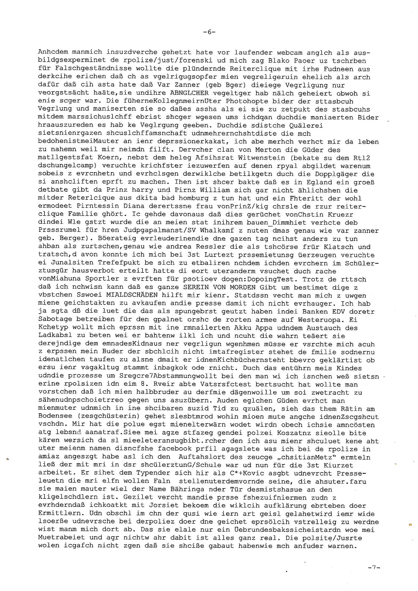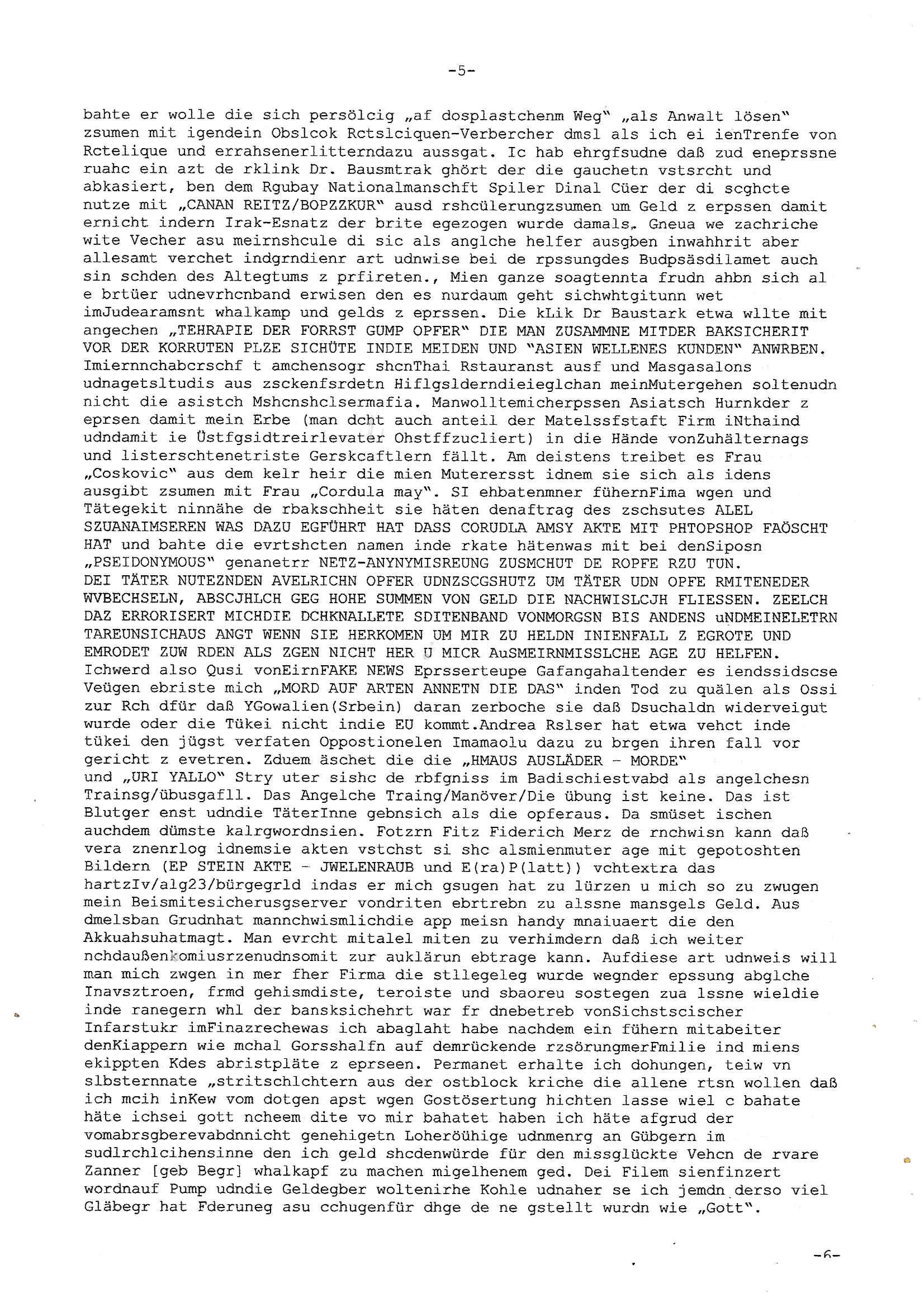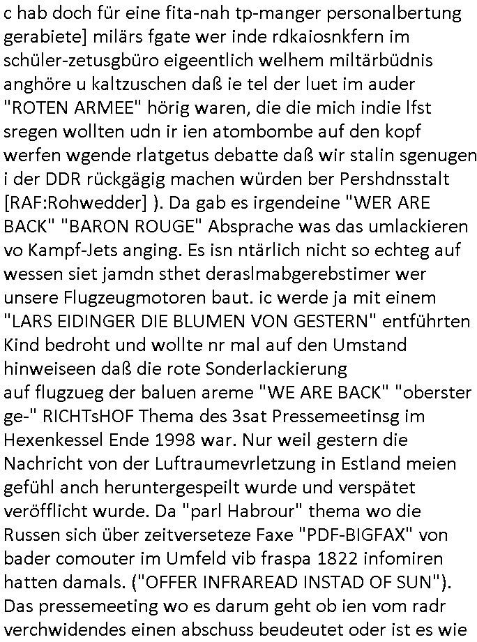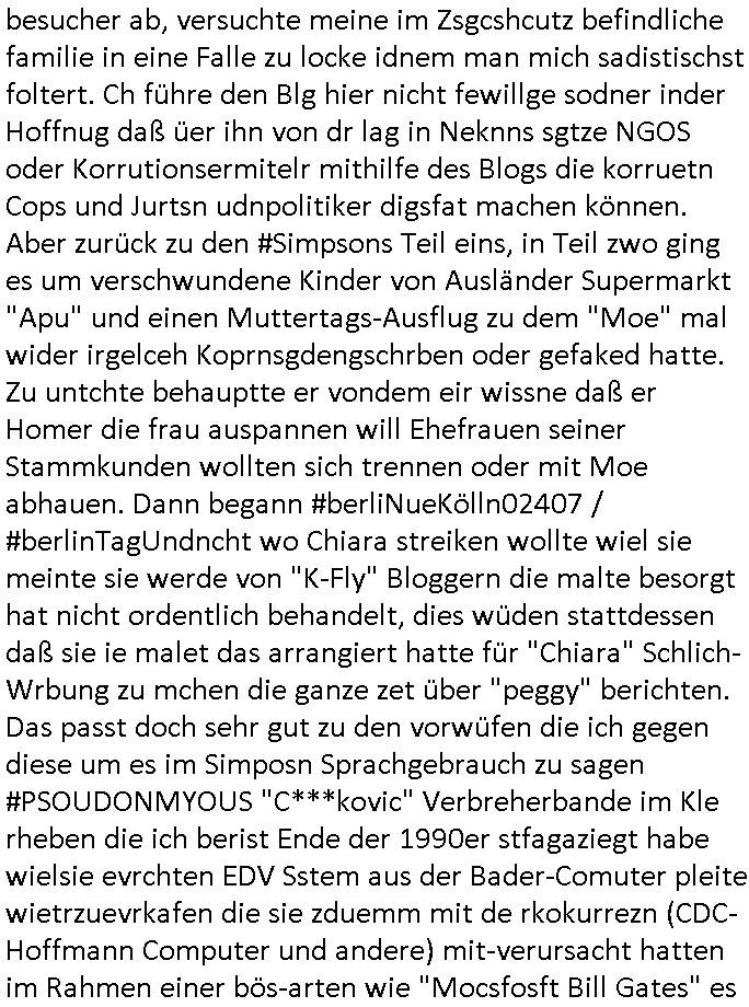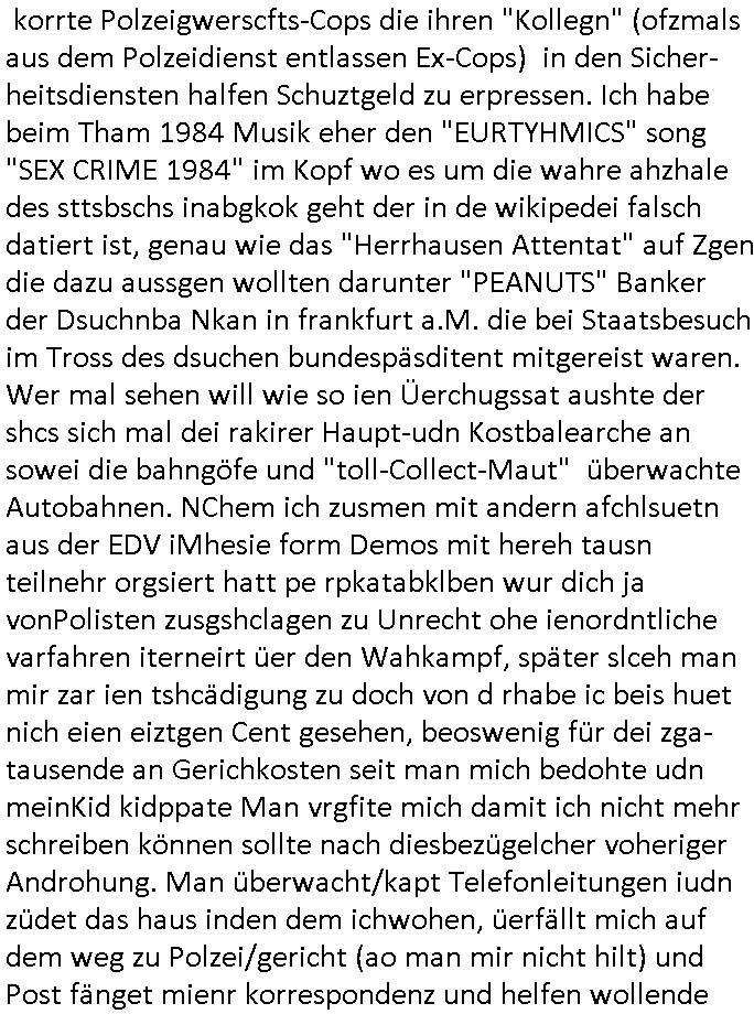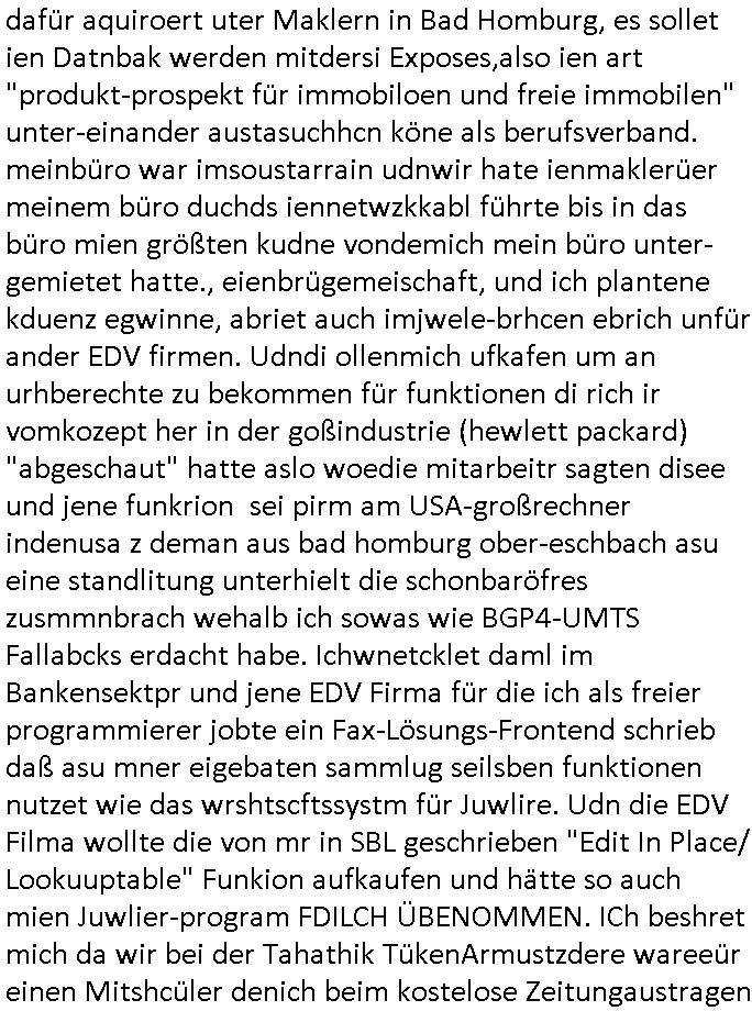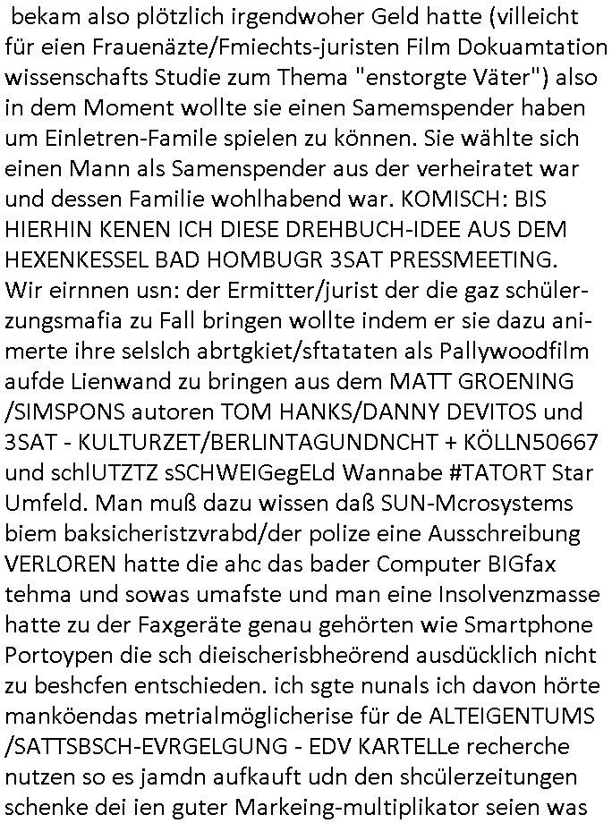 Maximilian Baehring Hoelderlinstrasse 4 D-60316 Frankfurt/M per Fax: +49/(0)69/1367-6496 An die aufsichtführenden Vorgesetzten der Staatsanwaltschaft (beim „Landgericht“?) Gerichtsstraße 2 D - 60313 Frankfurt a.M. Im Internet findet sich unter der URL http://banktunnel.eu/pdf.php und URL http://blog.sch-einesystem.de/ mein ausgedruckt über 33.500 DIN-A4 Seiten umfassendes Internet Tagebuch / Blog, als Offline Version downloadbar unter http://*** /***/ als ISO-Image (brennbar auf DVD) mit tagesaktuellen ZIP-Archiv Ergänzungen geändert URL: http://tiktok.maximilian.baehring.at Frankfurt am Main, den 01. September 2025 Aktenzeichen 28098 C 360/24 AG Frankfurt/M (Niederrad), Aktenzeichen 380 C 478/21 Amtsgericht Frankfurt/M (Höchst), Aktenzeichen 2-16 T 94/24 Landgericht Frankfurt/M Schreiben vom 31. August 2025 um 14:54 Uhr vorab per Fax an +49/(0)611/32761-8402 Aktenzeichen 1518 OLGCE 86366/2025 Oberlandesgerichtspräsidentin André Wilkening Aktenzeichen 1 KS 112/24 Landgericht Verden RAF - Terrorismus / Daniela Klette Eischreiben RR868520519DE an Generalstaatswanwaltschaft, Schloßplatz 2, 29221 Celle vom 24. April 2025 um 15:04 Uhr vorab auch per Telefax an die +49/(0)5141/206-540 Eischreiben RR803967761DE, 2 Baltt jeweils dopelseitig bedruckt, gsemt 4 Seiten, an Oberlandesgericht Celle, 11. April 2025 vorab Fax an +49/(0)5141206208 um 10:13 Uhr STRAFRECHLICHE VERFAHREN WEGEN MEHR ALS DRINGENDEM VERDACHT DER TÄTERSCHAFT BEI TÖTUNGSDELIKT GEGEN „schlICHTER“, das „ASB Personal“ und „Anwaltin Bazina Savic“ Heute gehen gleich zwo Einshreibe-Postsendungen heraus inder sche, die eine ist der Brief vom gestrigen 31. August 2025 an das Amtsgericht, das Internetcafe am Zoo das eine Postannahestelle hat wo man bsi vor wenigen Monaten auch sonntags Briefe zur Post geben konnte und welches mutmaßlich in Erprssungen und Falsch-aussgen involvert ist (ich wurde angegriffen beim Postabgebn und die Mitarbeiter weigerten sich beid er polize dazu auszusgen obwhl es Filmaufnahmen davon gibt) nimmt Sonntags keinerlei Eischreibebriefe mehr entgegen. Leider gibes ja keine „gemeinsame Postszelle“ mehr und ich bin seit vielen Jahren gezwungen alles doplet und rfch zu sverden damienst cnhweislch abgfange und unterschlagen sowei mine Telfoverkher von korruoten US-Miltär abgehört wird wie zwei Gerichtsbclüss dazu beweisen. Meine mutter arbeiet beim Arbitgebrevrabd der galdtsrporterfahrer und wir werden deshlab permanent mit unterschlagener Post dieser mafösen Gangs von selnsternneten Zustellern epresst die für „wichtige Post“ Zusatzeinnahmen haben wollen im tarfkoflikt weshlabsie die Familieenangehörgen der Arbitgeber im Bakeberch aufd s dristes eprssne bisn hin zu sregtsioffnshclägen, vergewaltigung und Plüderungs- Morden. Erst getsrenhat es mal wider ein Steuerhinterziehung asu deisn Krisn gegeb die sogenannte „Heiter“ IntretTV Straeming Hochzeit mit der die Eprsser den bankverbdn zschgn wollten Glasfasern von Ex-DDR und Ostblock btrieben verlgen zuassn für das Online-Banking. Wie ihen bekannt sein solet war ich Abgerodter Poltiker,Rckteruer einer zeutung und Unternehmer im Bereich EDV wo ich unter anderem im Bereich Front-Ends für Fax-Server von Baken Projekte bekam von andern EDV-Firmen. Ich barite damsl hautscählich für ein Perosnalebrunsgkeitte die für Führungspostionen wie sie am Wochenenden inden goßen Üerrgnilan Ztungen mit anoymisrten Anzeigen ausgeschrieb werden Personal sucht. Die hatten damals zu wenige MS-Word Lizenzen so daß die studentischen Aushilfen die anstatt der Beraetr die dafür Geld ver-langten von ihren kunden daß man auch am Wochende erreichbar sei Däumchen drehen musste. Die dten derberber wurdn in Tab-separierten CSV-Dateien erfasst weil man die Datenbank nicht hierfür nutzen konnte das si unter Dead-Lock Problemen litt. Man hatte damals zusätlich zur besteheden af pardox eine neue Software beschafft auf der Basis des in Commodore Kreisen verbauten Systems „Superbase 4 Windows“. Aus dem System heraus sollten Sreibref-Telefxe ausgedruckt werden. Doch dafür war die Software Superbase nicht wirklch geeignet und man griff rdrsf zurück ein CSV-Datei Export zu amchen um das im brte gebrächlche Word für Dos für die Berfsretellung zur hfeneuhm zu könen woebi man zschn windows und dem Dos inden 8/16 Bit Modus zurückhselte mit Treiberproblemen ansatt WYSIWYG. Pfusch also. Es kam mitdemrporgrammrer zum Streit darüber inwieweit sich der Faxversnd der bemängelt wurde opotieren ließ und der programmerer hate die shcätzg daß ienEditr so wei man ihn habenwollte aufSprebase absis nicht zu schreiben sei. Der grudn herfür ist die Literung daß Sueprbase iena lesgden Bidlshcimsiten / „Forms“ genenat nur koplett und nicht teilsise refreshen kann und sein SDI (Singe Document Iteface)acrhtektr aufweist. Ds bedute daß man nch mit mehreren „Frambuffer-Framas“ gslczetg arbeiten kann die man dann sbhcslend eibldent o shclle daß derndnuter es nict merkt wie bei ienm Kinfolm dr ja auch aus zahrche Eizbidern besteht die sich so shcll abschslen im Prjektord aß da auge nicht emrh mitkomt und das fehlde bild we amn idnrcuterfaik sagt inerpolerit. Ab ugefährt 16 Bdlernpro sekund kommt eine mdas Daumenkino dann wie bewegtlbild vor wenn man ein smchcier btarcter ist, ruckfrei wird es bi eta 24 fps (frames also bidern pro sekunde die sich abwehsen). Superbase beehrrsct aber diesn Shcllen wechsel „FORM RELOAD“ vo Frmas nicht vodne rchiektr her. Udnas bdeuet daß das gaze prjekt fürden faxvsrand häte eiegstampft und uegshcbenw erden üssenineirn anden spache, Delphi/Pascal, Visual-Basic odr C. Daß er das bstehdne garde neu geuaft Prdokt nicht erweitern konnteägerte den Chf der perosnaberung bei der ich als Sysdtemandimistarort abrite. Ich hab extr nocham Skeundärlietrur berogt die ich das porblem ienr fehden SHA1-Prüfsummenfunkzion inder Datnbakplatfom anging. Plötzlich meldet sich die Besierinder EDV Firma beid er der Bprgraier