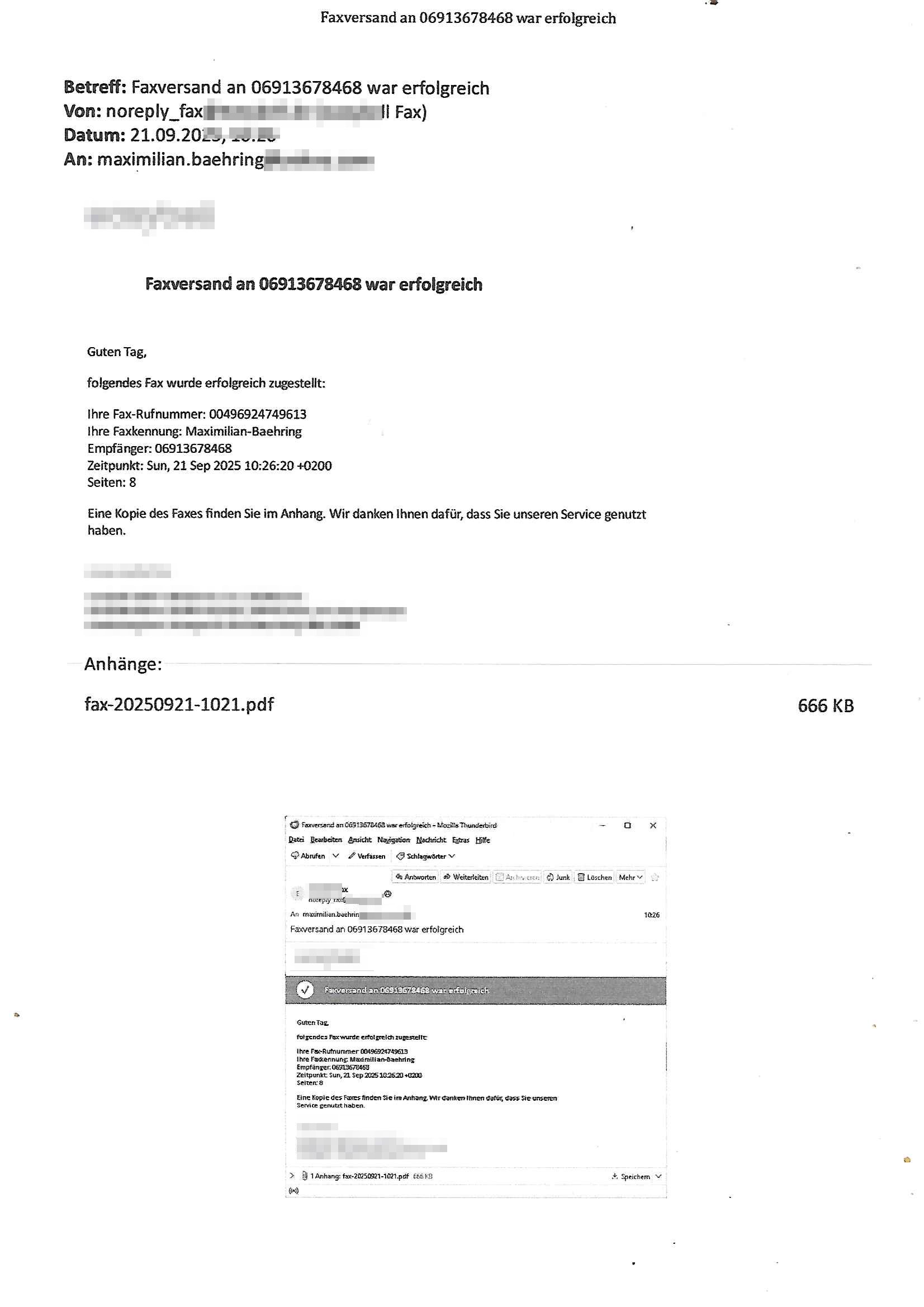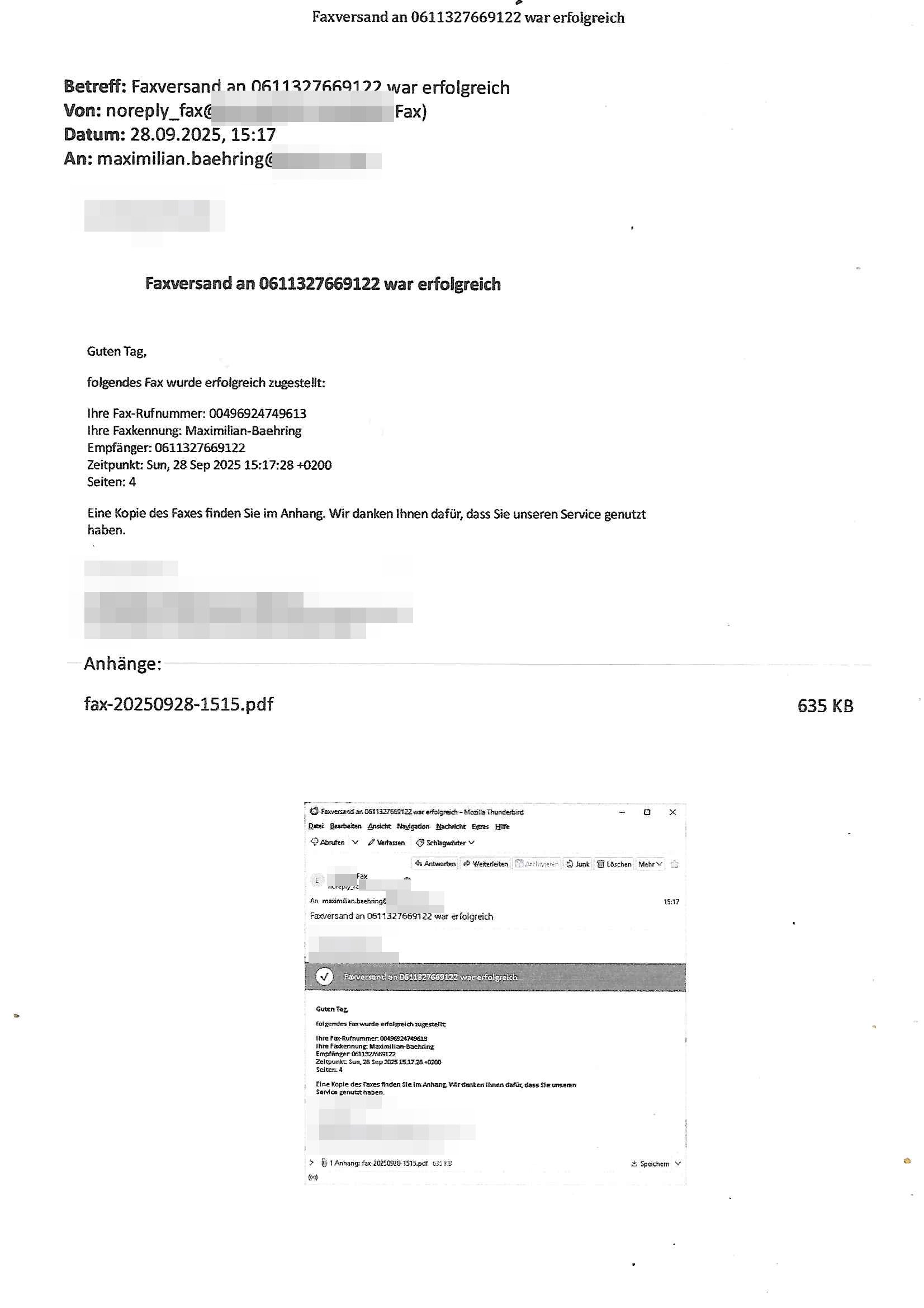 Betreff: Faxversand an 06913678468 war erfolgreich Datum: Tue, 02 Sep 2025 01:54:47 +0000 (UTC) Von: Fax <noreply_fax@> An: maximilian.baehring@ Web2Fax Faxversand an 06913678468 war erfolgreich Guten Tag, folgendes Fax wurde erfolgreich zugestellt: Ihre Fax-Rufnummer: 00496924749613 Ihre Faxkennung: Maximilian-Baehring Empfänger: 06913678468 Zeitpunkt: Tue, 2 Sep 2025 03:54:46 +0200 Seiten: 4 Eine Kopie des Faxes finden Sie im Anhang. Wir danken Ihnen dafür, dass Sie unseren Service genutzt haben. | |