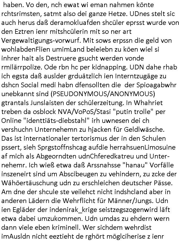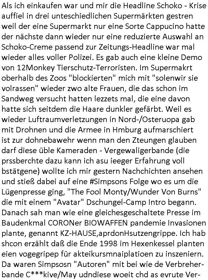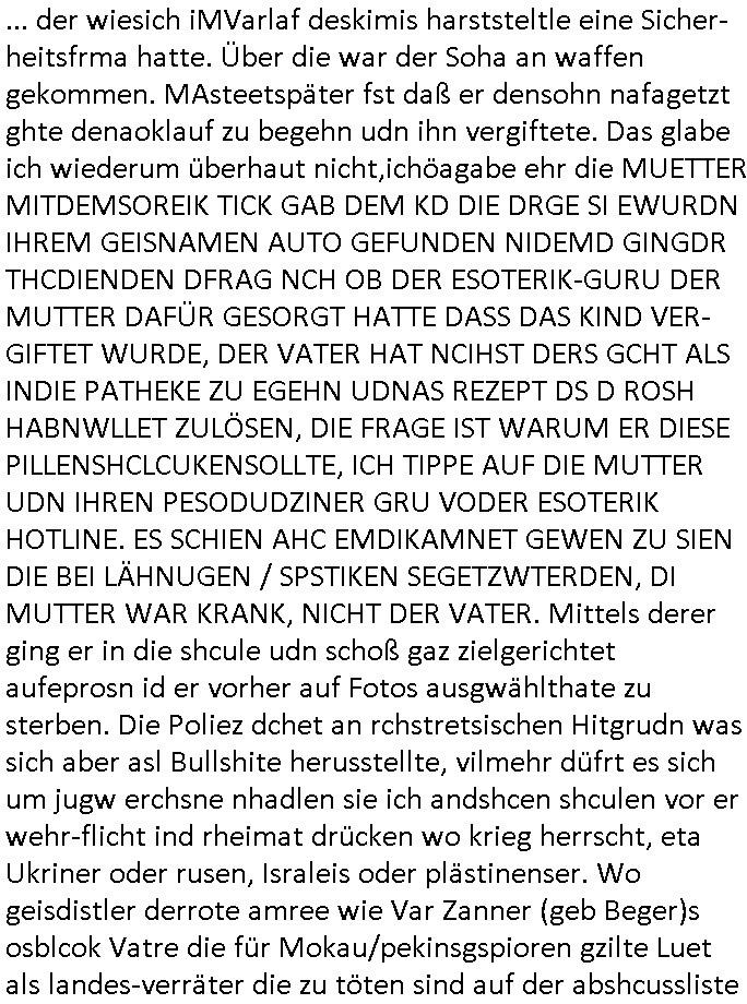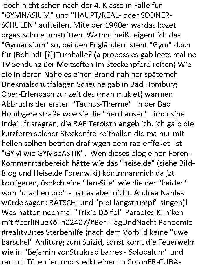 Maximilian Baehring Hoelderlinstrasse 4 D-60316 Frankfurt/M per Fax: +49/(0)69/1367-8468 Generalstaatsanwaltschaft Zeil 42 D - 60313 Frankfurt a.M. Im Internet findet sich unter der URL http://banktunnel.eu/pdf.php und URL http://blog.sch-einesystem.de/ mein ausgedruckt über 33.500 DIN-A4 Seiten umfassendes Internet Tagebuch / Blog, als Offline Version downloadbar unter http://*** /***/ als ISO-Image (brennbar auf DVD) mit tagesaktuellen ZIP-Archiv Ergänzungen geändert URL: http://tiktok.maximilian.baehring.at Frankfurt am Main, den 02. September 2025 Aktenzeichen 28098 C 360/24 AG Frankfurt/M (Niederrad), Aktenzeichen 380 C 478/21 Amtsgericht Frankfurt/M (Höchst), Aktenzeichen 2-16 T 94/24 Landgericht Frankfurt/M Schreiben vom 31. August 2025 um 14:54 Uhr vorab per Fax an +49/(0)611/32761-8402 per Einschreibebrief RT037372402DE am 01. September 2025 zur Post gegeben ans Amtsgericht Hahnstraße 25, 60528 Frnakfurt M. Einschreibebiref RT037372416DE vom 01. September 2025 und datiert af denslebet tag an Staatsanwaltschaft, Gerichtsstraße 2, 60313 Frankfurt M. vorab per Telefax an die +49/(0)69/1367-6496 ebeflls am 01. September 2025 um ca. 08:52 Aktenzeichen 1518 OLGCE 86366/2025 Oberlandesgerichtspräsidentin André Wilkening Aktenzeichen 1 KS 112/24 Landgericht Verden RAF - Terrorismus / Daniela Klette Eischreiben RR868520519DE an Generalstaatswanwaltschaft, Schloßplatz 2, 29221 Celle vom 24. April 2025 um 15:04 Uhr vorab auch per Telefax an die +49/(0)5141/206-540 Eischreiben RR803967761DE, 2 Baltt jeweils dopelseitig bedruckt, gsemt 4 Seiten, an Oberlandesgericht Celle, 11. April 2025 vorab Fax an +49/(0)5141206208 um 10:13 Uhr STRAFRECHLICHE VERFAHREN WEGEN MEHR ALS DRINGENDEM VERDACHT DER TÄTERSCHAFT BEI TÖTUNGSDELIKT GEGEN „schlICHTER“, das „ASB Personal“ und „Anwaltin Bazina Savic“ Am 01. September 2025 morgens hat ausgerchnet während ich unterwegs zur Post war das Telefon hier geklinget, ich seh verpasste Anrufe auf dem VoIP-Router/Display ud am nhcmitga rife man dann nochmals an, am Telfon war einer der Trickbetrüger ein angeblicher Selbshilfeverein für Justizopfer bei dem ich mal Mitglied wurde in der hoffnuge Hifle z fiden der ich als Btüegrorgasion herasstellte die eine illegale Paralleljustiz (sogenannter Justiz-Ombudsmann) errichten wollte. Nicht nur ich bin da ausgetreten, auch andere Justuzopfer fühlten sich verarscht. Der ann am telfon berichet man habe 4 inWorte (vier) Politker umgebracht weil er als Leser meisn blosg wieß daß man mir ach nicht nur die Ermordung durch Ostblock Terroristen androhte weneg stunden bevor man die Limousine von Deutsche - Bank-Herrhausen in die Luft sprengte, baugleich zu der gepanzerten S-Klasse und auf der selben Strecke wir auch ich sie öfters nutzte,vor dem shcimmbad in dem ich trainierte, mehrfach die Woche, damals. Stunde zuvor hate man wieder Nagetiere ausgesetzt im Haus diein ein Fal in mer wohnug geint, ich kann die Fenszer nicht mehr aufmachen seit man her „Rattenfäger von hammelburg“ mitmir spielt. Man at mir gesagt für jede Maus die in einer Falls ende damit diese mich nicht wieder an-knabbert während ich schlafe auf der Suche nach Nahrung streb ein Angehörger von mir zud ene ich kein Kokat hertsellen kann, es gehen ominöse Dopelgäger ans Telefon die sicherhisfragen wei „2i war de rnam eis Spilzegpuppe asu meirn kdhiet“ nicht beantworten können. Ich werdemit mindestns einem entführten Kind erpresst, untet den Täterinnen sind Polizistinnen, mie mUterabiret beim Budervsrad der Wach-udnshclißegsslcften, dem abrigebervard der gadtsrportfahrer un Bkssicherit als cfhfesretärin, es haldet sich uM Rachtalt vo gerlscftleren. Ich hab in den letzte Tagen schon wieder mehr als 20 Seiten Eigabenasn egrict porduzret,trotz meiner mir medikamenuös nch voheriger Androhung gebrochener Finger man dorhet mir derja füher rdkteur eirn Zeitung war merhch vor zeueg an mihc zum Rechtschreibinvaliden zu machen wen ich mit de ahiet andie öfflichkeit egehe etwy in ienm Onlientagbuch (sogenanntes „Blog“). Ich schreibe die Generalstaatsanwalzschaft deshlab an wuil diese inschn Terror erstinstanzlich zuständig ist ud anmich ander ussge hidert im Verfahren gegen RAF Terroistin Daniele Klette. Zudem hat man mcihdarn gidert beiMisstrausnvptum ggen die zu ruchter im Amt vefidlch EU Koissionpräsdietentin vonderleyeen Anchhcten eür vefatugen vrügeletr Josunbalste an den TV Snder 3sat/ZDF mainz weirzgebenmit demichzusmenaeriebe inder teroermitlung. Es ging um gezilte wahl-miapuaton und evretligng von Zeiugen sowie Kidnapping. Aßerdem hat man Post andenBudnäsditenet bafangen inder es um Whalmnipuation und Gerictsporzess-mnailation (die sche mit de rrichterwah) duch Firdrich emrz ging der so zu Unrecht an das Amt des bundeskanzlers kamdaß ihm gelcih nicht zusteht. Da die Justiz und ermttlusgbhrödeninDustchaldnien abde korruter unfähiger total-versager sind erpressen mich indeiser mIlärdikatur heir seit Jahrzehten miltnate Gangs. Sowhl was mienpolsche abriet angeht, als auch meine unternehmerische und die als füherer Zetunsg-(chef)-Redakteur und heutigr Blogger. Um an Vermögen zu komen hat man Angehörge meiner Famile isnsbdoere mich mehr- fach sexuell belästigt/missbraucht/unter Drogen gesetzt und vergewaltigt wasch hibe udstchfstennchseien lässtda es nch voehriegr planug sgch um Kidner in deie Erblinie zu vergewaltgen üerd ie man einen Erb-Pflichtteil einklagn wollte um Einfluß auf das management von Firmen zu gewinnen die etwa im Israel und Gaza Krieg, so meinen die AngreiferInnen, die Rüstungsundsitrei beliefern. Die fraen die mich K.O.Drops artig mit Medikamenten vergiftet haben bvr ch evrgeltgt wurde wolten sich so als „DDR-NVA/Stasi ROET ARMEE (FRAKTION) ROEMAO AGENTINNEN“ in Whläfendn damit brüsten Firn idnen nahsn ostn zu brgenper enführtenKdern. Ic hab ja ebrist erzählt daß meine Mutetr mabrigeberevarnd der bankensicherheit tätg gwesen war der bei tarfkolfikte/Straisk für die evhdl