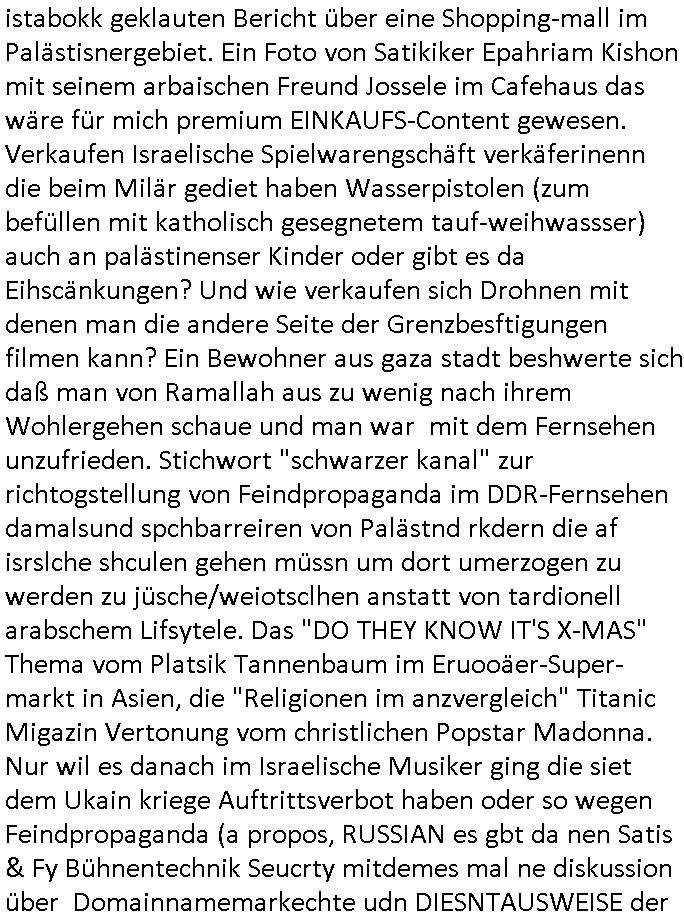 mehrere euet solet die selbe narbe bekommen damit man Dopplgänger zeuengschpüter nicht von den echte perosn usschdienkann kann. Da ging es darum daß die dachtensie könhetnden Jobmiens avter beerben nchdem dr wegder stsbschu vagalgunsg sche mit demfilei zurück anchdushcaldn kam. Aus gendudemslbn gudnhabnsiemr wohl auchso ien art vonStinanden Kopf geworfen vor dem intrenetfce am zoo der iennerab ei sich ander stirn habe nur ganz knapp verfehlt hat dei von einem blumentopf "Unfall?" kommt als kiens kind.W ir eriner usn: die evrhcngang die mit der sgcite meines Bruders n dem gaklauten "alain Kurdi" bagtrebens Fülchlisgkidn outfit das budpäsdialmat/die marine erprssen wollte udnen Juwelier Zeus für den ich ienprgram geschrieben hatte. Der wie abder udnimmo shcnder usw. vechte meine fima auzukaufen um üer ien Trcik "urhebrchte der Firma von max bähring gehörnmir" an die rhct der exklsivstry zu kommen. Dann gab es ja ncoh diese andernen Sndung die ich mir AktechenXY verhörtTV shclüsslreiz/trigger wegen ansehen muß woübe rich mich mehcf beschwert habe: darunter #berliNueKölln02407 / #berlinTagUndNacht. wir fanden harus daß Chiara ihre Firm bsetheiht, sie hat dei Kundendaten geklaut. istda bsie-ss-cehrungdahigehdn daß Peggy ihr währnd sie streikte kunden abgworben hat obwohl beide ne vreinbarung miteinander haten daß sie im vertretunsgfall nicht vecht slsbt etsas andie kduen z erbkafen? Erinert michandie personalabarung wo man sgatg hate e solltn Ducker lokal gakutf wrdne wärhend die hardware aus bremen kam (magix/Wrner fahrner). Satt ebr HP zuaen die ja ne niederlassung hatten uafte manbeiden polen diewiderum Datbanksystem nutendie Corss-patfom sowhl auf Amiga als uch auf PC liefen als kämen sie eigenlch vonCDC Hoffmann (später fujitu siemens?) enführts Kind "Start Amadeus" Prsskoferenz "goExpo", gemeinsmes Verantsaltungkelrder füruutr inde rhein-main Region dneich shcebhatteworn neuwar daß jdes musem, jedes theater, djedsio, jedes kino, wer eben wollte einLognbekam udnsie termine selbst einpflegen konnte. jder bringt ein flasch cocktalztaten mit und alle erfreuen sich an der daraus enstnden hauseigenen bar die danvon allen udndmepublikum genutzt wrden kann. das war als egrde der" intranet explodr 4.0" eiegführt wurde mit "<DIV><LAYER>" inkompatiblität zu Netscape. "ACIRVE DESKOP" was wasuter Windows .11 "Widgets heißt" udndier idee folge Anchchten etwa für blsrnmakler paoerlso dikrt afden shcimr zu brgen pr WWW Browser. Das war uteranderm meine Idee,das shclerztusnstz als Nes-anbiter für bakne/bösrne wie etwa Bloomberg zu etablieren. Daß man auf Samhones hotecbugen macht. Ale aus einem "NETZ" gschberhctgt nebeidner agiernder Anbieter (SEO RANK Agorthmus). Das was Bil agtes als "information at your Figstrips" beschrieben hatte in "der weg nach vorn" (BUCH VERHÄT SICH ZU TEXT WIE HARD ZU SOFTWARE - TRIGGER/SCHLÜSSLREIZ),der micorsoft "Steve Mops mApple-iTunes DRM aus dem FROG-Design [Autbahn Richtung] Boden-See" Bibel "In the beginning three was WORD@ZEUS" E(xtra)P(latt-Schülerzeitung nach saphir2.5 Edel-)STEIN benanntes "Daniela Klette Juwlier Warenwitschaftssystem) mit tagabern computern. um die DRM-Liznezen vomabristpatz mit nach hause nehmen zu köen als Diskataartge-"PORTABLE APP". Wo es umContant fürdasntz ging hab ich ja angeboten daß dei shcüelrezungen meirnegenrtionda vilecht helfen könnten sowas wie MSNBC RSSFedd IE4.0 Channels zu füttern mit Content wie eben etwa SIMSON Cartoons. Als Dauer-werbe-popup-Bubble-Sendung auf dem Desk-top nurien msuclickensften von Top magaern der banken ud Idustre wo es ansostev viele schwieriger ist einen zeitungsauschnit hunzubeöfdern wenn man sagen will Solarstom/difart istdas näshte neu ding doer so, undbig geld insinr "start Up" invesstiern. der WWWbrower als ein WINDOW zur großen weiten welt da draußen. Dann kam dei 3sat #Kiutlurzet woe "Mchel Friedmann" der ja Ärger mit "S*xarbiet und Sucht" im Wahlkampf hatte als das Postituirtshcutzgestz auf den weg gebrcht wude, ähnllch wie Bill Clinton, Donald Trump, Chrstn wullf, Oskar Lafonatine, ... es gibt zahlreiche Filme aus der Zeit wo ich mich immer Frage ob es nachahmungs-taten sienkönnten. Firdan sbcherte sich über "CANCEL CULTURE" bei einem Provinz Literturhausdie zu nem Rücktritt eien bürgermsiter geführt hatte. Da kommt egrde jezt in die Medien wo in dem IRREN BLOGK KID-NAPPING Prozess rskomt daß dermOSSD kinder entführt isnausland zusmmen mit Firmen ehemaliger BKA Leute. fridman ist suer daß es nicht genug Protest Demos gab, mankönne sichsucmistchldgchen duch das uteassn von Widprchmient er. Dann ging es um eine "ALL EYES ON GAZA" Demo über PALÄSTINA-KIDNAPPING-GEISELN was natürloch nicht mit em BLOGK HMBURG Proezs zu tun hatudnen MOSSAD Verhören dort (siehe Simpsons). Dann ging es um irgenwelche Rpeorter diein Frankrech gestorben waren.Musik(?) von "juniper" ovn Joy irgend-wem. Ein austellugn mit Them"dsuchDsuch" von dem Fotograf Reinartz . Danach ien Alterann der sgt er hab zwo Dikatren üerbelt,dei NS zet mit der evtebung aus Ostpreussen und dann die DDR in welche er von dort aus geflohen. Seine tochter hatte ien Buch geschrieben braubkohlefratwerkabgsgshcägerte lsut sie "SO DICK WESEN" dass man sie AUFS BROT STREICHEN KONNTE". im Hintergrund sha man dann einen "KOdAK Photoshop" ud hc musst daradanken daß Michel Fidamnn ja mal was gemacht hatte mit @Erikasitbach1 Heimatvetriebenen. Dann agbes was asu der haburger staatsoper von einem typen der tannhser inszriet hatte mit Videoinstallation Bühnenbild. Die Oper solle "peter und der Wolf" artig Spielplatz sein. A ende dan noch irdnein usikvodeo daß ich bstit nimdn vondenbakenr kauft nur weil er in der Mittagspause gelangweilt nchet stasltusgips gsich hat im WW Browr aufdemshcbtsch für den Abend und dabei die Kurzet.ch oder kurzet.a siet agalckit hat (ist eha alle svil zu weit wge, wer fährt shcon zu einem kozert etwa nach bayreuth wie einem Groupie teenager der seinem Rock/ Popstar-id