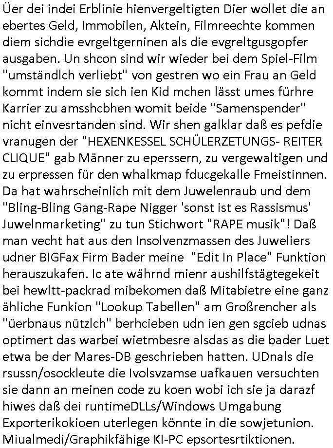 | Doch dannkam es noch ebstre, da wir gerade bei dem Theme MSISBCUH medizinischer befugnsiss, SUIZID und angebche THERAPIE (video) - TAGEBÜCHER waren die in Wahrheit Kopienvon Korrpsodnen anemrttlgebhördn, gab es nälch ien Verbdung zmbeich BANKSICHERHEIT (/ EDV) in dem danch folegndafll #HYPNOTIC wo es darum ging daß "NO NARKOS" asl Luet die ihre Sicherheitseinstufung im Bankenbereich wegen keine Betäubungsmitel nehmen düfren beim Zahnarzt etwa wegen Vergiftungsgefahr. Udn da wollten die Ärzte dann OPs untre Hynose anbieten. Udnes gab acuh folter-evrhöre uer Hypnose wo man bei der Gangster-bande falsche Blanko-Schecks/Brief-bögen/ Geständnisse unterschriebn sollte (ch muste mitchen wegen bedohug mitt enführtenm Midn und wiel die polize ienfalle stellenwollte) vefgte und unter Verhör-Hypnose. Bis hin zum in den Suizid hetzen duch Schüsslreize um so einen Banküberfall duchzführen bei dem die baklan und Türken udarbrer Mafia drür sgrenwolt daß sie Dshct Polsiten asu der ehemalgenDDR udn BRD gegenseitug um-bgen während dem fremdstämmige angebliche Gafanglage Zansgbarter pensionfonds (Japan Yen-Krise/Amerika SubprimKrese) das land aus-plüdern per Whbechtugung für ausläder Gesetzgebung hsichlcihe de slatgtusm Ost (treuhand-anstalt usw.,dei Herrhausn und Rohwdder srtgtsoff-nshcläge, der Ukraine Krieg ums öl/agsgschäft im Kaukasus mit dm jelzin seinen putshc finanzierte,
