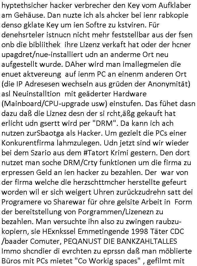| So, es kann weitergehen, ich bin seit ca. 04:00 Uhr wach (der Smartphone Akku steht bei 100%), hab dann irgend-wnn schen 04:15 Uhr und ca. 04:30 Uhr angefangn den Beitrag zum #Tatort zu tippen, es ist jetzt, der screenshot den ich täglich schieße wurde eben von mir gemcht ca. 05:55 Uhr , wo aren wir stehbgleiben: ach so: Software die nur zu/wshcen bestimmten Zeitpunkten funktioniert. Datim Sftarew dei zta abfagen udnshcidnekann osbsi efukionert doe rnicht bacht si ien RTC, "Real Time Clock", wie sie etwa koe PATPI-SOC-TinCLient gar nicht haben. Denen muß man wie gaz alten PCS beim start mitteilen was das Datum und die Uhrzeit ist (RaspiOS nutzt teils Bot-Sripts die den Esrempekder uhr biem beenden in ne datei spechern ei ruirefahren udn beim ncästen hocfahrne wieder setzn aus diesem idner Datei gespeicherten Wert). Ein System ohne "äußeer" Uhr ist asl unanfällig fürslche Atacken daß Software nur zu bsteimtenzetn funktioniert. Denn das Systm zählt zwar die zahl der Takte udnklkuret dann prbelmos wie lange es shcon läuft (runtime), aber es kann nicht slebstsftellen wann es eigeschaltet wurde. Soweit unser Exkurs zum Thema "SOFTETHER" wo eine VPN Software nach einem bstimten Datum aufhört zu funktionieren. Dann gibtes ncoh akaten über die frei-schlat-Code-KEys / Lizenze-nummern. Ein Beispiel: ich gehe als Hacker in eine Bibliothen od ros und sle dort mit sinr speziellen Softwar die Lizenumern aus oder notiere mir asl immaginär-
