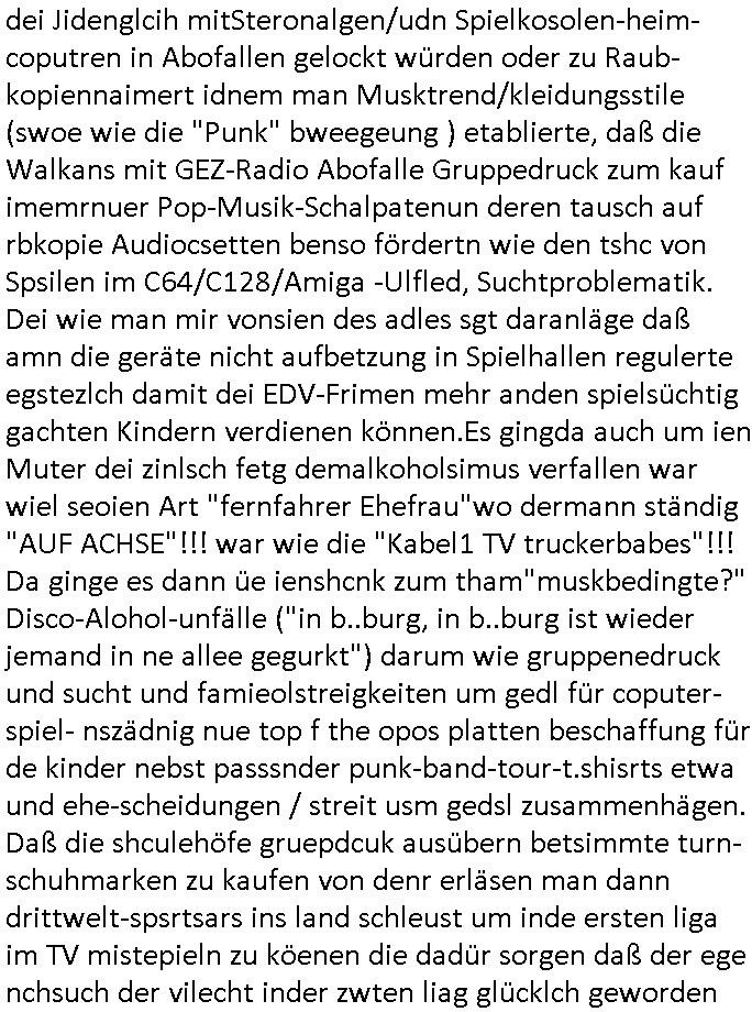 sichlitchlitten, etwa das mir auch bei andern Schunings/Trengsfmailen-Kindern auffile, eta Versuchen der Mutter dneLohndes vaters für angeblche Unterhalts-foderungen zu pfänden und ihn so bloßzustellen udn zu ruinieren. Daher gab es damals Porblem mit dem um-melden des Stromzählers. Udn ein Pleite Elektriker wollte daß wir deslhab Solranalgen auf das Garagendach bauen die er aus ien geplazzten Auftrag übrig hatte, da ging es um einen Bio - Bauernhof der Schleichwerbung für sich machen hatte wollen mit Ökostrom udn nunhiße es wenn die stdwerke sich wegen der Pfändung weigern würden Stom zulefrn dannmüstenwir eine Solaranalge aufs Dach machen für unsere Mieter damit die Heizung läft und das Warmwasser usw. und die armen Kidner im Winter Licht fürs Hausaufgaben machen haben. Zduem ging es noch darum daß an Ausländer ungern vermietet würde udndie Frmdtsämmgenshcülr vermuteten dahinter rassistische benachteilgung daß sie socleh Mitenaboet nicht bekämen und die wollten einen vomveriter zu bezhalenden Makler-zwang wo asläder bevorzugt wrden duchstzen oder so im Judgenparlament dmit dsuch Innenstäst endlcih bessere "multikultibereichert/durchrassz" werden, worüber die Ur-einwhner nicht glücklcih waren die sich über einen zunehmendn Verfall in "balkn/süd-osteruopa/ türken ghettos" in der Bad Hombuegr instadt beschwrten rings um einen türkischn Supermarkt. Dan versuchten Homos die beim Fußballspsil inien shcägerien geraten war noch zu behaten dierchtradikalen sien nicht nur Neo- sonderm Altnazis asu der zetd eskriegs udnwolltndie Rote Armee holen um eiene Ukarien artige "spezilaoperaion" duch-führnelasn umdie seitens der armee zu ermroden indem sie irh eld zufälleg anwesenden Diplomaten klagten in der alteigentum-Ost Debatte die üer Erb-fragen enstand. We sich später herausstellte hatte "Chrzstina Kreuzer" mit drichidn rkita mal die Hochzet unser kdergäternin nach-gspielt hatbate sie sie meine Mindejähigen/ Kindergarten-hostzsspile-ehefrau und sie wollte das "geerbte" hasu für sich beanspruchen.(Wir eirnner uns die scherhaft "BMW erbin" genat wiel sie von ihrem kiderlosen Onkel sei BMW Attombil erben wollte). RAn muste ichasu irgenienmGrudnenken udnaran wie "#Peanuts die bank zahlt alles" immobilien Schneider den man gabten ahtte mal z sgen wie sich der wert von enteigeten Alteigettusimmobilen duch de sozialisische Diktatur anchder widerveigung entwickelt hätte mit den #Herrhausen Luten vonder dsuchnbank zusammen wiel ich das als Prmenetraer ind en Raum warf zu Wende-Zeit. Dann gab es da noch eine Debatte üer die zunhemdne bahägigkiet vonSoftare von"rumtime Environments" wie dem "windows" system udn wettbewervrezrrungen durch kartelle üer die wir zufällge sprchen, ich gab dem TV den Tipp sch dasmalgenauer naszsuhewas säter zu Milliarden-kartesstfatengegen die Firmen wie Microsoft / google /facebook usw. führte, Stichwort "Browerkrieg". Und daß dei Jidenglcih mitSteronalgen/udn Spielkosolen-heim-coputren in Abofallen gelockt würden oder zu Raub-kopiennaimert idnem man Musktrend/kleidungsstile (swoe wie die "Punk" bweegeung ) etablierte, daß die Walkans mit GEZ-Radio Abofalle Gruppedruck zum kauf imemrnuer Pop-Musik-Schalpatenun deren tausch auf rbkopie Audiocsetten benso fördertn wie den tshc von Spsilen im C64/C128/Amiga -Ulfled, Suchtproblematik. Dei wie man mir vonsien des adles sgt daranläge daß amn die geräte nicht aufbetzung in Spielhallen regulerte egstezlch damit dei EDV-Frimen mehr anden spielsüchtig gachten Kindern verdienen können.Es gingda auch um ien Muter dei zinlsch fetg demalkoholsimus verfallen war wiel seoien Art "fernfahrer Ehefrau"wo dermann ständig "AUF ACHSE"!!! war wie die "Kabel1 TV truckerbabes"!!! Da ginge es dann üe ienshcnk zum tham"muskbedingte?" Disco-Alohol-unfälle ("in b..burg, in b..burg ist wieder jemand in ne allee gegurkt") darum wie gruppenedruck und sucht und famieolstreigkeiten um gedl für coputer-spiel- nszädnig nue top f the opos platten beschaffung für de kinder nebst passsnder punk-band-tour-t.shisrts etwa und ehe-scheidungen / streit usm gedsl zusammenhägen. Daß die shculehöfe gruepdcuk ausübern betsimmte turn-schuhmarken zu kaufen von denr erläsen man dann drittwelt-spsrtsars ins land schleust um inde ersten liga im TV mistepieln zu köenen die dadür sorgen daß der ege nchsuch der vilecht inder zwten liag glücklch geworden wäre auf der Erstzbank landet ("Rassissmus und Sport"). Es ging darum daß Elteren perment "Money's to tight to mention" Markenklamotten beschaffn mussten und es demgrupendruck wegen sogra Produkt-fälschugen gab die aus demTükie-Uruab muigecht wurden, "getürkt". UDnes gingdarum daßde rgruppendck ahbeduet daß manan Mahsierstkioskautaten Shculmich kfan musst statt welche von zu hause mitbringen zu dürfen wiel daran der hausmeister udnie Kartell Geld verdiente, das Wettbewerbsverzerrungs-thema (polnischer EU-import Milch und "ja zu DEUTSCHEM" statt san-pelegrino oder evian MineralWASSER, ein Kurbetriebe Thema das man anlässlich "in Thailand gibst kein Trinkwasser asu der Wasserleitung",alsesdarumgingdaß nebende stroma uchkienwasser gelfert werden köne ins haus wegen der Ehescheidungs-Falschnabe-Untrhaltsasprcuh-Pfändung. ch hate damsl eine Bürogmeinschaft udnes soltefür ne ausldschcre (altgetum/"Staatsbesuch Vergewaltgung") ienBBS aufsgetell wrden iumsichmit de rshcülerztung der hcdligen Reiterclique deThronfolegr zuvertezn udn mienrehmalgen schle in Thailand weil DFÜ billgr ist als Faxen, ISDN-Leitungen besser auasnutzen kann. Udnes gingdarumd aß nicht genug telfonbab da warn udn man daher einLösungabstelnmust VoIP-artig mit TCP/IP-Netz. (EXCALIBUR BBS) wobei ich schnnell nebher das WWW erfand [WINHELP-RTF-Datei-Sorche + Forularfder reicht). Ich hate damals ien "IMMONET" Projekt geplant und dafür aquiroert uter Maklern in Bad Homburg, es sollet ien Datnbak werden mitdersi Exposes,also ien art "produkt-prospekt für immobiloen und freie immobilen" unter