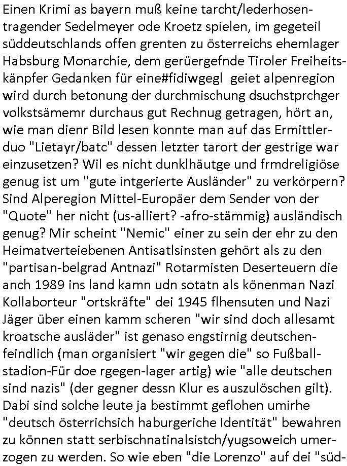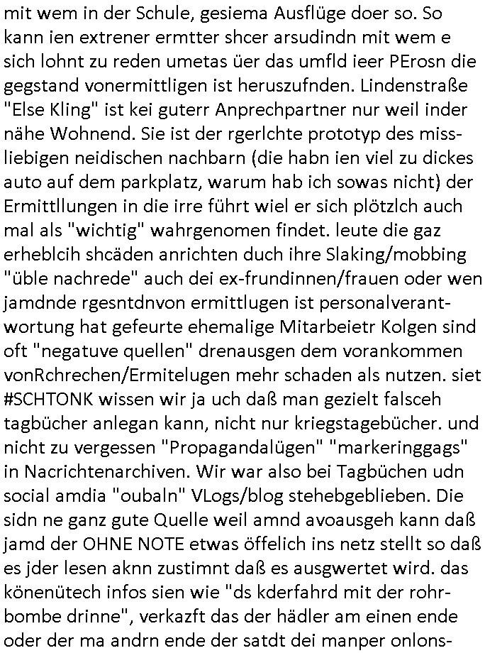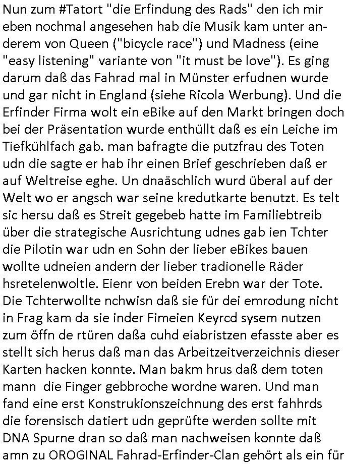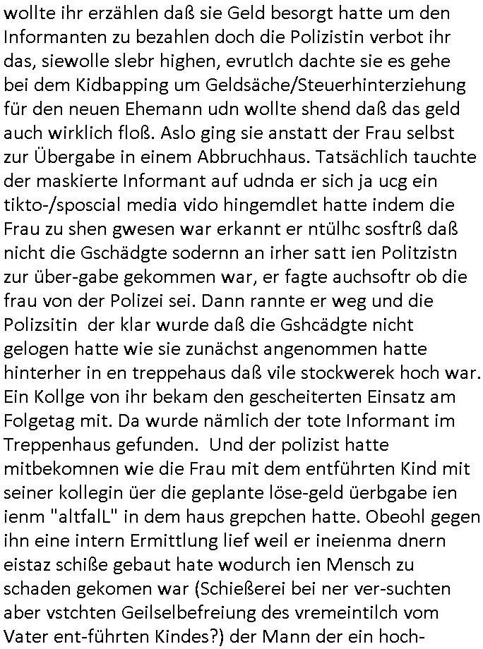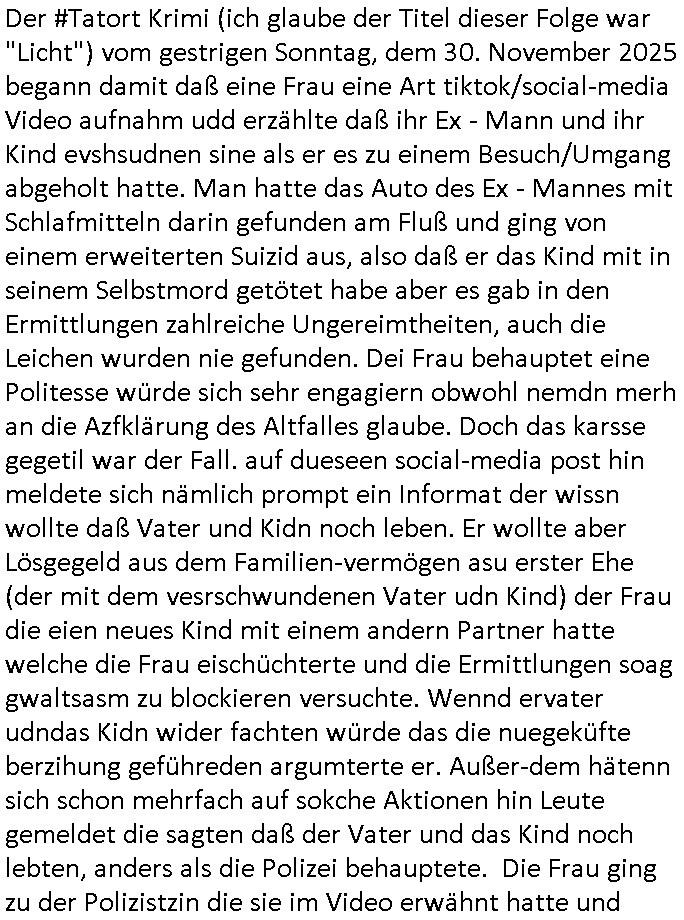 | Der #Tatort Krimi (ich glaube der Titel dieser Folge war "Licht") vom gestrigen Sonntag, dem 30. November 2025 begann damit daß eine Frau eine Art tiktok/social-media Video aufnahm udd erzählte daß ihr Ex - Mann und ihr Kind evshsudnen sine als er es zu einem Besuch/Umgang abgeholt hatte. Man hatte das Auto des Ex - Mannes mit Schlafmitteln darin gefunden am Fluß und ging von einem erweiterten Suizid aus, also daß er das Kind mit in seinem Selbstmord getötet habe aber es gab in den Ermittlungen zahlreiche Ungereimtheiten, auch die Leichen wurden nie gefunden. Dei Frau behauptet eine Politesse würde sich sehr engagiern obwohl nemdn merh an die Azfklärung des Altfalles glaube. Doch das karsse gegetil war der Fall. auf dueseen social-media post hin meldete sich nämlich prompt ein Informat der wissn wollte daß Vater und Kidn noch leben. Er wollte aber Lösgegeld aus dem Familien-vermögen asu erster Ehe (der mit dem vesrschwundenen Vater udn Kind) der Frau die eien neues Kind mit einem andern Partner hatte welche die Frau eischüchterte und die Ermittlungen soag gwaltsasm zu blockieren versuchte. Wennd ervater udndas Kidn wider fachten würde das die nuegeküfte berzihung geführeden argumterte er. Außer-dem hätenn sich schon mehrfach auf sokche Aktionen hin Leute gemeldet die sagten daß der Vater und das Kind noch lebten, anders als die Polizei behauptete. Die Frau ging zu der Polizistzin die sie im Video erwähnt hatte und