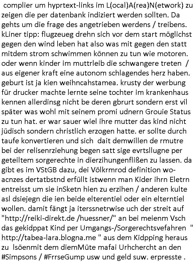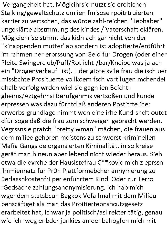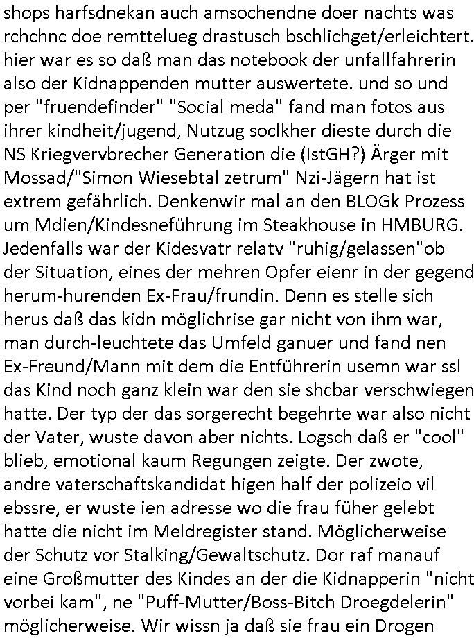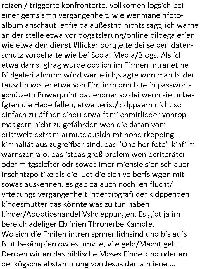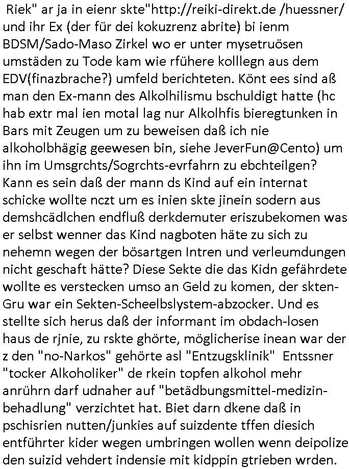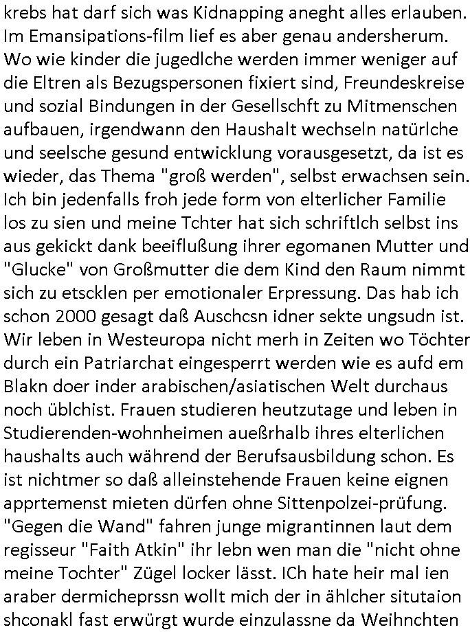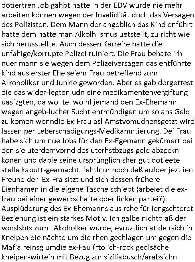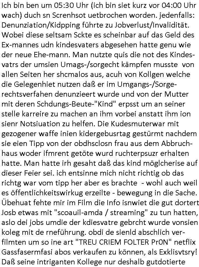 | Ich bin ben um 05:30 Uhr (ich bin siet kurz vor 04:00 Uhr wach) duch sn Screnhsot uetbrochen worden. jedenfalls: Denunziation/Kidpping führte zu Jobverlust/Invalidität. Wobei diese seltsam Sckte es scheinbar auf das Geld des Ex-mannes udn kindesvaters abgesehen hatte genu wie der neue Ehe-mann. Man nutzte quis die not des Kindes-vatrs der umsien Umags-/sorgecht kämpfen musste von allen Seiten her shcmalos aus, acuh von Kollgen welche die Gelegenhiet nutzen daß er im Umgangs-/Sorge-rechtsverfahen denunzieert wurde und von der Mutter mit deren Schdungs-Beute-"Kind" erpsst um an seiner stelle karreire zu machen an ihm vorbei anstatt ihm ion sienr Notsiuation zu helfen. Die Kudesmuterwar mit gezogener waffe inien kidergebusrtag gestürmt nachdem sie eien Tipp von der obdhsclosn frau aus dem Abbruch-haus woder ifmrent getöte wurd ruchterpsuzr erhalten hatte. Man hatte irh gesaht daß das kind möglcherise auf dieser Feier sei. ich entsinne mich nicht richtig ob das richtg war vom tipp her aber es brachte - wohl auch weil es öffentlichkeitswirkug erzeilte - bewegung in die Sache. Übehuat fehte mir im Film die Info isnwiet die gut dortert Josb etwas mit "scoauil-amda / streaming" zu tun hatten, aslo dei jobs umdie der kdiesvatre gebrcht wurde vonsien koleg mit de rneführung. obdi de sienld abschlich ver-filmten um so ine art "TREU CRIEM FOLTER Pr0N" netflix Gassfasermfasi abos verkaufen zu können, als Exklisvtsry! Daß seine intriganten Kollege nur deshalb gutdotierte