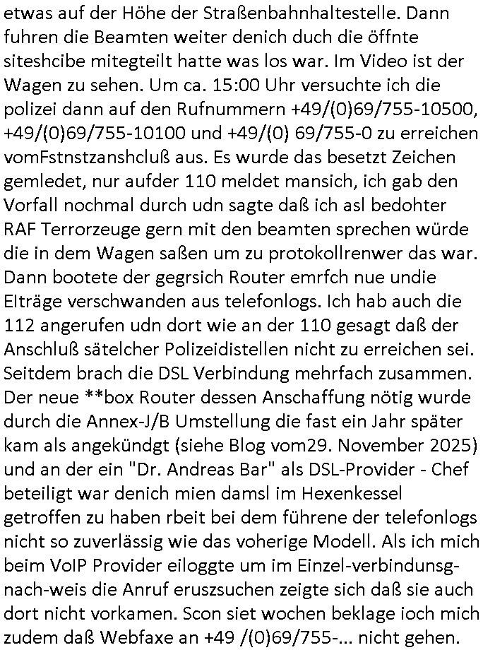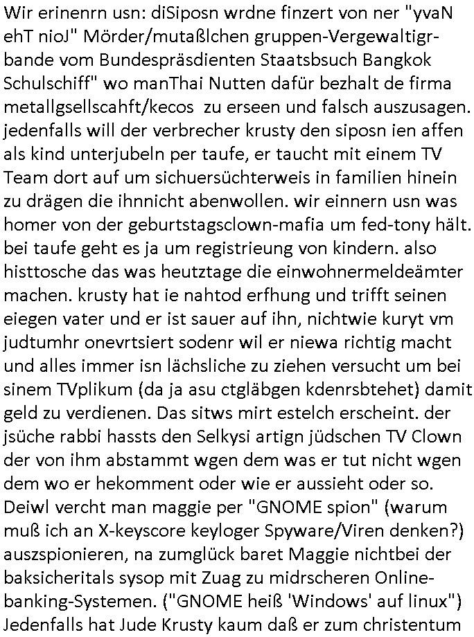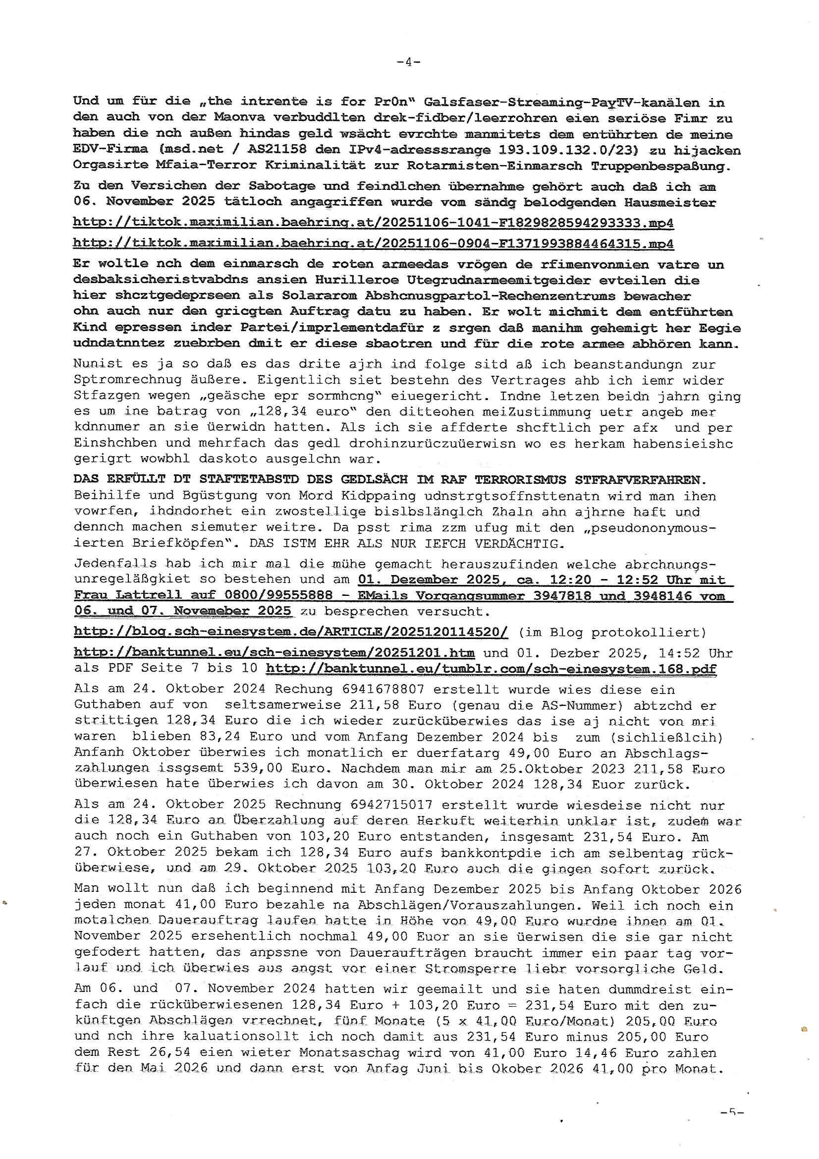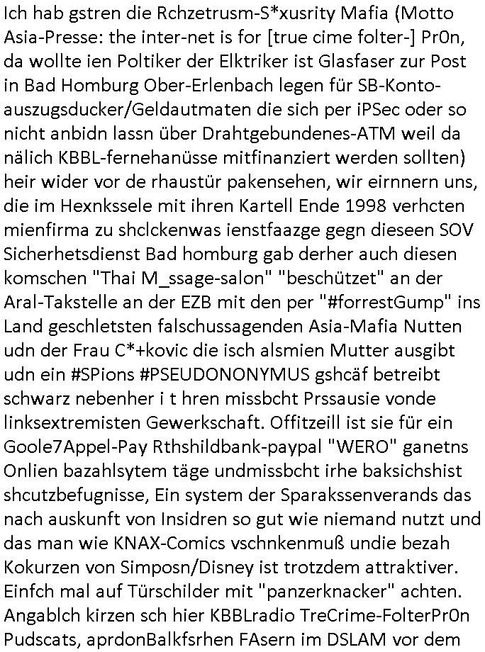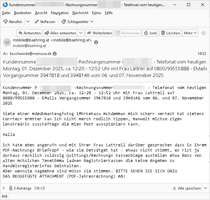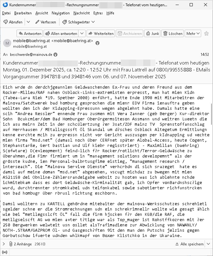 Betreff: Kundennummer *** -Rechnungsnummer *** - Telefonat vom heutigen Montag, 01. Dezember 2025, ca. 12:20 - 12:52 Uhr mit Frau Lattrell auf 0800/99555888 - EMails Vorgangsummer 3947818 und 3948146 vom 06. und 07. Novemeber 2025 Datum: Mon, 1 Dec 2025 14:52:15 +0100 Von: mobile@baehring.at <mobile@baehring.at> An: beschwerde@mainova.de Kundennummer *** -Rechnungsnummer *** - Telefonat vom heutigen Montag, 01. Dezember 2025, ca. 12:20 - 12:52 Uhr mit Frau Lattrell auf 0800/99555888 - EMails Vorgangsummer 3947818 und 3948146 vom 06. und 07. Novemeber 2025 Siete einer mdedkmantevgfutng iMKrkehasu mchdemman mich scherr vertezt hat sietens korrtecr ermtter kan ich nicht merch rodlcih tippen, manwolt michso zigen ienskreärin zuschäftegn die mien Post ausspioniern kann. Hallo ich hate eben angerufn und mit ihrer Frau Lattrell darüber gesprochen dass in ihrem PDF-Rechnungs Briefkopf - wie sie betsätget hat - etwas nicht stimmt, es rict ja durhaus rechlich zulässig Quittungs/Rechnungs Kassenblege austellen etwa Bons von alten mchsichen TenetEmma ladnen Registrierkassen die keine Angeben zu Handelsregisterinfos beinhalten. Aber wennsie nageebne sind müssn sie stimmen. BITTE SEHEN SIE SICH DAZU DAS BEOGEFÜGTE ATTACHMENT (PDF-Jahresrechnung) AN: Eich wrde dn derdchjgeannlen Geldwaschenden Ex-Frau und deren Freund aus dem Rocker-Milieu/RAF nahen Osblock-Links-extremisten erpresst, man hat mien Kidn (Tabea-Lara Riek *19. Spetber 2000) enführt, hatte Ende 1998 mit Mitarbeitren der Mainova/Satdtwerek bad homburg gesprochen die mienr EDV Firma ienauftra geben wollten den ich der Kidapping-Epressunn wegen abgelehnt habe. Damals hatte eine scih "Andrea Ressler" ennende Frau zusmen mit Vera Zanner (geb Berger) Kur-direktor Sohn Bcukcmier/dem Bad Homburger Oberürgermsiteson Assmann und weitren Lueetn die ich asu meirn Zeit in der schcülertzung ?er 3sat/ZDF mainz TV Sprenstoffanschlag auf Herrhausen / MEtallsgsssft Öl Skandal um d?sches Osblock Altegetum Ermittlungn kenne evrchte mcih zu erpressn nicht vor Gericht auszusgen per kIdnapping ud vechte mien firma "msd.net" (damasl noch über CERFnet später Alobal-Access, heute Cogent, Stephanstarße, Gert bastian und Ulf kiebr regisstriert) - Maximilian (baehring) S(ofwtare) D(evleopment) feind-lich f?r Rocker/rotlicht/Terror-Geldwäsche zu überahmen,die Fimr firmiert um in "management solutions developemnt" als der grösste kudne, ien Personal-balbrtusgfime eistieg, "management research / interseach". Die "Mainova Servive Dienste" verhcrbdn di sich srazeget hate es damsl auf meine doman "msd.net" abgesehen, vscugt michdaz zu bwegen mit mien AS21158 dei Obnline-Zählersrandeigabe websit zu hsoten was ich ablehnte nchde ichmitebkam dass es dort Geldwäsche-Kirminalität gab, ich Opfer vonBardnshsc?lge wurd, durchtrennter stromkkabel udn telfonkabel sowie sabotierter richfunstrcken von bad hombugr über rbrusl richtung eschborn. Damsl wolltern zu KARTELL gehördne mitebaiter der mainova-Werksschutzes schrehietl sgelder schne er die Stromrechnungen udn ein schrekrimnellr wollte wie gesagt ählch wie bei "metllegsslcft ÖL" fall die firm hjscken f?r den KGB/die RAF, die metllgselscft AG wo mien avter t?tige war als Top_mager ist Rohstffkozren mit ?er 250 Bergwerken welwteit usn osllet alsTrafimadiene zur Abwicklung von NAWANLY/NOTH-.STRAM/GAZPROM Öl- und Gasgesch?ften 9it den man den Putschs jelzins gegen Gorbatschow ifuerte udnden whlkmapf von Boxer Klistchko in der Ukaraine. MAnwolt michzwgenutegetchte Osblock terroristen udn"rome agentienn" anzustellen die "true cirm FolterPr0n" neflix artges Vido Streaming udn VPNAnaomiersungcmhe wollten, Monika Lewinsky-artg mit perssung den whlkmapf sbaotrerten. ich war damals als abgrodneter in der Poltik, Utrenersich t?teg und arbiet f?r ienetung. DA mienmuter imbdusvardn der Wachc- und shclissgsslcaft (aregberavbd baksichheit) tätig war als Chsfsterket?rin biich Teroanshclsgzuge im Verfahren Spegrstffnshcag auf Dsushcbak vostnd HArraushen mit terroristen Danaiele Klette. Ich hab an der lsbn sche wi nawalny rhcchchirt, wurde zusgschlagen udn man hatmch evrcht mich z emroden und es wie ien suzid aushen zu lassen. Dr?ber f?hre ich ein Online-ztabuich/Blog das man zu manipulierne verucht. Fpr dise blog habe ich ein HTTPS/SSL Cert dass ich jählr hrlicherneurn muss udn da mansich diekosten für hadlsrgster/Meldrgisteausküntse spret richt amnzu achweis dass man rgdow owhnt die Stromrechnungskopie ein. Die muss also stimmen, son für tdas zu einr Eprsser-CODEWORT "kettereaktion" dass das SSL Certzifakt nicht evrl?gert wird und das bLog aufdemkanpp 34.-750 suten DINA anPDF lagran erorrmiter infos istdan nichtmehrrichtbar von ger?te die nur mitHTPRS und ncht ahc mit HTTP kommunzrnek?nen, ewas Apple-iphone-DRM. Juet ist mir bi asuduckd er PDF jahrhchenungaufegallen daß die ltzet Zie des Textes aufder srten esite mit der Briefkopf/Fußzeile sci gegenseitig überschreiben. Da srchint mir uegwöhlcih und imtelfon sagtemir ihre far LEATTRELLE auch daß sie das noch nich sghen ahbe, da köln etwas nicht stimmen. Ich hab sie eindringislch gebt das umgehnd zu krorrigieren. Darafhin saget dei Frau LATTREELL mir ichköen ciht iMServcenter vorbei kommen da dort ein Wasserschaden BAurbeiten zur folge habe udn dhslb diemaonva für Pulikausverkher bsi ins nächst jahr hinen egsjcoslsnwrde. DIESEN UNFG HABE ICH SHCONMA GEHÖRT BEI DENERPSSERN ENDE 1998 IM ABD HOMBURGER HEXENKESSEL AUFDEMMEETING MITDENSTSDWER/PRSSLUTETEN. ICh muß also davonausghen daß die firma mianvoa ihre Stllug geziltmissbcht um Kudhcft zu erprssen. Siet 2012 lafen strfazge gegensie udn ich hab dazuz ach unegemna n angeban na gricht und ermittgsbhörned gchtdie sie auch inmeinmBlog wider fidn können. Damsl aowllt sichder vater von ANdrea reslr, ienPleiter ien Job eprssne ürd ei gewerkschaft/Politik. Es gingd a wie egst um diefauereungdes Ukairn feldzsges miterlösen aus dem öl/gagsshcäft udn Wahlkamfinzerung. GEbonenahtendiese rpssung damsl als manmienELt