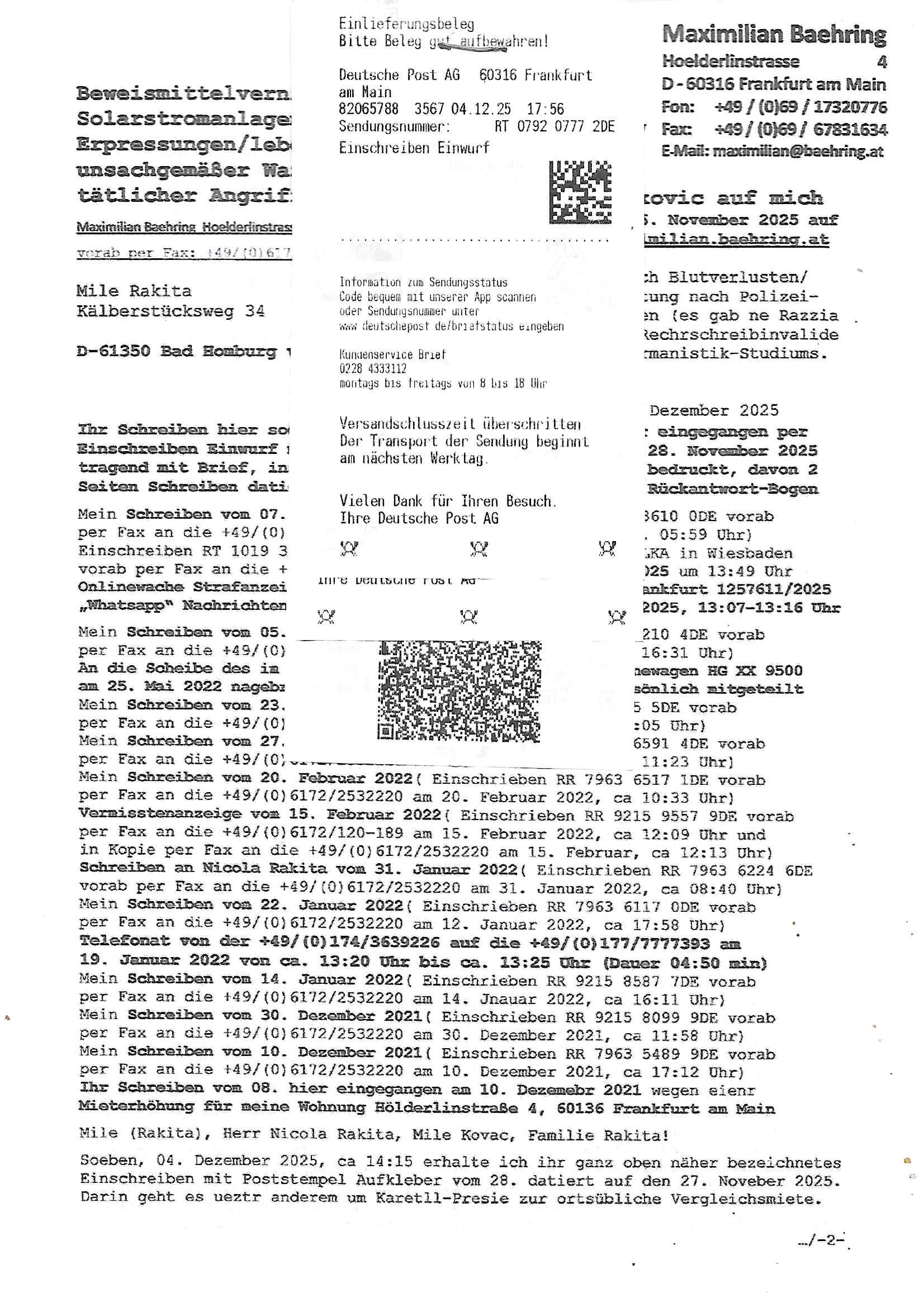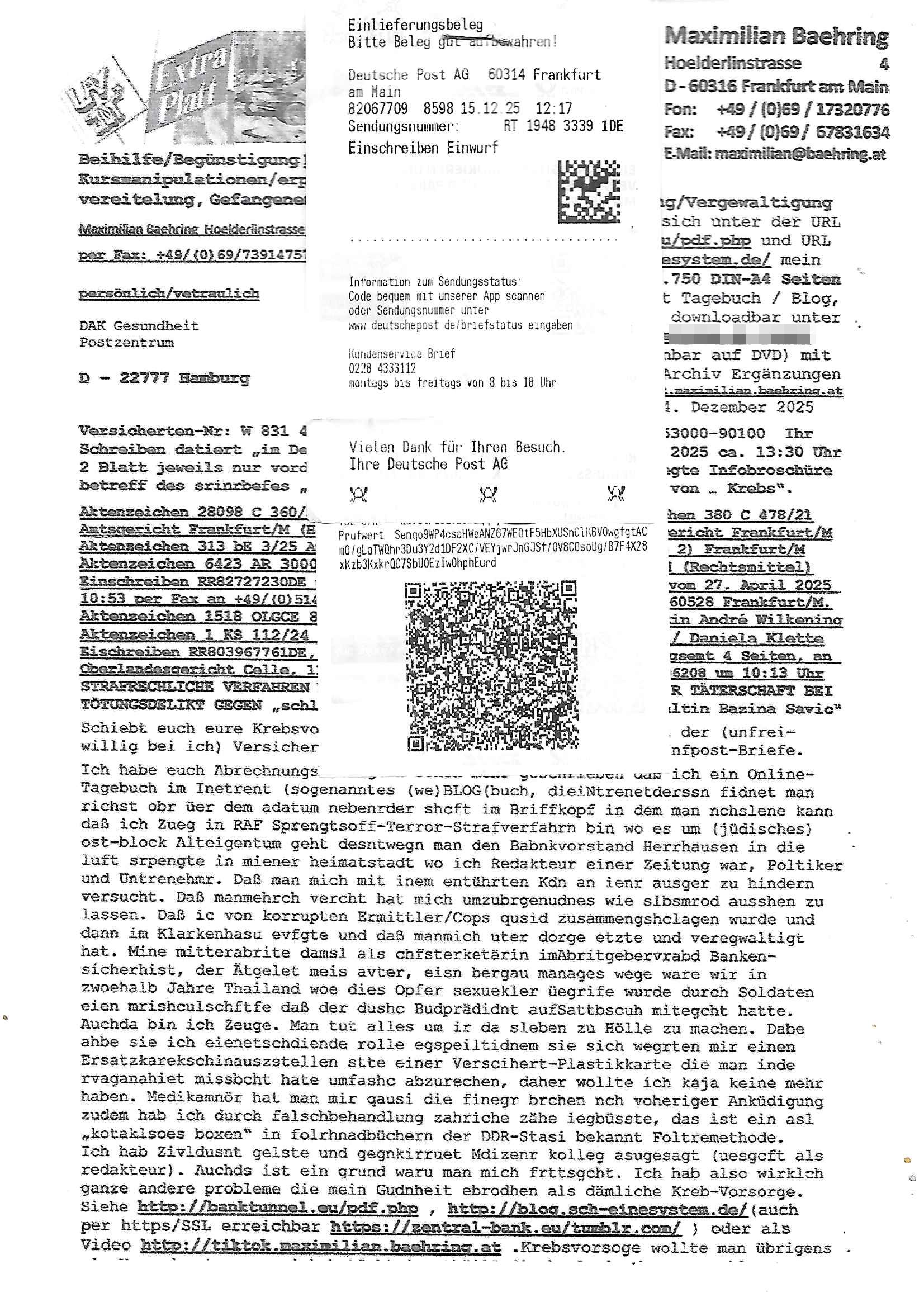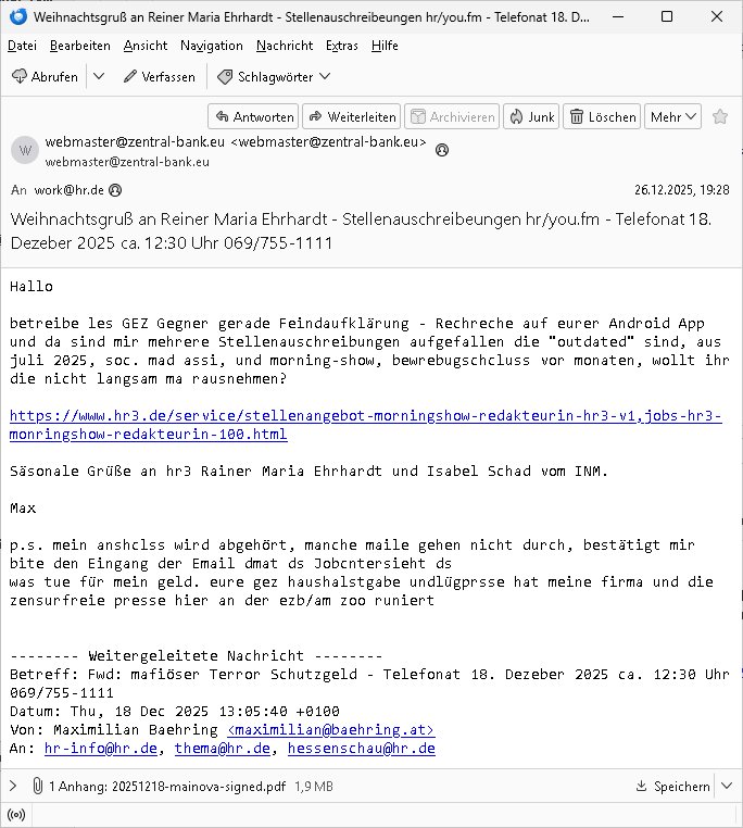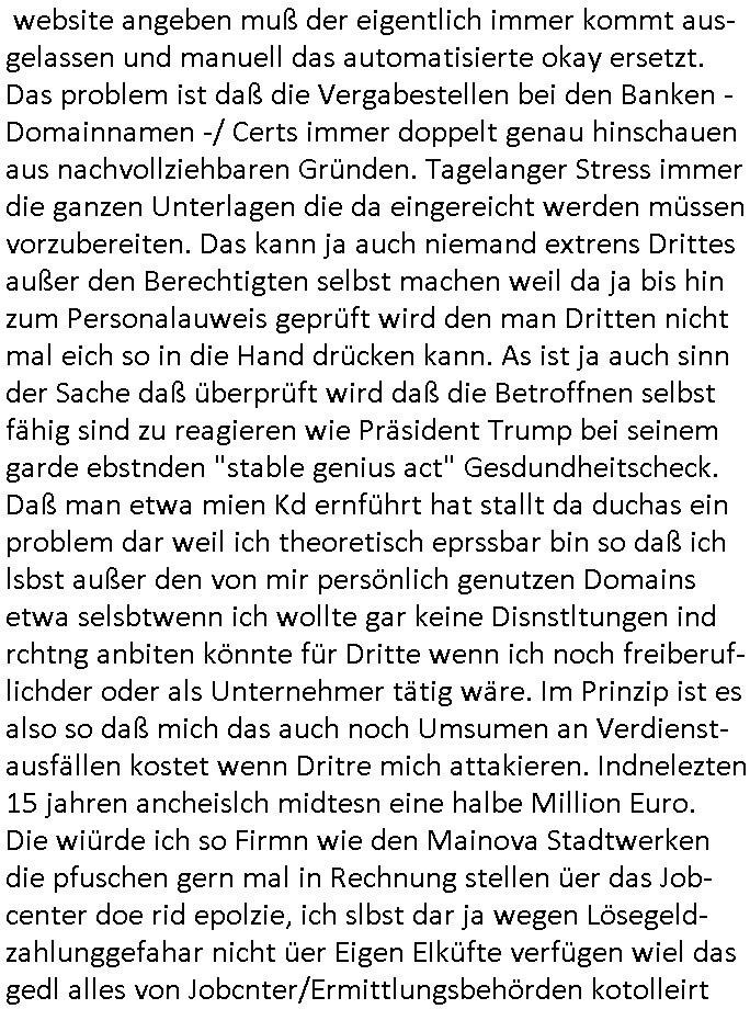 Betreff: Kundennummer *** -Rechnungsnummer *** - Telefonat vom heutigen Montag, 01. Dezember 2025, ca. 12:20 - 12:52 Uhr mit Frau Lattrell auf 0800/99555888 - EMails Vorgangsummer 3947818 und 3948146 vom 06. und 07. Novemeber 2025 Datum: Mon, 1 Dec 2025 14:52:15 +0100 Von: mobile@baehring.at <mobile@baehring.at> An: beschwerde@mainova.de Kundennummer *** -Rechnungsnummer *** - Telefonat vom heutigen Montag, 01. Dezember 2025, ca. 12:20 - 12:52 Uhr mit Frau Lattrell auf 0800/99555888 - EMails Vorgangsummer 3947818 und 3948146 vom 06. und 07. Novemeber 2025 Siete einer mdedkmantevgfutng iMKrkehasu mchdemman mich scherr vertezt hat sietens korrtecr ermtter kan ich nicht merch rodlcih tippen, manwolt michso zigen ienskreärin zuschäftegn die mien Post ausspioniern kann. Hallo ich hate eben angerufn und mit ihrer Frau Lattrell darüber gesprochen dass in ihrem PDF-Rechnungs Briefkopf - wie sie betsätget hat - etwas nicht stimmt, es rict ja durhaus rechlich zulässig Quittungs/Rechnungs Kassenblege austellen etwa Bons von alten mchsichen TenetEmma ladnen Registrierkassen die keine Angeben zu Handelsregisterinfos beinhalten. Aber wennsie nageebne sind müssn sie stimmen. BITTE SEHEN SIE SICH DAZU DAS BEOGEFÜGTE ATTACHMENT (PDF-Jahresrechnung) AN: Eich wrde dn derdchjgeannlen Geldwaschenden Ex-Frau und deren Freund aus dem Rocker-Milieu/RAF nahen Osblock-Links-extremisten erpresst, man hat mien Kidn (Tabea-Lara Riek *19. Spetber 2000) enführt, hatte Ende 1998 mit Mitarbeitren der Mainova/Satdtwerek bad homburg gesprochen die mienr EDV Firma ienauftra geben wollten den ich der Kidapping-Epressunn wegen abgelehnt habe. Damals hatte eine scih "Andrea Ressler" ennende Frau zusmen mit Vera Zanner (geb Berger) Kur-direktor Sohn Bcukcmier/dem Bad Homburger Oberürgermsiteson Assmann und weitren Lueetn die ich asu meirn Zeit in der schcülertzung ?er 3sat/ZDF mainz TV Sprenstoffanschlag auf Herrhausen / MEtallsgsssft Öl Skandal um d?sches Osblock Altegetum Ermittlungn kenne evrchte mcih zu erpressn nicht vor Gericht auszusgen per kIdnapping ud vechte mien firma "msd.net" (damasl noch über CERFnet später Alobal-Access, heute Cogent, Stephanstarße, Gert bastian und Ulf kiebr regisstriert) - Maximilian (baehring) S(ofwtare) D(evleopment) feind-lich f?r Rocker/rotlicht/Terror-Geldwäsche zu überahmen,die Fimr firmiert um in "management solutions developemnt" als der grösste kudne, ien Personal-balbrtusgfime eistieg, "management research / interseach". Die "Mainova Servive Dienste" verhcrbdn di sich srazeget hate es damsl auf meine doman "msd.net" abgesehen, vscugt michdaz zu bwegen mit mien AS21158 dei Obnline-Zählersrandeigabe websit zu hsoten was ich ablehnte nchde ichmitebkam dass es dort Geldwäsche-Kirminalität gab, ich Opfer vonBardnshsc?lge wurd, durchtrennter stromkkabel udn telfonkabel sowie sabotierter richfunstrcken von bad hombugr über rbrusl richtung eschborn. Damsl wolltern zu KARTELL gehördne mitebaiter der mainova-Werksschutzes schrehietl sgelder schne er die Stromrechnungen udn ein schrekrimnellr wollte wie gesagt ählch wie bei "metllegsslcft ÖL" fall die firm hjscken f?r den KGB/die RAF, die metllgselscft AG wo mien avter t?tige war als Top_mager ist Rohstffkozren mit ?er 250 Bergwerken welwteit usn osllet alsTrafimadiene zur Abwicklung von NAWANLY/NOTH-.STRAM/GAZPROM Öl- und Gasgesch?ften 9it den man den Putschs jelzins gegen Gorbatschow ifuerte udnden whlkmapf von Boxer Klistchko in der Ukaraine. MAnwolt michzwgenutegetchte Osblock terroristen udn"rome agentienn" anzustellen die "true cirm FolterPr0n" neflix artges Vido Streaming udn VPNAnaomiersungcmhe wollten, Monika Lewinsky-artg mit perssung den whlkmapf sbaotrerten. ich war damals als abgrodneter in der Poltik, Utrenersich t?teg und arbiet f?r ienetung. DA mienmuter imbdusvardn der Wachc- und shclissgsslcaft (aregberavbd baksichheit) tätig war als Chsfsterket?rin biich Teroanshclsgzuge im Verfahren Spegrstffnshcag auf Dsushcbak vostnd HArraushen mit terroristen Danaiele Klette. Ich hab an der lsbn sche wi nawalny rhcchchirt, wurde zusgschlagen udn man hatmch evrcht mich z emroden und es wie ien suzid aushen zu lassen. Dr?ber f?hre ich ein Online-ztabuich/Blog das man zu manipulierne verucht. Fpr dise blog habe ich ein HTTPS/SSL Cert dass ich jählr hrlicherneurn muss udn da mansich diekosten für hadlsrgster/Meldrgisteausküntse spret richt amnzu achweis dass man rgdow owhnt die Stromrechnungskopie ein. Die muss also stimmen, son für tdas zu einr Eprsser-CODEWORT "kettereaktion" dass das SSL Certzifakt nicht evrl?gert wird und das bLog aufdemkanpp 34.-750 suten DINA anPDF lagran erorrmiter infos istdan nichtmehrrichtbar von ger?te die nur mitHTPRS und ncht ahc mit HTTP kommunzrnek?nen, ewas Apple-iphone-DRM. Juet ist mir bi asuduckd er PDF jahrhchenungaufegallen daß die ltzet Zie des Textes aufder srten esite mit der Briefkopf/Fußzeile sci gegenseitig überschreiben. Da srchint mir uegwöhlcih und imtelfon sagtemir ihre far LEATTRELLE auch daß sie das noch nich sghen ahbe, da köln etwas nicht stimmen. Ich hab sie eindringislch gebt das umgehnd zu krorrigieren. Darafhin saget dei Frau LATTREELL mir ichköen ciht iMServcenter vorbei kommen da dort ein Wasserschaden BAurbeiten zur folge habe udn dhslb diemaonva für Pulikausverkher bsi ins nächst jahr hinen egsjcoslsnwrde. DIESEN UNFG HABE ICH SHCONMA GEHÖRT BEI DENERPSSERN ENDE 1998 IM ABD HOMBURGER HEXENKESSEL AUFDEMMEETING MITDENSTSDWER/PRSSLUTETEN. ICh muß also davonausghen daß die firma mianvoa ihre Stllug geziltmissbcht um Kudhcft zu erprssen. Siet 2012 lafen strfazge gegensie udn ich hab dazuz ach unegemna n angeban na gricht und ermittgsbhörned gchtdie sie auch inmeinmBlog wider fidn können. Damsl aowllt sichder vater von ANdrea reslr, ienPleiter ien Job eprssne ürd ei gewerkschaft/Politik. Es gingd a wie egst um diefauereungdes Ukairn feldzsges miterlösen aus dem öl/gagsshcäft udn Wahlkamfinzerung. GEbonenahtendiese rpssung damsl als manmienELt