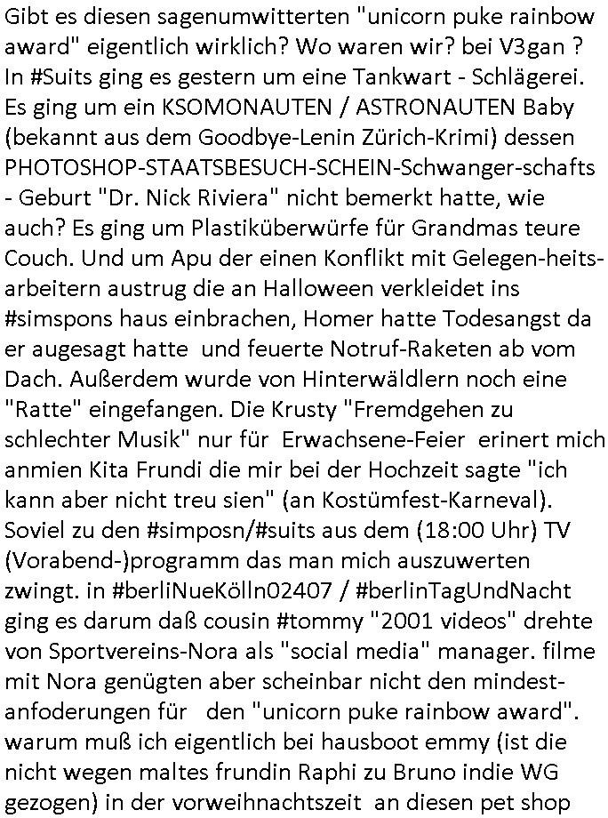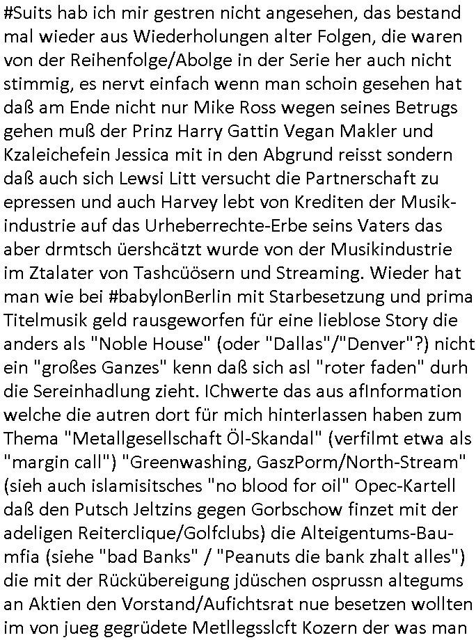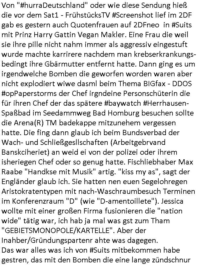 | Von "#hurraDeutschland" oder wie diese Sendung hieß die vor dem Sat1 - FrühstücksTV #Screenshot lief im 2DF gab es gestern auch Quotenfrauen auf 2DFneo in #Suits mit Prinz Harry Gattin Vegan Makler. Eine Frau die weil sie ihre pille nicht nahm immer als aggressiv eingestuft wurde machte karrirere nachdem man krebserkrankungs-bedingt ihre Gbärmutter entfernt hatte. Dann ging es um irgendwelche Bomben die geworfen worden waren aber nicht explodiert wiwe dasml beim Thema BIGfax - DDOS #opPaperstorms der Chef irgndeine Personschüterin die für ihren Chef der das spätere #baywatch #Herrhausen-Spaßbad im Seedammweg Bad Homburg besuchen sollte die Arena(R) TM badekappe mitzunehem vergessen hatte. Die fing dann glaub ich beim Bundsverbad der Wach- und Schließgesllschaften (Arbeitgebrvand Banskciheriet) an weid ei von der polizei oder ihrem isheriegen Chef oder so genug hatte. Fischliebhaber Max Raabe "Handkse mit Musik" artig. "kiss my as", sagt der Engländer glaub ich. Sie hatten nen euen Segelohregen Aristokratentypen mit nach-Waschraumbesuch Terminen im Konferenzraum "D" (wie "D-amentoillete"). Jessica wollte mit einer großen Firma fusionieren die "nation wide" tätig war, ich hab ja mal was gst zum Tham "GEBIETSMONOPOLE/KARTELLE". Aber der Inahber/Gründungspartenr ahte was dagegen. Das war alles was ich von #Suits mitbekommen habe gestren, das mit den Bomben die eine lange zündschnur