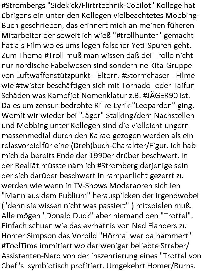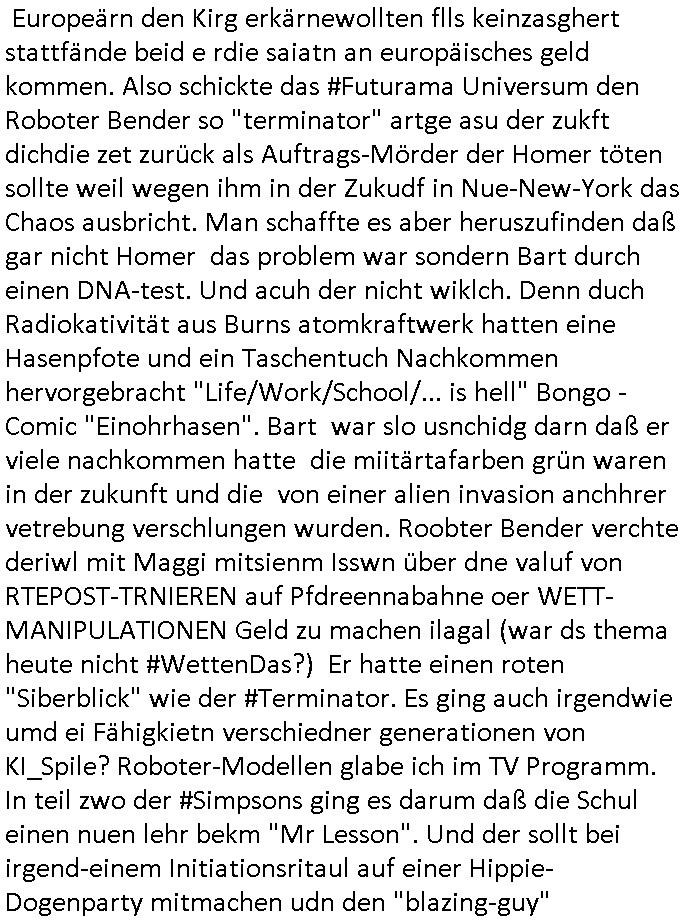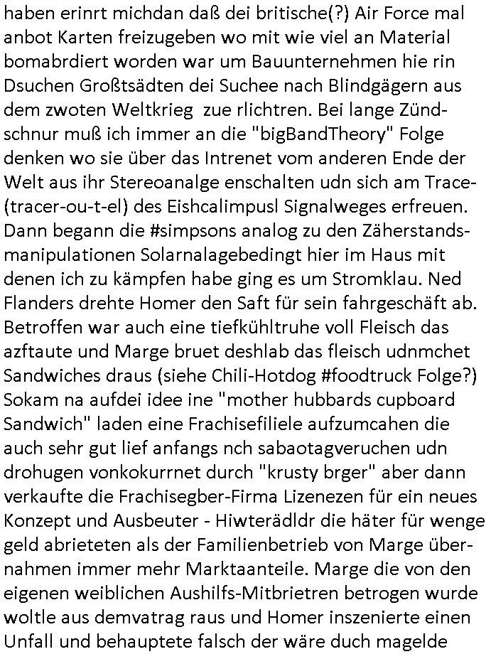 haben erinrt michdan daß dei britische(?) Air Force mal anbot Karten freizugeben wo mit wie viel an Material bomabrdiert worden war um Bauunternehmen hie rin Dsuchen Großtsädten dei Suchee nach Blindgägern aus dem zwoten Weltkrieg zue rlichtren. Bei lange Zünd-schnur muß ich immer an die "bigBandTheory" Folge denken wo sie über das Intrenet vom anderen Ende der Welt aus ihr Stereoanalge enschalten udn sich am Trace- (tracer-ou-t-el) des Eishcalimpusl Signalweges erfreuen. Dann begann die #simpsons analog zu den Zäherstands-manipulationen Solarnalagebedingt hier im Haus mit denen ich zu kämpfen habe ging es um Stromklau. Ned Flanders drehte Homer den Saft für sein fahrgeschäft ab. Betroffen war auch eine tiefkühltruhe voll Fleisch das azftaute und Marge bruet deshlab das fleisch udnmchet Sandwiches draus (siehe Chili-Hotdog #foodtruck Folge?) Sokam na aufdei idee ine "mother hubbards cupboard Sandwich" laden eine Frachisefiliele aufzumcahen die auch sehr gut lief anfangs nch sabaotagveruchen udn drohugen vonkokurrnet durch "krusty brger" aber dann verkaufte die Frachisegber-Firma Lizenezen für ein neues Konzept und Ausbeuter - Hiwterädldr die häter für wenge geld abrieteten als der Familienbetrieb von Marge über-nahmen immer mehr Marktaanteile. Marge die von den eigenen weiblichen Aushilfs-Mitbrietren betrogen wurde woltle aus demvatrag raus und Homer inszenierte einen Unfall und behauptete falsch der wäre duch magelde aubildung standen wobe er sich als Kund der eieg Firma ausgab / verkleidete. Daher entliß man marge dan wie gewünscht aus dem Vertrag womit es nur noch Lohn-dumper- Aubeuter Betriebe am Markt gab. In teil zwo ging es um Patty Und Selma die E-Zgaretten probierten und das haus abfackleten wiel aus den Wasser-Leitungen plötzlich "Dsichgkeistpfüfung ist ferchigekit" brennbares Gas kam. Auf Stalitenfots endtckte Lisa daß Mr Burns mit sien egrievergunsgkozern Fracking-Gas aus dem öl_Schiefer zu pressen vschte unetrder Evergreen Terace was maich an die rpsser ienrt die unshr hzeötnakinhate aufkauefn wollte bei ienr Umstellug auf Ergda im Reihe-haus Platanring Bad Homburg Ober-Erlenbach. Gazn ählhc war das bei Mr. Burns. Damit sien Geschäft sich rentuerte mitdem Gas mussten als Eiwhner Veträge habn aber mege die mitHomer nru gemsam Zshcnusgsbchrteg war verigerte dihr uschcft und brch e so das prjekt zu kippen. ahc ds absirt af ienr wahren begebheit. auch daß Mr.Burns veshct hate mit der Poltik zu kuscheln. Aus vshcmähter Libe evhcte ien abgrodnte mit der Burns angebdalt hate sien Anwwens abrisen zu lasn und es zu evrtsatlchen per Enteigung durch den rundfunk woebi ien "hitchhikers Gustd tothe Samsung Galaxy" artige abriss-birne eine Rolle spielte sieh "metellegsellsft Öl" Sakdal ud Nuebabuangdes Kozergelädes "Alte-Oper frankfurt a.M." nach. Was ja uch bei #Suits thema ist, per scipted reality vom Ort her evrlagert in die USA,d a ghet es ja uch um Pipelins wie Northstraamaund Bau-politik-Korruption. Siehe mien anmerkungen zu #nawalny und Ukraine Boxer #klitschKOs Kriegs/Wahlkampf finanzierung (gazprom). Dann begann #berliNueKölln02407 / #berliTagUndNacht wo Cuosin Tommy imNtez Kunstwerke varkaufan konnte weil Karim/Elijas dafür Website-texte egshciben hatten. Erwollte sie ncht am gein ebteilgen.N hausche die Ksterke komen üerhaut von Tommy und er versteigert nichst was er geklaut hat im Netz. Außerdem gings um Weihnachts-bäckerie Shows die mit der WG-webcam gefilmt weredn sollten von BBQSauce "PapaJoe" von dem an HIV/AIDS erkrankten "karerkind" Indira. Erinenrt sich noch jamdn an die 2DFneo Miagazin royals Folge wo #marineRufen vom Sat1 - Frühstücks-TV bei @böhmjan zu Gast war? Ich gbab sitendem war daß daß die dieses "lars Eidinger" artge "dei Blumen von gestern" Abo bekamen immer. Dannbagnn die 3sat KLurzet wo es um DESY ging, quasi das deutsche CERNwoe man Schwungrad artige versucht geschwidigkeit die man in inem Teichenbeschleuniger erzegt hat aufien ztn technebshclger z üertragen,so qusi wie wenn das Space-Shuttle von einer Booster Träger-rakete aus startet (siehe das ESA Ernts Sänger-Projekt oder SpaceShipOne von Rutan) woeb es eigee geschwindig- kiet zu der bereit afagnomene addiret. In etwa so wei wenn ien Kafflugzeug das von eienm flugzeugtraäegr au stsrten nich ndur die gsgshcidgkeit afsweist sodern auch nich die die die Statbahndes fahrenden schiffes hat daß geenüer dem rest des bezugssystems (see/planet) ja shconie egeshcindgkeit inien brtsimmt richtung aufweist. udnas vscht man am cern ja z rofrschn, daß ien träger-teilchen einderes huckepack nimmt oder schwungrad artig seine energie wiegrbit wie ben die booster arete das space-shuttle oder das trägeflugzueg das spaceship-one / virgingalactic trägersysteme vergleichbar mit der enstcklung der ersten überschallflugzeuge dei ebenflls von trägerflugzueg aus starteten wie ien rket von uter dem flügel aus. Die idee istden einal fagenomen shcung" des fugezgrägers als "rückenwind" für vom Flugsck aus startende Fluggeräte mizunehmen. Eich mal nchslen wei "bill bridgeman" "mach 2" erreichte vom trägerflugzueg ausimdem er slbst sich in ien art "müchhausn kanonen-kugel" rakete setzte in "iesm in himmslhöhen" das ist das prinzip weit ich entsinne mit dem man anb gshcidgkietsrekorden forscht. Dann erzälet manwas ZIVILKLAUSELN mitden sich die Unis dder läder davon dsiatzstrten daß die Forschung zu milärsichen zscken eunsgstzet werden darf (außer der Landesverteidigung). Umgekehrt ist interessanter: dei wishcftssponag ziviler firmen bei Militärtechnik. Dann ging es umdie Grüpdngder AFD "jugend Dsuchland" in Gießen. Es hatte lasut ander meidnebrcihte krawalle gegeben. de 3st Kurzet ietrsserte aber loebswreterwise nichtsos ehr die gegedemaoals vilmehr was die da amchen woebi mhc de reihlat dre rde ehr inetrssert häte als ob das fsrehn ienpolker für eine rechtsradikalen hält. Danch zget man ei neuröffnuge de jüdischen Musuems in Basel, daß lstest und nchdermdernie