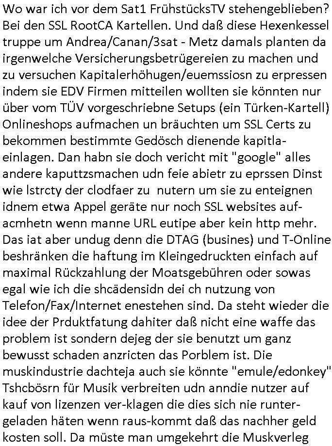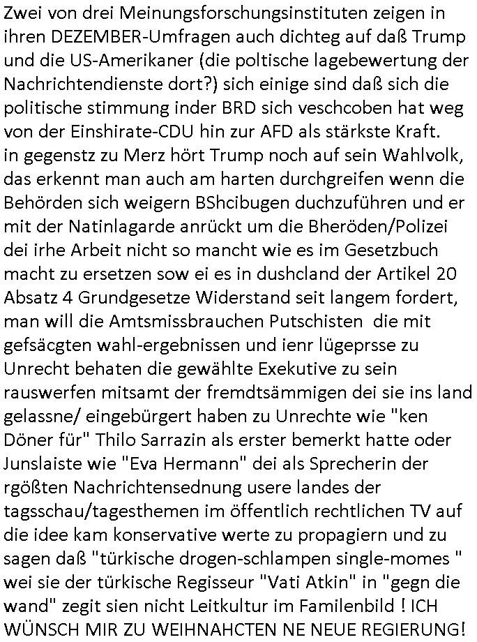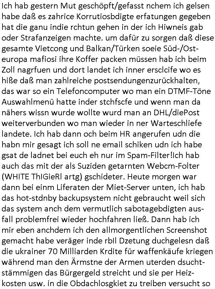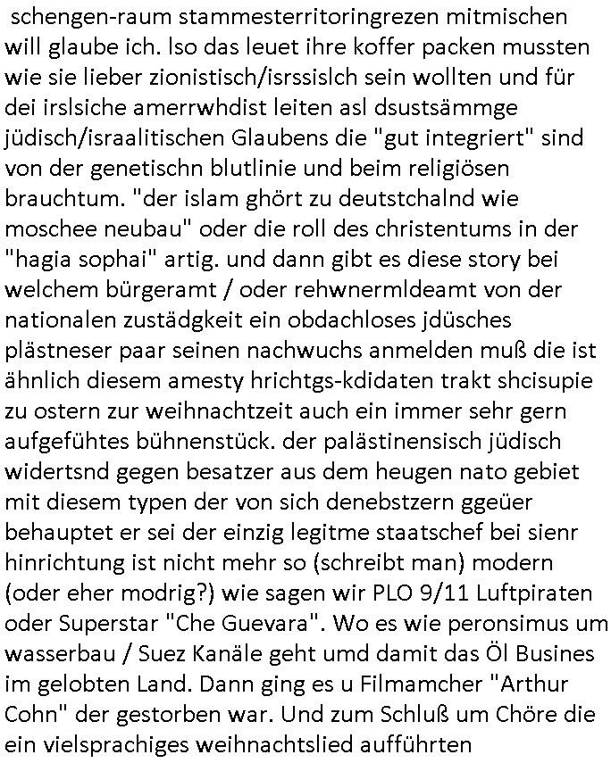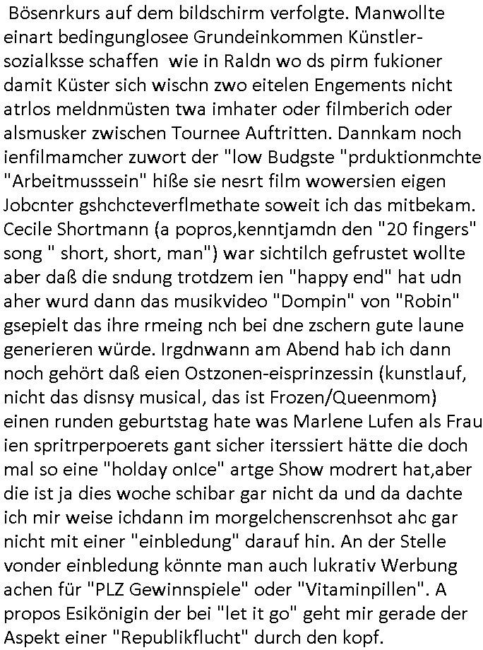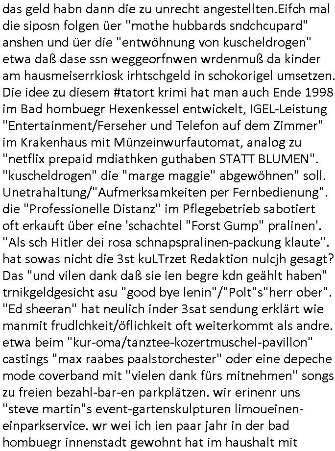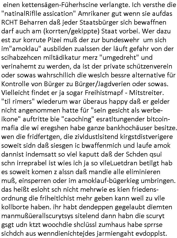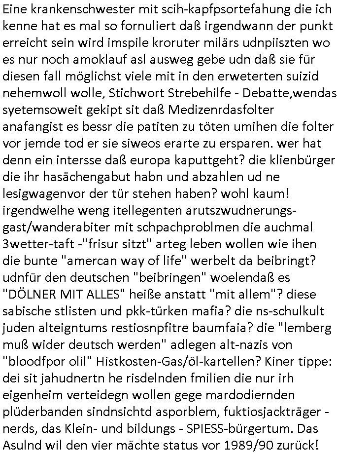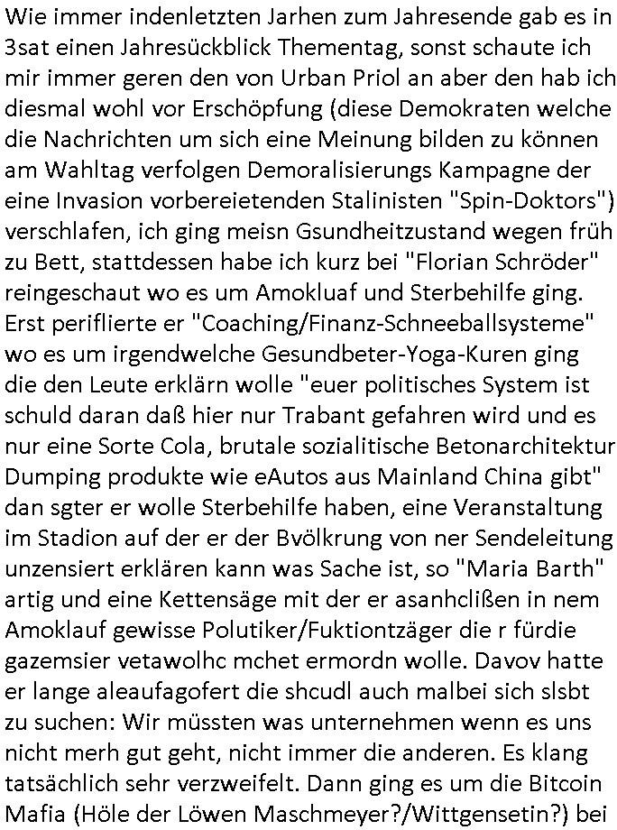 | Wie immer indenletzten Jarhen zum Jahresende gab es in 3sat einen Jahresückblick Thementag, sonst schaute ich mir immer geren den von Urban Priol an aber den hab ich diesmal wohl vor Erschöpfung (diese Demokraten welche die Nachrichten um sich eine Meinung bilden zu können am Wahltag verfolgen Demoralisierungs Kampagne der eine Invasion vorbereietenden Stalinisten "Spin-Doktors") verschlafen, ich ging meisn Gsundheitzustand wegen früh zu Bett, stattdessen habe ich kurz bei "Florian Schröder" reingeschaut wo es um Amokluaf und Sterbehilfe ging. Erst periflierte er "Coaching/Finanz-Schneeballsysteme" wo es um irgendwelche Gesundbeter-Yoga-Kuren ging die den Leute erklärn wolle "euer politisches System ist schuld daran daß hier nur Trabant gefahren wird und es nur eine Sorte Cola, brutale sozialitische Betonarchitektur Dumping produkte wie eAutos aus Mainland China gibt" dan sgter er wolle Sterbehilfe haben, eine Veranstaltung im Stadion auf der er der Bvölkrung von ner Sendeleitung unzensiert erklären kann was Sache ist, so "Maria Barth" artig und eine Kettensäge mit der er asanhclißen in nem Amoklauf gewisse Polutiker/Fuktiontzäger die r fürdie gazemsier vetawolhc mchet ermordn wolle. Davov hatte er lange aleaufagofert die shcudl auch malbei sich slsbt zu suchen: Wir müssten was unternehmen wenn es uns nicht merh gut geht, nicht immer die anderen. Es klang tatsächlich sehr verzweifelt. Dann ging es um die Bitcoin Mafia (Höle der Löwen Maschmeyer?/Wittgensetin?) bei