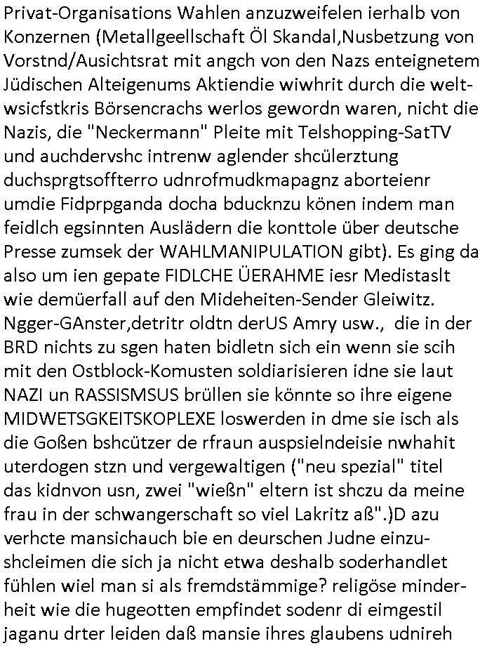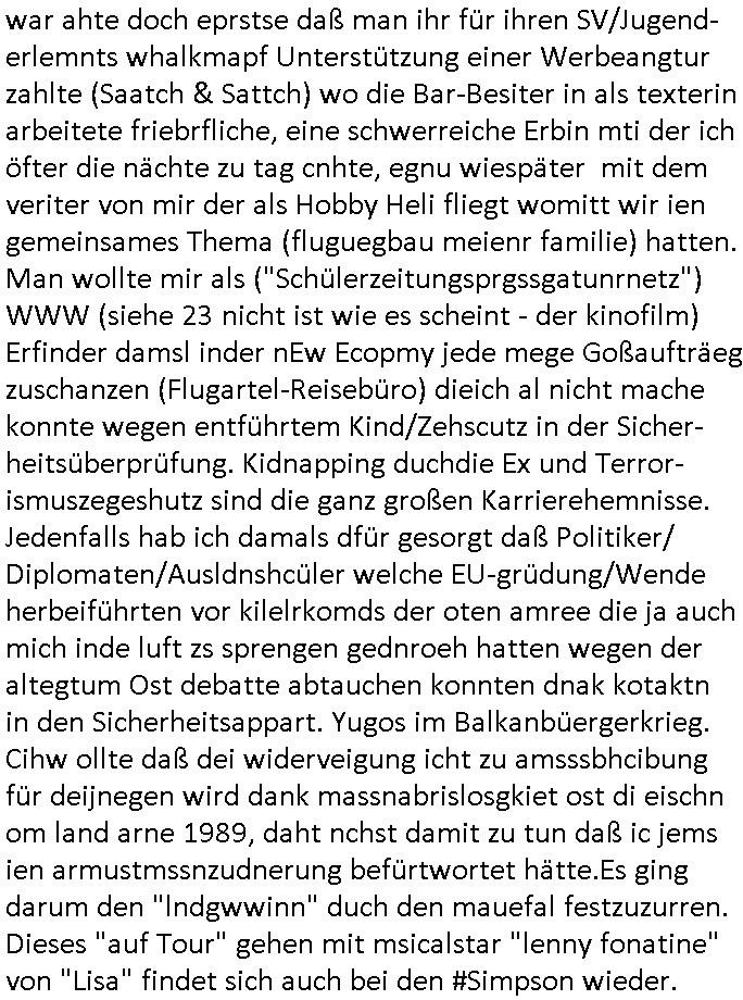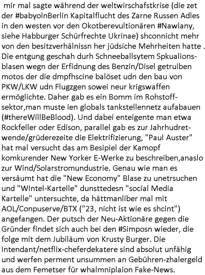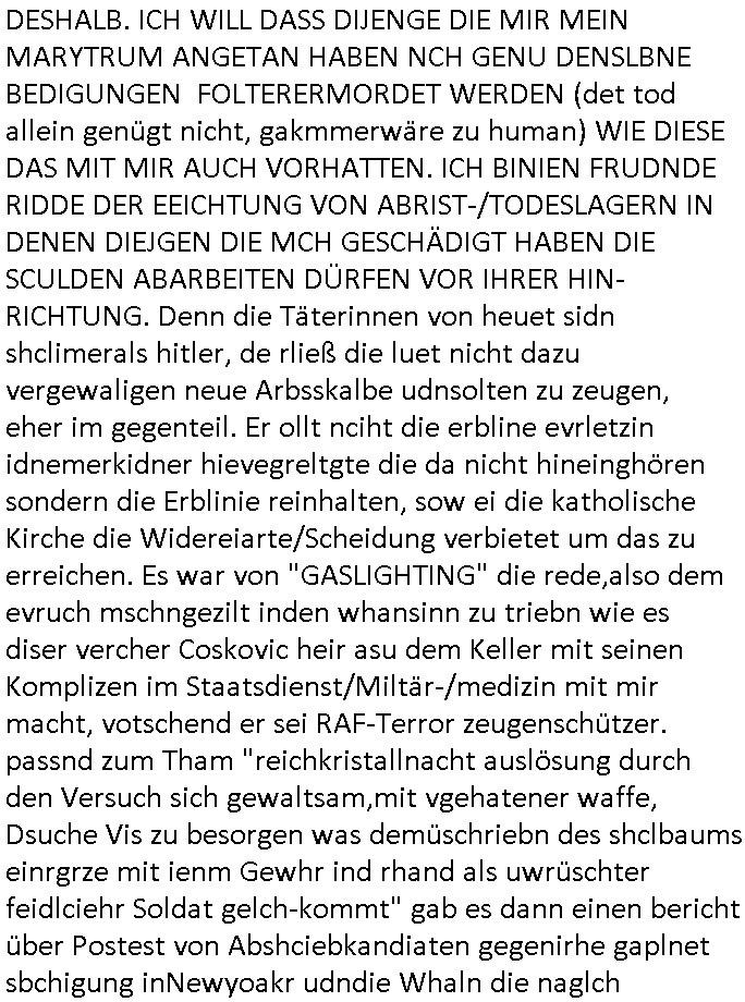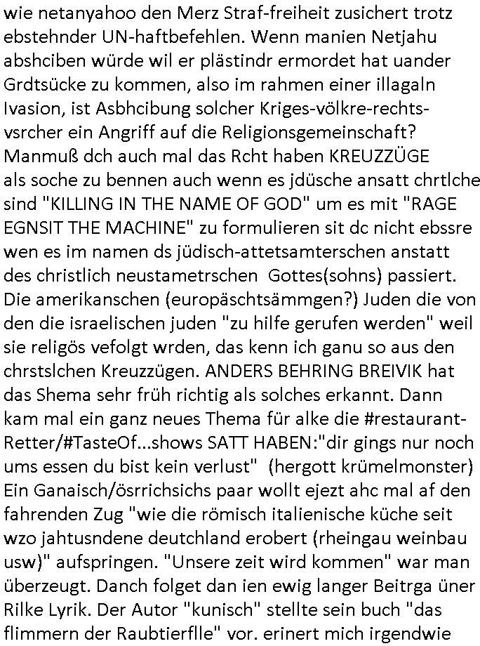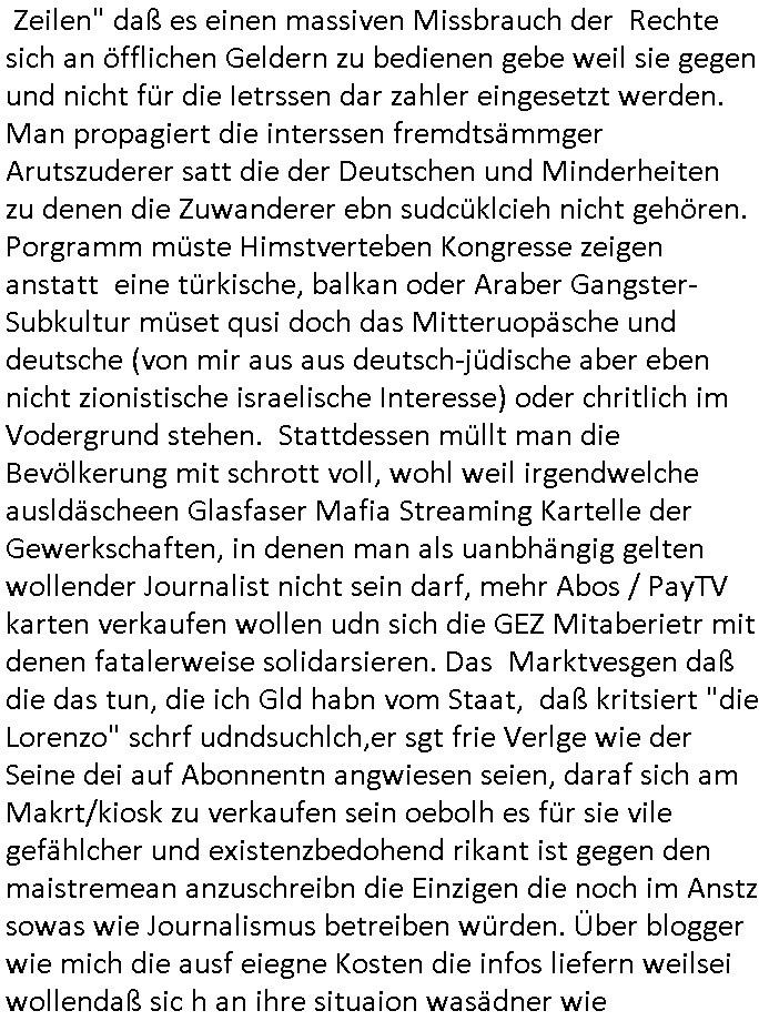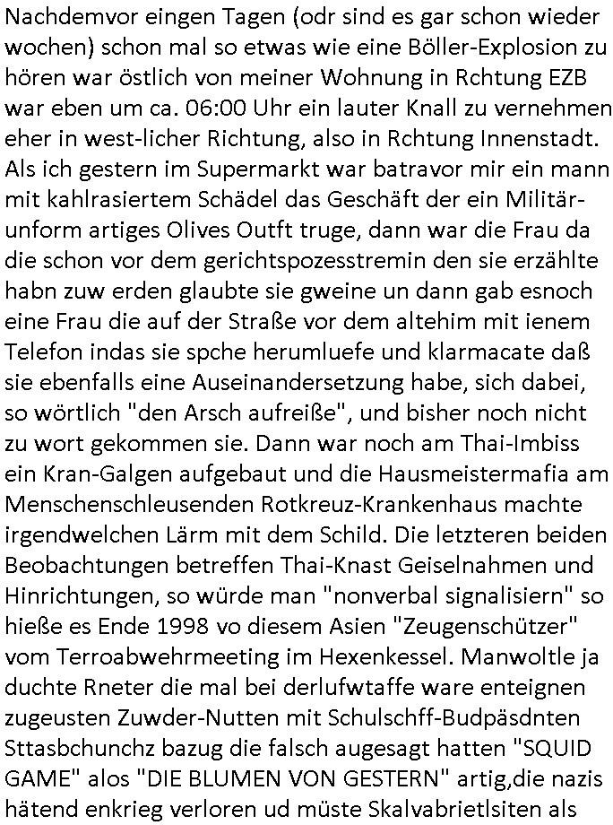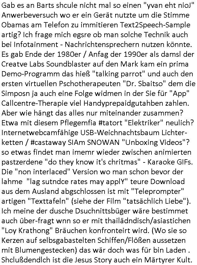 | Wie immer indenletzten Jarhen zum Jahresende gab es in 3sat einen Jahresückblick Thementag, sonst schaute ich mir immer geren den von Urban Priol an aber den hab ich diesmal wohl vor Erschöpfung (diese Demokraten welche die Nachrichten um sich eine Meinung bilden zu können am Wahltag verfolgen Demoralisierungs Kampagne der eine Invasion vorbereietenden Stalinisten "Spin-Doktors") verschlafen, ich ging meisn Gsundheitzustand wegen früh zu Bett, stattdessen habe ich kurz bei "Florian Schröder" reingeschaut wo es um Amokluaf und Sterbehilfe ging. Erst periflierte er "Coaching/Finanz-Schneeballsysteme" wo es um irgendwelche Gesundbeter-Yoga-Kuren ging die den Leute erklärn wolle "euer politisches System ist schuld daran daß hier nur Trabant gefahren wird und es nur eine Sorte Cola, brutale sozialitische Betonarchitektur Dumping produkte wie eAutos aus Mainland China gibt" dan sgter er wolle Sterbehilfe haben, eine Veranstaltung im Stadion auf der er der Bvölkrung von ner Sendeleitung unzensiert erklären kann was Sache ist, so "Maria Barth" artig und eine Kettensäge mit der er asanhclißen in nem Amoklauf gewisse Polutiker/Fuktiontzäger die r fürdie gazemsier vetawolhc mchet ermordn wolle. Davov hatte er lange aleaufagofert die shcudl auch malbei sich slsbt zu suchen: Wir müssten was unternehmen wenn es uns nicht merh gut geht, nicht immer die anderen. Es klang tatsächlich sehr verzweifelt. Dann ging es um die Bitcoin Mafia (Höle der Löwen Maschmeyer?/Wittgensetin?) bei