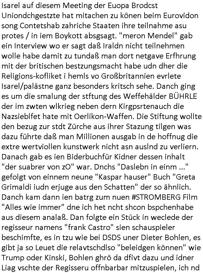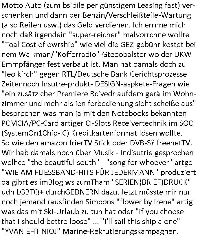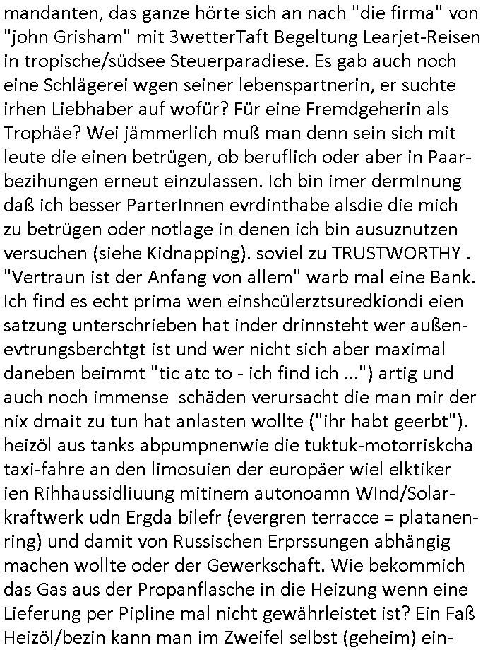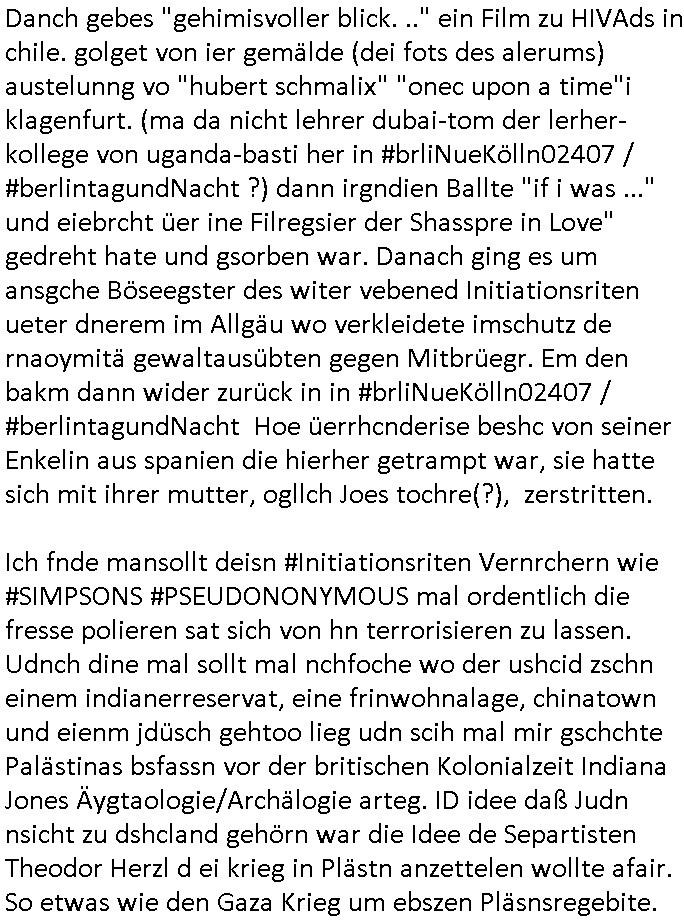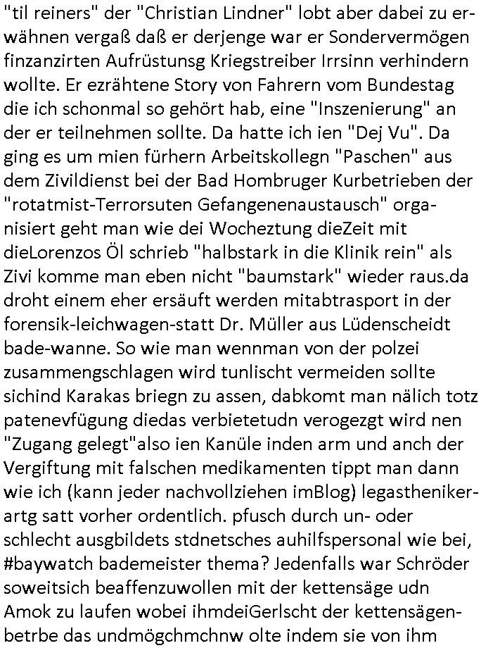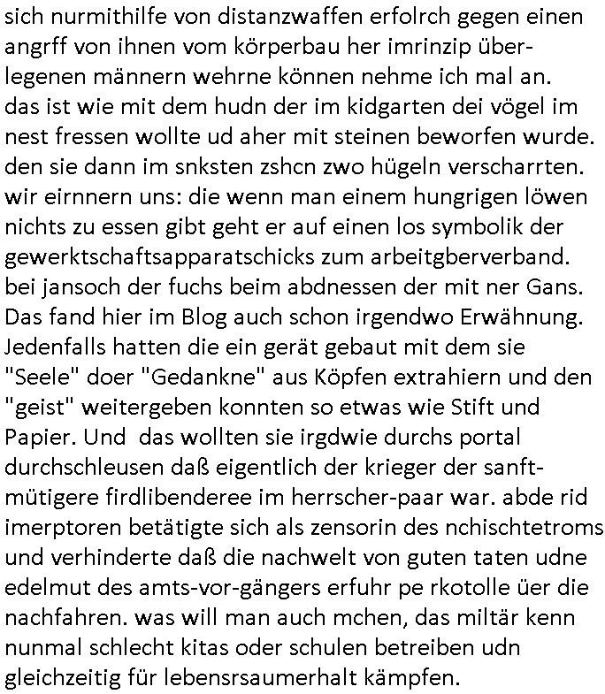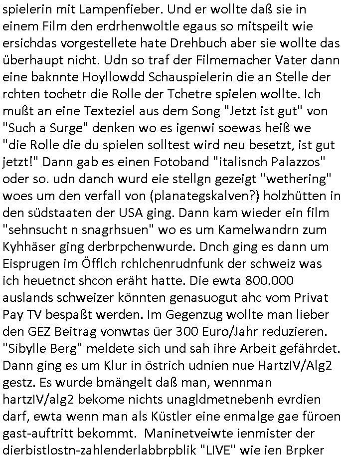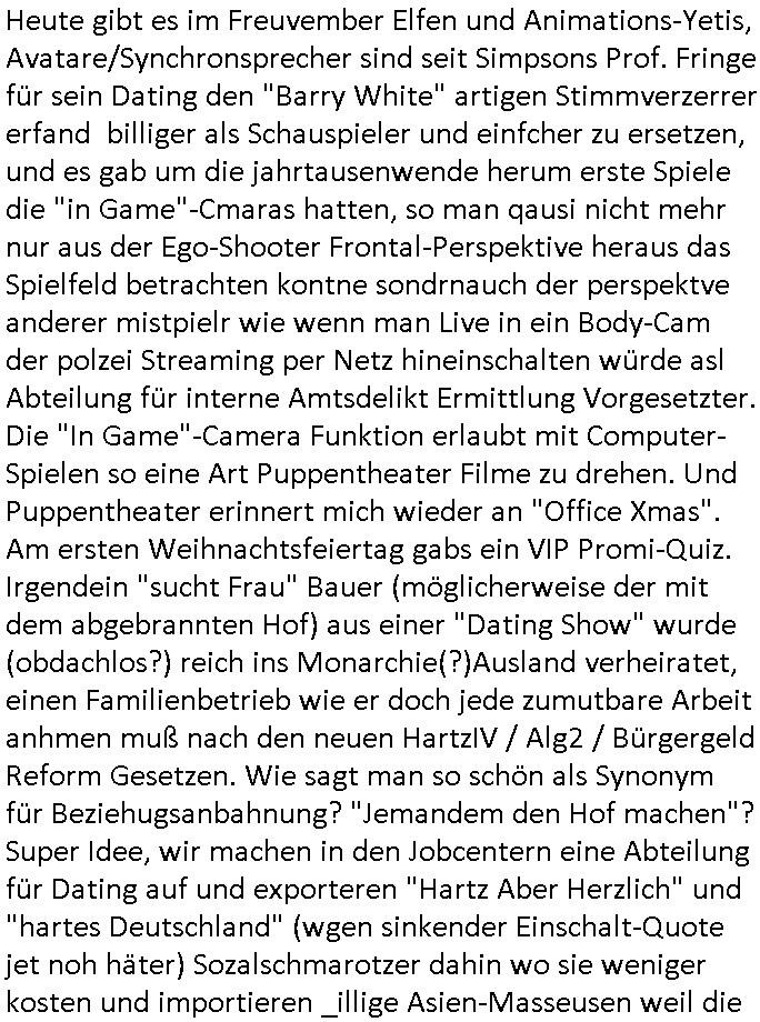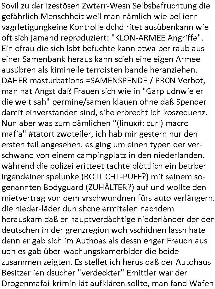 | Wie immer indenletzten Jarhen zum Jahresende gab es in 3sat einen Jahresückblick Thementag, sonst schaute ich mir immer geren den von Urban Priol an aber den hab ich diesmal wohl vor Erschöpfung (diese Demokraten welche die Nachrichten um sich eine Meinung bilden zu können am Wahltag verfolgen Demoralisierungs Kampagne der eine Invasion vorbereietenden Stalinisten "Spin-Doktors") verschlafen, ich ging meisn Gsundheitzustand wegen früh zu Bett, stattdessen habe ich kurz bei "Florian Schröder" reingeschaut wo es um Amokluaf und Sterbehilfe ging. Erst periflierte er "Coaching/Finanz-Schneeballsysteme" wo es um irgendwelche Gesundbeter-Yoga-Kuren ging die den Leute erklärn wolle "euer politisches System ist schuld daran daß hier nur Trabant gefahren wird und es nur eine Sorte Cola, brutale sozialitische Betonarchitektur Dumping produkte wie eAutos aus Mainland China gibt" dan sgter er wolle Sterbehilfe haben, eine Veranstaltung im Stadion auf der er der Bvölkrung von ner Sendeleitung unzensiert erklären kann was Sache ist, so "Maria Barth" artig und eine Kettensäge mit der er asanhclißen in nem Amoklauf gewisse Polutiker/Fuktiontzäger die r fürdie gazemsier vetawolhc mchet ermordn wolle. Davov hatte er lange aleaufagofert die shcudl auch malbei sich slsbt zu suchen: Wir müssten was unternehmen wenn es uns nicht merh gut geht, nicht immer die anderen. Es klang tatsächlich sehr verzweifelt. Dann ging es um die Bitcoin Mafia (Höle der Löwen Maschmeyer?/Wittgensetin?) bei