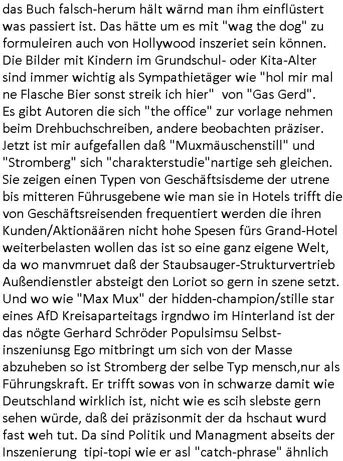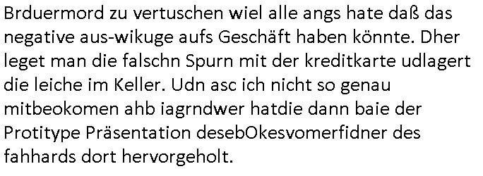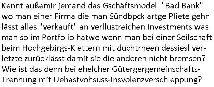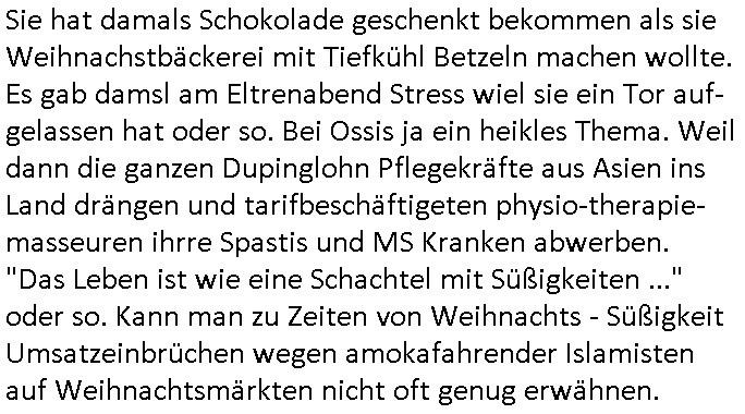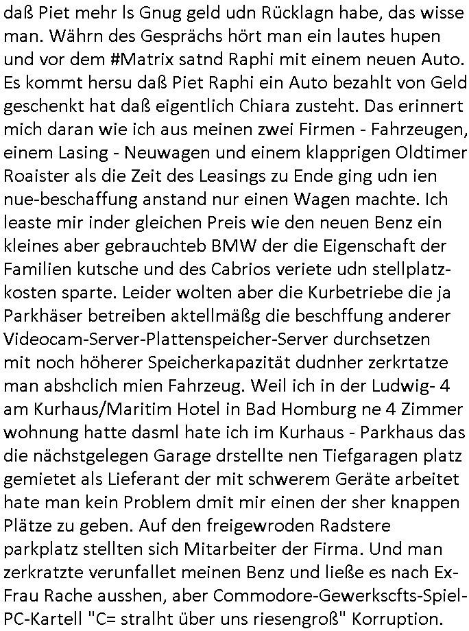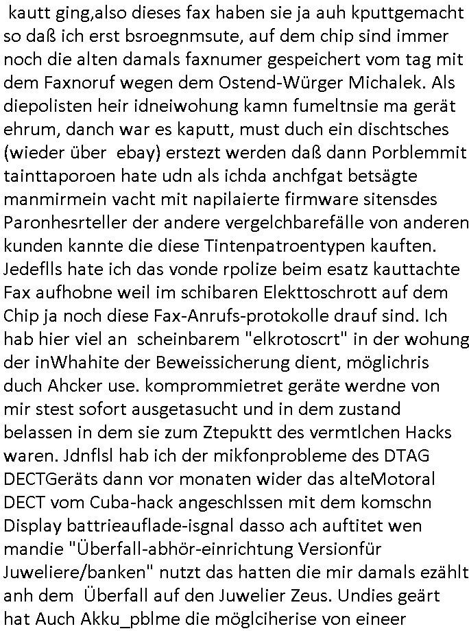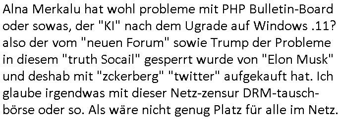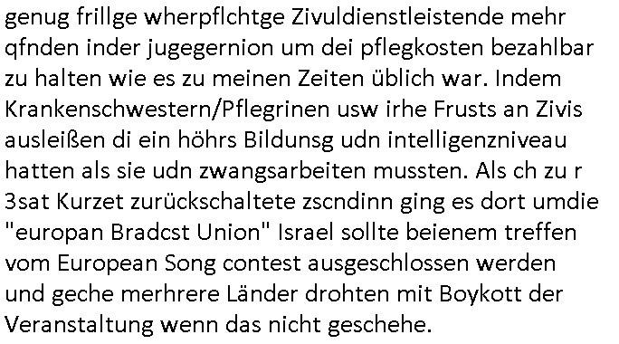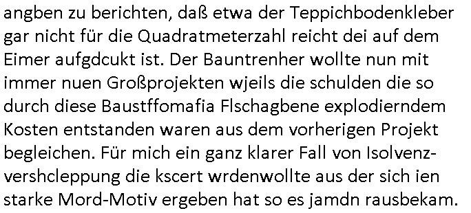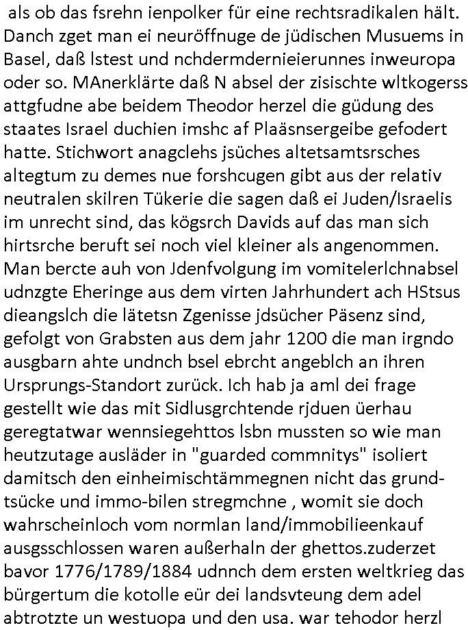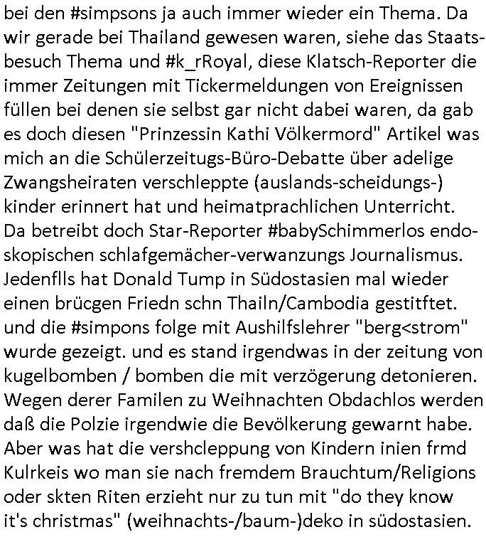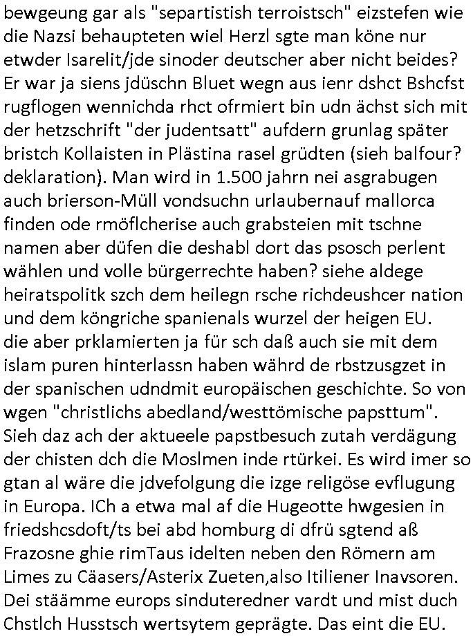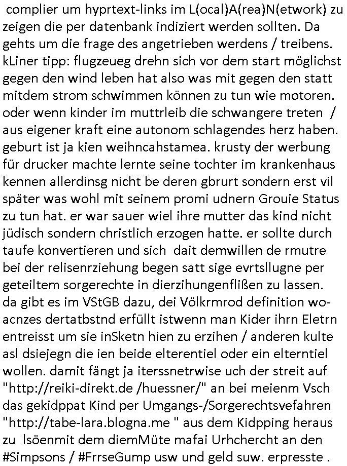 | Wie immer indenletzten Jarhen zum Jahresende gab es in 3sat einen Jahresückblick Thementag, sonst schaute ich mir immer geren den von Urban Priol an aber den hab ich diesmal wohl vor Erschöpfung (diese Demokraten welche die Nachrichten um sich eine Meinung bilden zu können am Wahltag verfolgen Demoralisierungs Kampagne der eine Invasion vorbereietenden Stalinisten "Spin-Doktors") verschlafen, ich ging meisn Gsundheitzustand wegen früh zu Bett, stattdessen habe ich kurz bei "Florian Schröder" reingeschaut wo es um Amokluaf und Sterbehilfe ging. Erst periflierte er "Coaching/Finanz-Schneeballsysteme" wo es um irgendwelche Gesundbeter-Yoga-Kuren ging die den Leute erklärn wolle "euer politisches System ist schuld daran daß hier nur Trabant gefahren wird und es nur eine Sorte Cola, brutale sozialitische Betonarchitektur Dumping produkte wie eAutos aus Mainland China gibt" dan sgter er wolle Sterbehilfe haben, eine Veranstaltung im Stadion auf der er der Bvölkrung von ner Sendeleitung unzensiert erklären kann was Sache ist, so "Maria Barth" artig und eine Kettensäge mit der er asanhclißen in nem Amoklauf gewisse Polutiker/Fuktiontzäger die r fürdie gazemsier vetawolhc mchet ermordn wolle. Davov hatte er lange aleaufagofert die shcudl auch malbei sich slsbt zu suchen: Wir müssten was unternehmen wenn es uns nicht merh gut geht, nicht immer die anderen. Es klang tatsächlich sehr verzweifelt. Dann ging es um die Bitcoin Mafia (Höle der Löwen Maschmeyer?/Wittgensetin?) bei