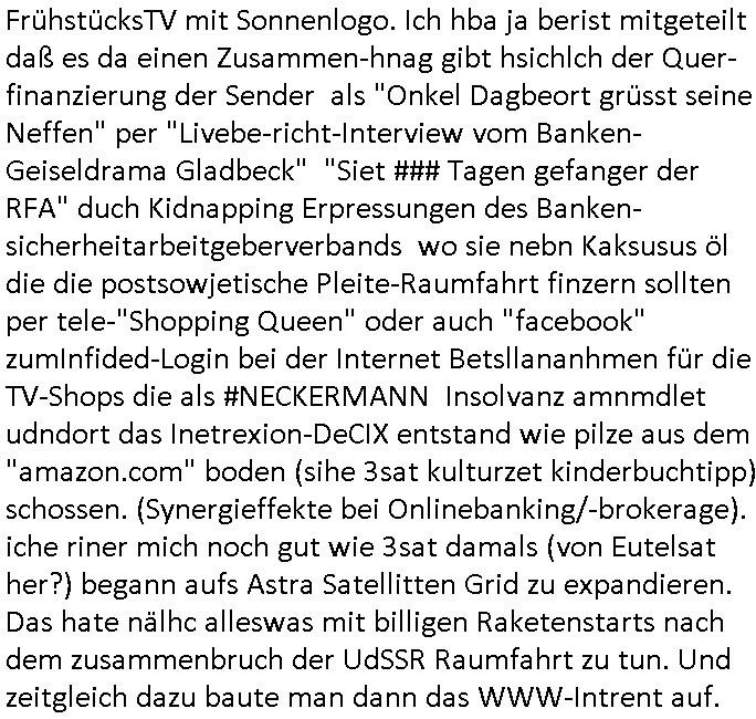 | RTL streicht 600 Stellen und der Bundesmarine Sprachge-brauch irgendwelcher Militärdiktator wannabe geschäft-en-führer setzt sich in der BILD/Medienlandschaft durch (ein sogenannter C*O der "Leo Kirch" RTL Gruppe was ist das bitteschön? ich kenn nur "'managing' oder 'executive' directors" im angelsächsischen/internationalen umfeld). Passend dazu streicht die Schweiz Übersetzern die sowas weiss müssen im SRF also 3sat/Swissinfo-Website Gelder. Immer daran denken, Im internationalen Umfled können Geschäftspartner mit PLCs oder Ltd.s mehr anfagen als 'exotischen' deutschen Rechtsformen wie der GmbH/AG. Ich muß jedenfalls immer grinsen wenn ich "CEO" irgend-wo lese, das deutet auf Miltärputschisten/Kidnapper hin. Ich eriner mal an die großen Gerichts-Prozesse die RTLs Ludwig Thoma damals mit der Deutschen Bank ausfocht zu Zeiten der angeblichen "Metallgesellschaft Öl" Krise. Wo sich die Bank als Sachwalter enteigneten jüdischen Alteigentums das imRhmen neur egstz zur wiederver-eigung zurückggeeben werdne solle ausgeben und so den Aufsichtsrat und Vorstand neu besetzen wollte mit putschenden Ostblock/asiatischen udn britischen Reiter-cliquene Militärs und KGB Agenten die so den Rohstoff-konzern kapern wollten um ELF AQUTAINE / NORTH-STREAM / AGSZPOM / NAWALNY artg mit an Moskaus Zoll vorbei geleitetm KAuskause - Öl/Gasgeschäft-Geld den Putsch gegen Gorbatschow duch Jtezins miltärs zu finanzieren und Wahlkämpfe von Putin und Klitschko.