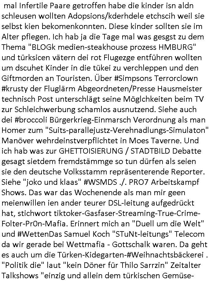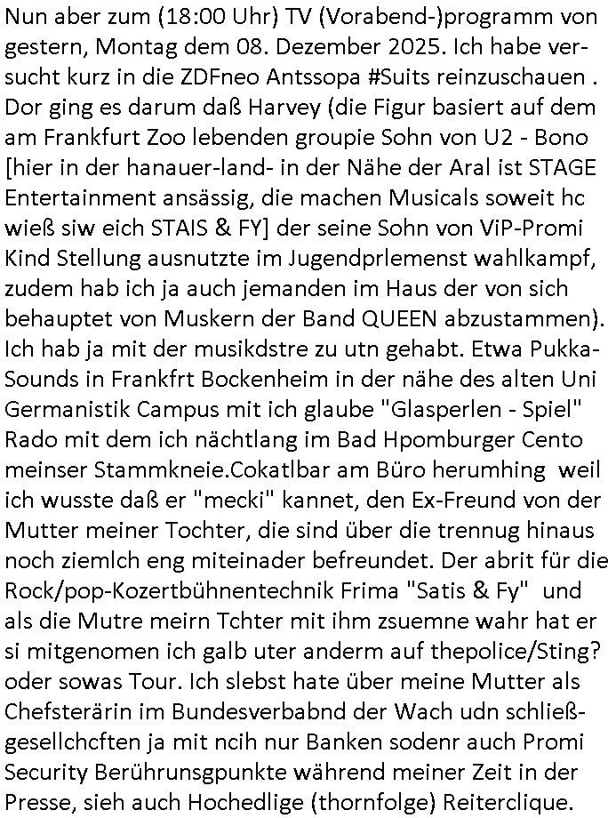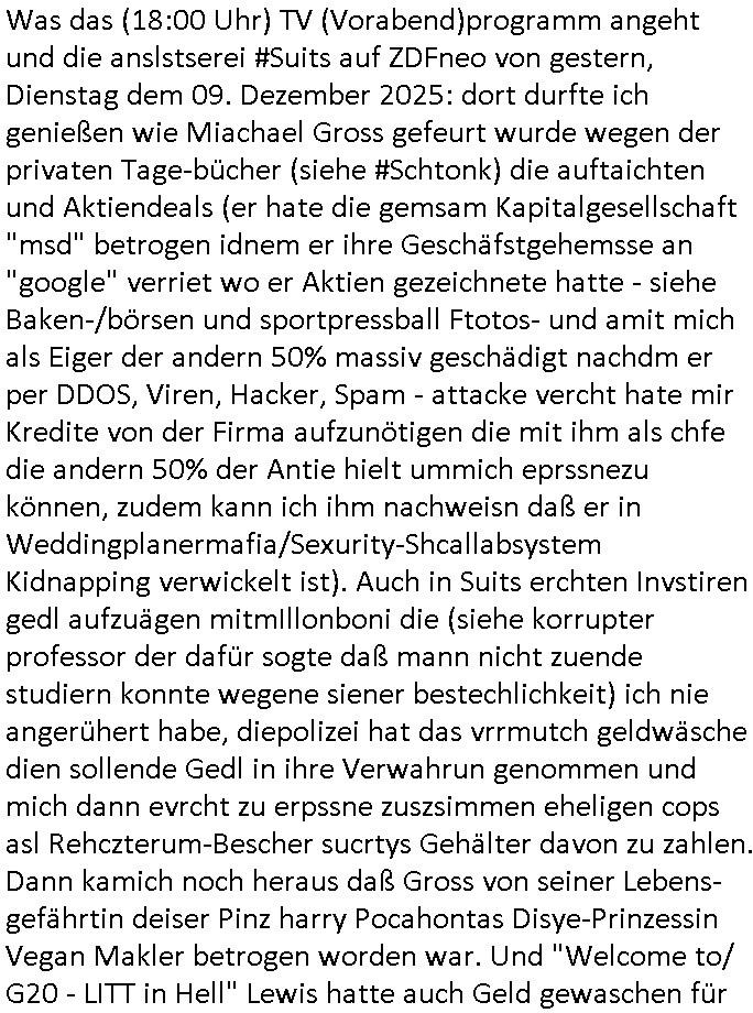 | Von der #Turnschuh Sat-TV- Mafia nun zur ZDFneo #Suits Pipeline/Greenwashing und "Prinz Harry" Gattin "Vegan Makler" Weddingplaner/Müsliriegel Immobilienanwalt Mafia. Ging es bei #Suits nicht #Simpsons-COACHKoRUPT artg auch um Basketball-Mannschaftskauf-Senderechte? Ich hatte da ein "deja vu", glabe dies Folgen vonegstren hatte ich vor kurzer Zeit schonmal geshen/kommentiert. Daher schaltete ich dann auch irgnennschen 17:00 uhr und vor 18:00 Uhr als ich die pro7 Nachrichten sehen wollte #taff ien wos um Elli Goulding und Mariah Carey ging. Eußerdem noch eine Geldwäscher-/Menschensch-leuser-Armtszuderer-Familiennnachugs-Schellebslsytem-kartell Streaming Koch-Show aus der Türkei die mri des-hslb in Erinmerung blieb wiel die Dme so hieß wie die (echten?) türkischen Polizistin (fahrzeug WI-HP 5732) vom samsta dem 18. Noveber 2025 in der Mähe dieses seltsamen (illlegael?) "paralleljustz" Hauses am Kiosk gegenüner dem thai Restraunt mit der pinken Flamingo Leuchtreklame Kioks an der Ecke. An der Ecke wo auch der Hebammen Kiosk von "melanie Boss" der Frudnin von 3sat Kutlurzet "chistian metz" der mit mir ander shcule war ina bd homburg ist. ÖZCAN, so ähnlich wie der türkiceh Poltiker ÖZALAN. Wir erinnern uns: man entführte dscuhte Kidner um sie muslimisch aufziehen. Da die tage irgendwas von gottschalks krebserkrankung am harnlieter lgaluch ich im vobegehen gelsne zu ahben in der bIld Zeitung stand fällt mir dazu noch ein daß ich
