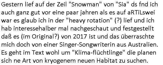 | Gestern lief auf der Zeil "Snowman" von "Sia" ds fnd ich auch ganz gut vor eine paar jahren als es auf aRTiLswei war es glaub ich in der "heavy rotation" (?) lief und ich hab interessehalber mal nachgeschaut und festgestellt daß es (im Original?) von 2017 ist und das überraschte mich doch von einer Singer-Songwriterin aus Australien. Es geht im Text wohl um "Klima-flüchtlinge" die planen sich ne Art von kryogenem neuen Habitat zu suchen.