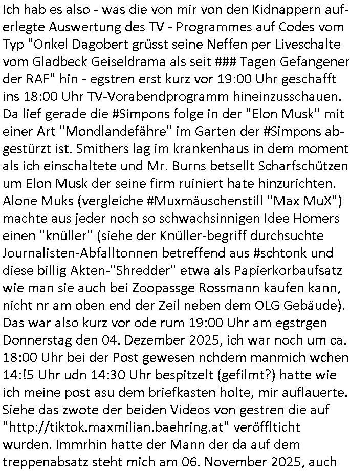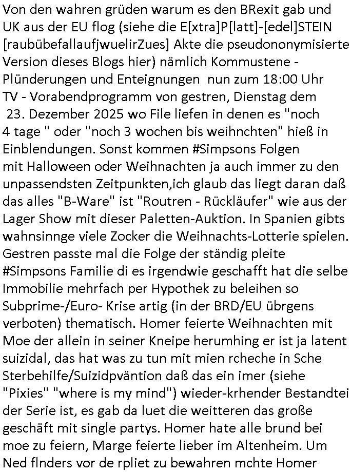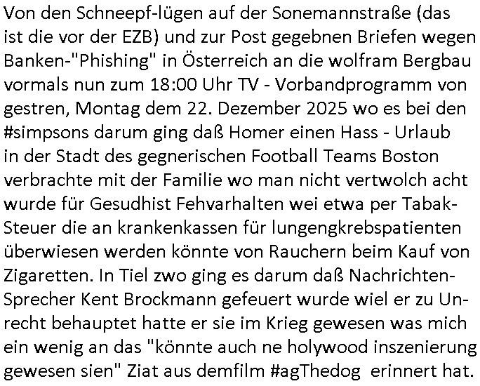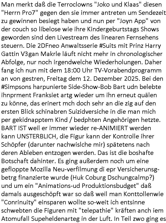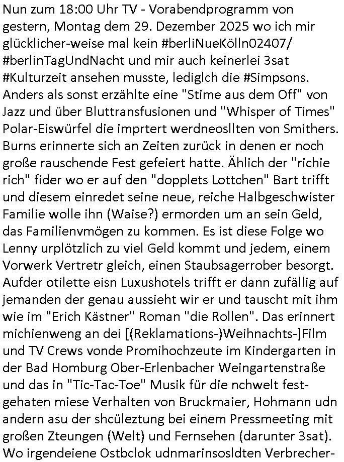 | Nun zum 18:00 Uhr TV - Vorabendprogramm von gestern, Montag dem 29. Dezember 2025 wo ich mir glücklicher-weise mal kein #berliNueKölln02407/ #berlinTagUndNacht und mir auch keinerlei 3sat #Kulturzeit ansehen musste, lediglch die #Simpsons. Anders als sonst erzählte eine "Stime aus dem Off" von Jazz und über Bluttransfusionen und "Whisper of Times" Polar-Eiswürfel die imprtert werdneosllten von Smithers. Burns erinnerte sich an Zeiten zurück in denen er noch große rauschende Fest gefeiert hatte. Ählich der "richie rich" fider wo er auf den "dopplets Lottchen" Bart trifft und diesem einredet seine neue, reiche Halbgeschwister Familie wolle ihn (Waise?) ermorden um an sein Geld, das Familienvmögen zu kommen. Es ist diese Folge wo Lenny urplötzlich zu viel Geld kommt und jedem, einem Vorwerk Vertretr gleich, einen Staubsagerrober besorgt. Aufder otilette eisn Luxushotels trifft er dann zufällig auf jemanden der genau aussieht wir er und tauscht mit ihm wie im "Erich Kästner" Roman "die Rollen". Das erinnert michienweng an dei [(Reklamations-)Weihnachts-]Film und TV Crews vonde Promihochzeute im Kindergarten in der Bad Homburg Ober-Erlenbacher Weingartenstraße und das in "Tic-Tac-Toe" Musik für die nchwelt fest-gehaten miese Verhalten von Bruckmaier, Hohmann udn andern asu der shcüleztung bei einem Pressmeeting mit großen Zteungen (Welt) und Fernsehen (darunter 3sat). Wo irgendeiene Ostbclok udnmarinsosldten Verbrecher-