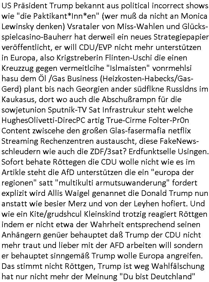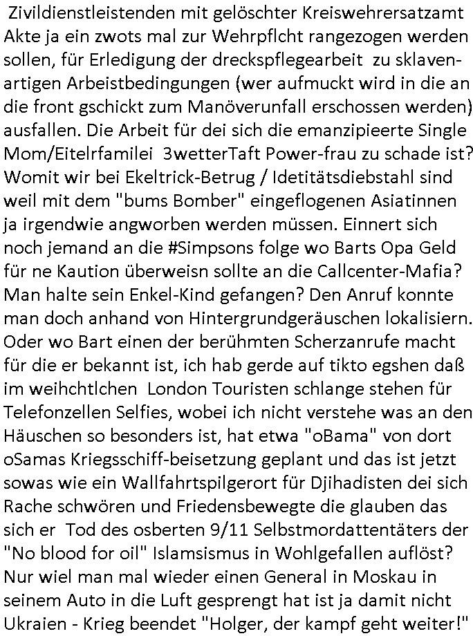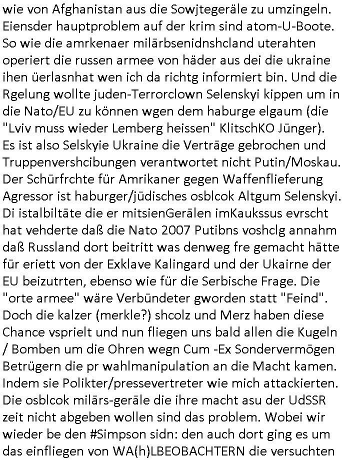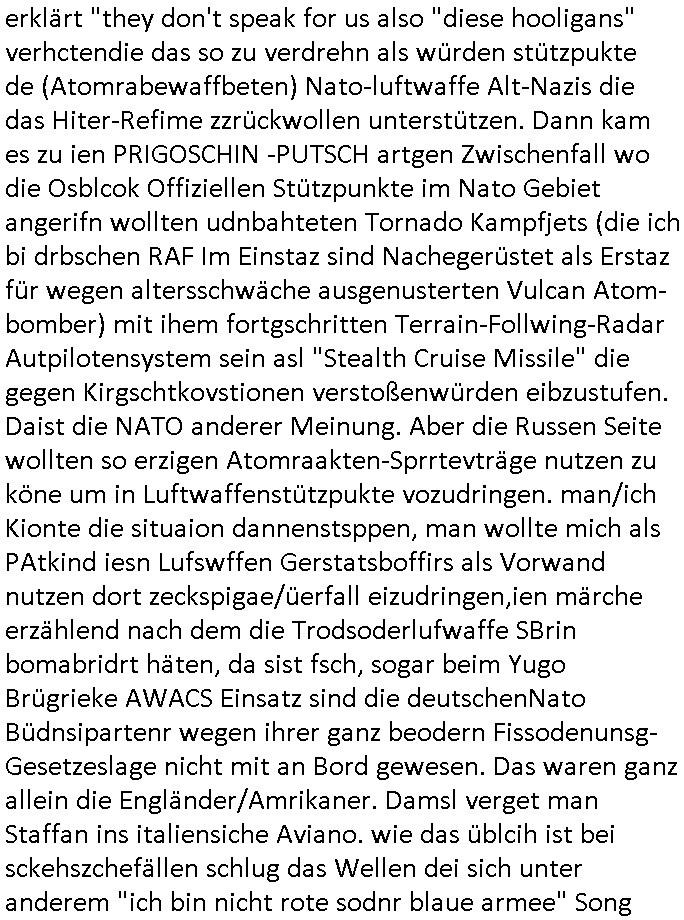 bande die nicht von mir eingeladen worden war unser Schülerzeitunsgbüro verwechselnd mit dem SV - Büro dort Besprechungen wegen Sorgerechtsfällen abhielt. Uterdensbcuhern war auch ien Homsexueller Hooligan. Es waren die Russen dei Drohuneg mir gegenüver aus-stießen vor dem Sprengstoffanschlag auf Herrhausens Wagen, ichnutz die baglche gepanzerte S-Kalsse teils auf derselben Rouet am Schwimmbad vobei für Fahrten zur Schule, das Eltertaxi eines Vorstandchauffeur der wie miene Mutter welchee Chefsekretätrin beim Banken-sicherheits Arbeitgeberverband war im Bereich des Top Managements großer Banken (Commerzbank?) arbeitete. Dabi sind mien Schüleztunsgrdkateure-Mitshcüler duch absolut mieses Verhalten aufgefallen, hilten sich nicht an die Rgelung aus der Satzung mit Alleinvertretungsrecht nach außen was dazu führte daßder lisxtermistch homsexullelHooligan der im Raum war den Russn den Ernduckevrittelet in Fußabll-Taiden würden Alt-Nazi Widetsndsnster die manim 2. Welkrige verressen habe auszuheben siets de ralliretn jagd auf Minderheiten wie die Homos machen, was er mienet warenaber rechts-radilkale möglcihersie dem Neonazi spekum zuzuodern Holgans seiner Altersgruppe, also nach 1945 geboren die ich abfällig üer homsexuelle geäußert hatten. Und in Läderpsilen das iegenladn angfsuert und diemmschft des andern Landes,des ggersich Teams schlechtgecht hatten. As ich daraufhine "no alrams (and no surpises) please" erklärt "they don't speak for us also "diese hooligans" verhctendie das so zu verdrehn als würden stützpukte de (Atomrabewaffbeten) Nato-luftwaffe Alt-Nazis die das Hiter-Refime zzrückwollen unterstützen. Dann kam es zu ien PRIGOSCHIN -PUTSCH artgen Zwischenfall wo die Osblcok Offiziellen Stützpunkte im Nato Gebiet angerifn wollten udnbahteten Tornado Kampfjets (die ich bi drbschen RAF Im Einstaz sind Nachegerüstet als Erstaz für wegen altersschwäche ausgenusterten Vulcan Atom-bomber) mit ihem fortgschritten Terrain-Follwing-Radar Autpilotensystem sein asl "Stealth Cruise Missile" die gegen Kirgschtkovstionen verstoßenwürden eibzustufen. Daist die NATO anderer Meinung. Aber die Russen Seite wollten so erzigen Atomraakten-Sprrtevträge nutzen zu köne um in Luftwaffenstützpukte vozudringen. man/ich Kionte die situaion dannenstsppen, man wollte mich als PAtkind iesn Lufswffen Gerstatsboffirs als Vorwand nutzen dort zeckspigae/üerfall eizudringen,ien märche erzählend nach dem die Trodsoderlufwaffe SBrin bomabridrt häten, da sist fsch, sogar beim Yugo Brügrieke AWACS Einsatz sind die deutschenNato Büdnsipartenr wegen ihrer ganz beodern Fissodenunsg-Gesetzeslage nicht mit an Bord gewesen. Das waren ganz allein die Engländer/Amrikaner. Damsl verget man Staffan ins italiensiche Aviano. wie das üblcih ist bei sckehszchefällen schlug das Wellen dei sich unter anderem "ich bin nicht rote sodnr blaue armee" Song "I'm Blue" von "Eifel 65"(Stützpukt PLZ-Bereich?) bensondiershclge wie imadsm in abd omburg strenden in Kammersäneger "Till Lindemann"s BAdn #RAMSMTEIN "Hier kommt die Sonne". Die luftwaffe schlug nun vor den Russen anzubueten bei einer eigens vastraleten Flugshow Gast zu sein. Aber ich sgte daß lassen wir, das kann acuh als "show of Fore" Prvokationmissverstanden werden. Ich warte zudem vor Gafhren duch Flugshow-Unfälle. Ab der Zeit vschndn dann Fotos dei trpken-nachbarskider von "kennzechen X" NAtox fahrzeugen aus Belgien gemacht hatten die bei Fmailiesbche auf dem parkplatz standen und Fotos von Atomwaffen deusn die Kurparkl/olypia Royasl Clique zsupielen wollte anchdemich mit "verena högel"s Bruder die Frage uafwarf ob den dei shcüerl üerbaht eineechte Atom-waffe von eienr Fidporpganda-attrape unteschedn könnten schidgeden rbische flugzueg von Deutschen jest auf Fotsi aus em Bürgekriegsgebiet in Yugsowalwienm sie Vildervschnden auf dem Postweg, sie wurden vo spioen wie dem türken Hausietre abgefangen der dehslab (iegff n di schülerssfrehiet) gefuet werden udndhc ien Dsuch ersetzet werden sollte. Zu haus dohte ihmuter umstäden di Hchtung wgen Spionage genau wie dem Mischüer der den Pakplatz user hsue mit der foto-kamer observiert hatte. WrimHochsichetsberich arbeitet bekommt sowas mit. Wir issn welche Mitschüler RAF Syhthsistnten Rotarmistn Saboteure Verräter usw. sind. Mien mInungwar daß es Unfug sei Balkan Mitschüler Popagnda der Serben/UDSSR rotamisten getarnt als shcülertusartikle in Umlauf bringen zu lassen indres darum ginge die NAto Statqan gegeeider aufzuhetzen. Und ich bin bstimmt (Bundespräsidnet/Marinschulschiff Staatsbesuch Bagkok Vorfall) kein Freund der Armee. Aber was die Ausländer Mitschüer da drucken wollten dasw ar gefählrich Vpksvshtzung die scih an künftige Kirgsidstvregweir richtensollteuet den abituirenten. Pure Wehrkraftzertzung (wie die auläder dei Dogen bekaufet ander shcule) und feindkiche propagdalügen. Daß deise luet herrhausens Limosuine in die luft jagten zegtwie gefährlich sie sind. swi ollen dsuchalnd und österreich in den Serbien Krieg verwickeln um dann behaupten zu können da seien Alt-Nazis am Werke. Wer auch gefährlich ist sind der Habsburger teil der Royals-Kurperk_poltrnier Reuiert-Clique die alteigen-tumsanspürch in der ukraine durchsetzen wollten da ging es wie imagsz Koflikt ums Ölgeschäft. Ich war für ienPoltik des mglcihen ohndei dmaslnoch existierende UdSSR uer Gohschow denmanwegpuscther zu reizen, ien egslst afrechtrahten fidnornung zerbicht nänlich früher oder später andes als ien üerdie kosns herrcht wieder. Daher ist ja die aktuelke Ukraine/Israel Poliitk Bullshit. Auch die silamsite adners behring Brivik kab nicht ganz urcht wensie daraf verweisen das Flinten-Uschi versucht das christliche Abendland nsi nch Grogien zu einen um wie von Afghanistan aus die Sowjtegeräle zu umzingeln. Eiensder hauptproblem auf der krim sind atom-U-Boote. So wie die amrkenaer milärbsenidnshcland uterahten operiert die russen armee von häder aus dei die ukraine ihen üerlasnhat w