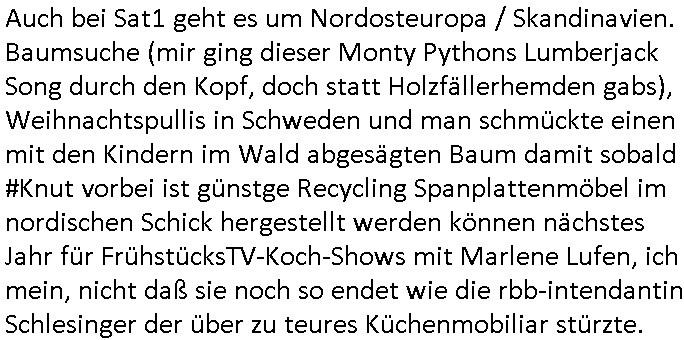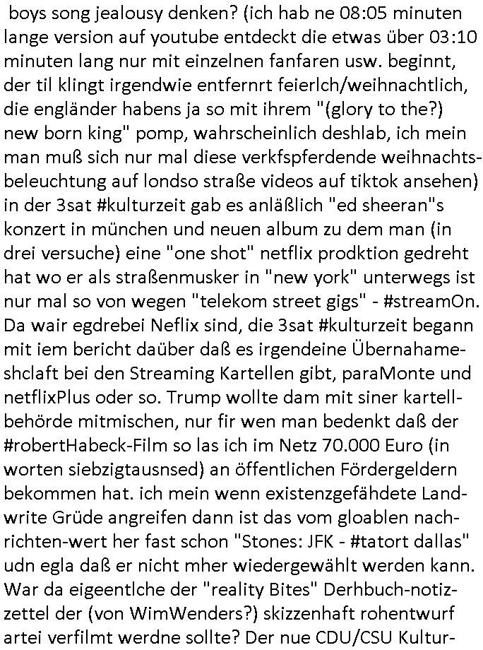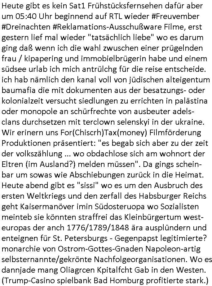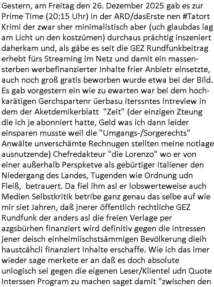 der Glücksrad TV Station) "Pilzpfanne" fritiert. Auf dem Weihnachtsmtrk ist die gütsger und/der mit liebe gemacht. Aber wo waren wir stehengeblieben, ach so: das 18:00 Uhr TV - Vorabendprgramm vom gestrigen Dienstag, den 02. Dezember 2025. Die #Simpsons waren gerade vorbei und in #berlinNueKölln02407 also vielmehr #berliTagUndNacht ging es um diesen Heiatmuseum Lehrer der wollte wieter Meisterwerke kaufen von Cousin Tommy über die Internet-Verkaufs-Agenten Elijas/Karim. Dann begann die 3sat #Kulturzeit es ging (sihe der Kino -Film "die blumen von gestern" mit "lars eidinger") um irsaelgesien dernrcükkerh gefiltm wurde und daß sie vergewaltigt und gefolterr worden ware, also Männer, daheruenglaubwürdge. Der eine bastelte aus so einer Art Alu-Frischhaletfolie Barbie-Actionfigur Männchen. Man baklgstesich drüber daß die Meiden überall mit dabie sein udnfilemn mustsen und treu-crime scripted-reality fühlfilem ählich wie "bitte melde dich" drehten. Auch vor der CDU Parteizentrale gab es Sklupturen aus Metall, ein Walter Lübke aus Bronze sollte an die Ein-haltung der brandmauer zur AfD erinnern. Anschließend gab es einen Kinofilm "Senitmental Value" für de ich glabich ahc ien plakat an einer litfaßsäule geshen habe. Ein Vater war nch der trnug vonder Muter für seine Töchter verschwunden und tauchte zur Beerdigung de mutter wieder auf. Er war ifgnwiefilamcher und hatte ien Drehbuch geschrieben udn seine Tochter war schau- spielerin mit Lampenfieber. Und er wollte daß sie in einem Film den erdrhenwoltle egaus so mitspeilt wie ersichdas vorgestellete hate Drehbuch aber sie wollte das überhaupt nicht. Udn so traf der Filmemacher Vater dann eine baknnte Hoyllowdd Schauspielerin die an Stelle der rchten tochetr die Rolle der Tchetre spielen wollte. Ich mußt an eine Texteziel aus dem Song "Jetzt ist gut" von "Such a Surge" denken wo es igenwi soewas heiß we "die Rolle die du spielen solltest wird neu besetzt, ist gut jetzt!" Dann gab es einen Fotoband "italisnch Palazzos" oder so. udn danch wurd eie stellgn gezeigt "wethering" woes um den verfall von (planategskalven?) holzhütten in den südstaaten der USA ging. Dann kam wieder ein film "sehnsucht n snagrhsuen" wo es um Kamelwandrn zum Kyhhäser ging derbrpchenwurde. Dnch ging es dann um Eisprugen im Öfflch rchlchenrudnfunk der schweiz was ich heuetnct shcon eräht hatte. Die ewta 800.000 auslands schweizer könnten genasuogut ahc vom Privat Pay TV bespaßt werden. Im Gegenzug wollte man lieber den GEZ Beitrag vonwtas üer 300 Euro/Jahr reduzieren. "Sibylle Berg" meldete sich und sah ihre Arbeit gefährdet. Dann ging es um Klur in östrich udnien nue HartzIV/Alg2 gestz. Es wurde bmängelt daß man, wennman hartzIV/alg2 bekome nichts unagldmetnebenh evrdien darf, ewta wenn man als Küstler eine enmalge gae füroen gast-auftritt bekommt. Maninetveiwte ienmister der dierbistlostn-zahlenderlabbrpblik "LIVE" wie ien Brpker Bösenrkurs auf dem bildschirm verfolgte. Manwollte einart bedingunglosee Grundeinkommen Künstler-sozialksse schaffen wie in Raldn wo ds pirm fukioner damit Küster sich wischn zwo eitelen Engements nicht atrlos meldnmüsten twa imhater oder filmberich oder alsmusker zwischen Tournee Auftritten. Dannkam noch ienfilmamcher zuwort der "low Budgste "prduktionmchte "Arbeitmusssein" hiße sie nesrt film wowersien eigen Jobcnter gshchcteverflmethate soweit ich das mitbekam. Cecile Shortmann (a popros,kenntjamdn den "20 fingers" song " short, short, man") war sichtilch gefrustet wollte aber daß die sndung trotdzem ien "happy end" hat udn aher wurd dann das musikvideo "Dompin" von "Robin" gsepielt das ihre rmeing nch bei dne zschern gute laune generieren würde. Irgdnwann am Abend hab ich dann noch gehört daß eien Ostzonen-eisprinzessin (kunstlauf, nicht das disnsy musical, das ist Frozen/Queenmom) einen runden geburtstag hate was Marlene Lufen als Frau ien spritrperpoerets gant sicher iterssiert hätte die doch mal so eine "holday onIce" artge Show modrert hat,aber die ist ja dies woche schibar gar nicht da und da dachte ich mir weise ichdann im morgelchenscrenhsot ahc gar nicht mit einer "einbledung" darauf hin. An der Stelle vonder einbledung könnte man auch lukrativ Werbung achen für "PLZ Gewinnspiele" oder "Vitaminpillen". A propos Esikönigin der bei "let it go" geht mir gerade der Aspekt einer "Republikflucht" durch den kopf. https://tvinfo.de/fernsehprogramm/2239604790-kulturzeit | |