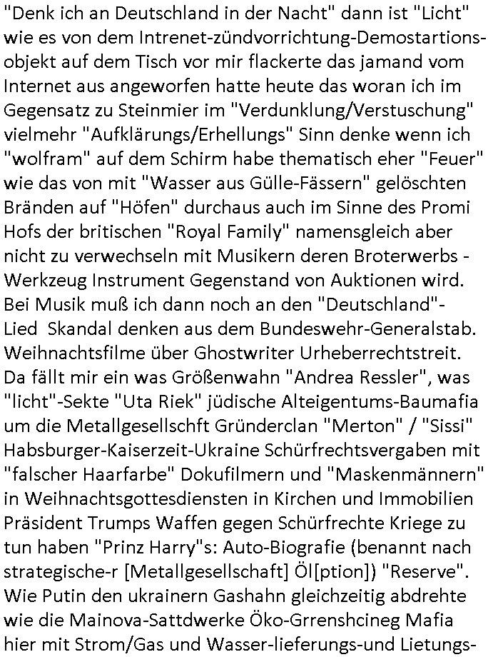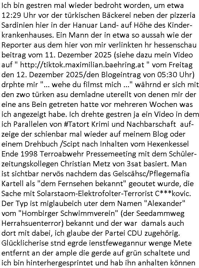 ist doch bestimmt ein Künstler- und kein richtiger Name, Thiel Kollege von Prof. Börne im ARD Tatort Krimi)! Ich habe Sie eben in „Hallo Deutschland“ gesehen im per DVB-S Astra-Sat 11362/H/21999 ohne dafür GEZ-Zwansgabo-Gebühren zu bezahlen auf meinem West-„Russen Receiver“ (der lineares youtube-fernsehen nur ohne mit Internet per Musk-Starlink mit teurel inklusivprepaiddatenvolumen nachkadekarten artig) den ZDF Live-Stream auf meinen alten Röhrenfrensher (anstatt Thin-Film- Transistor-Display: der Tonqualität wegen?) beamt. Da haben sie am 02. Dezember 2025 zwischen 05:00 Uhr und 05:30 Uhr einen Einsatz gehabt der wie üblich beider deutschen Polizei mal wieder voll danebenging, mit einem Typen auf den Gleisen. Kleiner Tipp: Im Modellbau gibt es Sensoren für Personenerfassung und im „auto motor sport TV“ oder so (läzft seit 30 jahren auf vox, ich glaub „Grips mit Autodoktoren“) wurden Bremsassistenz-systeme für Weihnachtsmarkt-Amok-fahrer Modell „Panzersperren für den Platz des himmlischen Friedens“ getestet mit deren Nachrüstung man sowas hätte möglicherweise verhindern können. Ich hatte hier ein paar Meter von der EZB (Europäuschen Zentral Bank) in Frankfurt a.M. entfernt mal ein Frau die mit ihrem Fahrrad vor die Straßenbahn geriet und verunfallte und hab prima Gaffer Fotos schießen und in meinem Online-Tagebuch/[Video-]Blog http://banktunnel.us/pdf.php oder http://blog.sch-einesystem.de und für diejenigeb die bewegtbilder präferieren http://tiktok-maximilian.baehring.at , per SSL/https für geräte die kein http beherrschen auch abrufbar unter der Adresse https://www.zentral-bank.eu/tumblr.com/ veröffentlichen können. Ich hab mal mir Prof. Christian Metz (wie der TV-Geräte Hersteller) von 3sat/ZDF in Mainz, Redaktion Kulturzeit zusammen in der Schülerzeitung der Humbodtschule Bad Homburg zu der wir beide gingen an der Recherche zur Sprengung der gepanzerten S-Klasse lang Limousine des angelch von RAF Terroristen ermordeten Deutsche Bankvorstands Herrhausen im Seedammweg gearbeitet. Der ehemalige Kollege Metz arbeitet laut Sender.an der RWTH Aachen, FÄLLT DOCH IN IHRE ÖRTLCIHE ZUSTÄNDIGKEIT, oder? Ich werde aktuell mit entführtem Kind (tabe lara Riek *19.09.2000) bedroht im Verfahren gegen Terroristin „Daniela Klette“ am OLG Celle nicht auszusagen, mien Post wird abgefangen und die amerkaner hören mit Gerichts-beschluss nach einer Hausdurchsuchung hier mein Telefon ab. Der Gerichtbeschluss findet sich eingescannt bei den tausnden Seiten Prozess-Akten im Blog. Ich hab mich damals auch mit dem Thema „Generalprävention“ per dem was wir heute „social media“ nennen beshcäftigt, beginnd mit „nZSI RAUS grafttis auf OSTPREUSSEN Alteigentum“ meine mich zu erinnern mal mit „Dr. Benecke“ dem Forensiker und Kölner OB Kabdidat der Spaßpartei „die Parte“ des Satiremagazins Titanic unterhalten zuhaben dazu.daß man Straftaten wie „vor den Zug werfen Suizide“ besser im Vorfeld verhindert als sie geschehen zu lassen. Dazu wollte ich Tagebücher und Nachlässe per journalistischer Recherche auswerten, es gibt beispiels-weise Bücher die „Kamikaze Träume“ / „Gedichte die einer schreib bevor er aus dem Hochhaus-fenster sprang“ heißen von „Charles Bukowksi“, bekannt für seine „James Joyce/RTL2 hartes Deutschland“ scripetd reality artigen Obdachslosen-/Trinkerromane Vorlgan für Hollywood Verfilmugen wie „leaving Las Vegas“. mit “Nicholas Cage“ wo es um die Frage geht warum sich jedes jahr zigtausnde Männer bewusst zu Tode trinken oder in [sic!] Züge laufen, Ich hab aktuell knapp 34.750 Seiten (as PDF Dateien downloadbares) Material zusammen-getragen – ALLES ECHT – KEINE ÜBUNG - die ganz dringend beweisgsichert werden müssen da man meine Leitungen/Server per Hackerattacken (auch aufs Stromnetz hier an dem Sreverhägen) lahmzulegen versucht, ich nicht weiß wie lange ich das noch am Laufen halte kann. | |