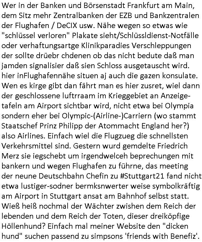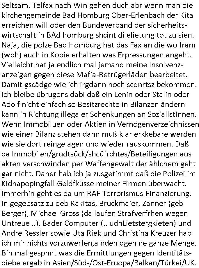 | Großstörung im Onlinebanking deutscher Kreditinstitute von Frankfurt (wo Deutschlands größter Netzknoten sitzt) aus rchtung Bakntümer/Börse Frankfurt und zwar richtig die ganz großen geschäftsbanken mit Millionen Kunden. Und Postsendungen an die Terrorabwehr werden falsch berechnet so daß man noch den Unschalg tauschen und ein paar Seiten dazuschummeln kann ohe daß es auffällt. Da geht es inhaltich um Sprengstoffanschläge auch udn explizet gegen die vond er Störung betroffenen Banken. Als ich nachfragen will ob wenigstens meine Telefaxe durchgehen werde ich als Hustbesltunsgzge verarscht amanshcluss des grichts, eine nebestelle die ein Telefon sein soll laut f+r Teerowawer setsanzlcih zustöder GStA nimmt plötzlich keine Sprachanrufe mehr sondern dem pipsennche Telefaxe entgegen. Ob das an den Korruptions Problemen bei der EDV/IT Beschaffung liegt? Zeitnah werden an der Uni Klinik Gießen/Marburg wo ja die Polizei/Justz Äzrteshcft ihre zentrale hat Patienten er-schossen. Dann veröfflicht der hr auf der hessenschau website ienartikel zum Tatrot Kirm gestren wonach Fälle in Sorgerechtschen plötzlich am Landgericht verandelt werden. Das ist aber als Instanz gar nicht zuständig. Ls ich das nochmal nachschlage habe ich auch ein deja vu hin-sichtlich der seit 1945 geäderte eigenstädgkeit des OLG in Vorkriegsendezeit unde der OLG Zweigtselle in Kassel. Das sihe as als habe irgndwer ganz gezielt Verfahren an sich gezogen (da könnte es um Vermögenssorge gehen).