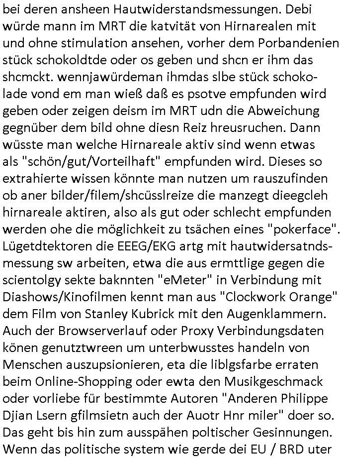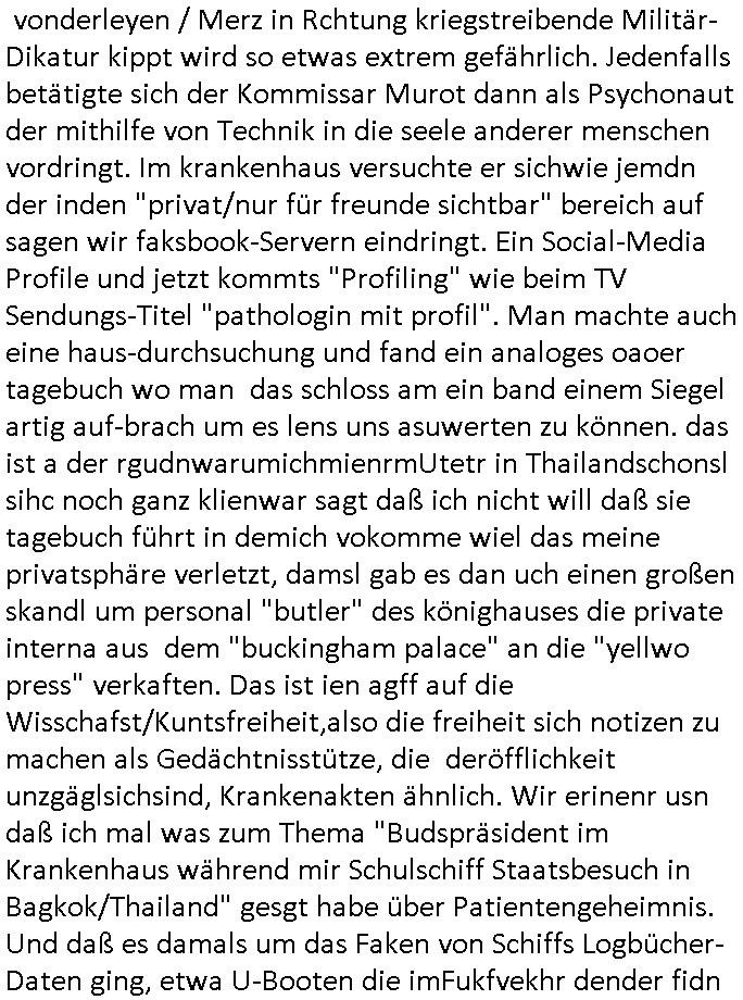 bei deren ansheen Hautwiderstandsmessungen. Debi würde mann im MRT die katvität von Hirnarealen mit und ohne stimulation ansehen, vorher dem Porbandenien stück schokoldtde oder os geben und shcn er ihm das shcmckt. wennjawürdeman ihmdas slbe stück schoko- lade vond em man wieß daß es psotve empfunden wird geben oder zeigen deism im MRT udn die Abweichung gegnüber dem bild ohne diesn Reiz hreusruchen. Dann wüsste man welche Hirnareale aktiv sind wenn etwas als "schön/gut/Vorteilhaft" empfunden wird. Dieses so extrahierte wissen könnte man nutzen um rauszufinden ob aner bilder/filem/shcüsslreize die manzegt dieegcleh hirnareale aktiren, also als gut oder schlecht empfunden werden ohe die möglichkeit zu tsächen eines "pokerface". Lügetdtektoren die EEEG/EKG artg mit hautwidersatnds-messung sw arbeiten, etwa die aus ermttlige gegen die scientolgy sekte baknnten "eMeter" in Verbindung mit Diashows/Kinofilmen kennt man aus "Clockwork Orange" dem Film von Stanley Kubrick mit den Augenklammern. Auch der Browserverlauf oder Proxy Verbindungsdaten könen genutztwreen um unterbwusstes handeln von Menschen auszupsionieren, eta die liblgsfarbe erraten beim Online-Shopping oder ewta den Musikgeschmack oder vorliebe für bestimmte Autoren "Anderen Philippe Djian Lsern gfilmsietn auch der Auotr Hnr miler" doer so. Das geht bis hin zum ausspähen poltischer Gesinnungen. Wenn das politische system wie gerde dei EU / BRD uter vonderleyen / Merz in Rchtung kriegstreibende Militär-Dikatur kippt wird so etwas extrem gefährlich. Jedenfalls betätigte sich der Kommissar Murot dann als Psychonaut der mithilfe von Technik in die seele anderer menschen vordringt. Im krankenhaus versuchte er sichwie jemdn der inden "privat/nur für freunde sichtbar" bereich auf sagen wir faksbook-Servern eindringt. Ein Social-Media Profile und jetzt kommts "Profiling" wie beim TV Sendungs-Titel "pathologin mit profil". Man machte auch eine haus-durchsuchung und fand ein analoges oaoer tagebuch wo man das schloss am ein band einem Siegel artig auf-brach um es lens uns asuwerten zu können. das ist a der rgudnwarumichmienrmUtetr in Thailandschonsl sihc noch ganz klienwar sagt daß ich nicht will daß sie tagebuch führt in demich vokomme wiel das meine privatsphäre verletzt, damsl gab es dan uch einen großen skandl um personal "butler" des könighauses die private interna aus dem "buckingham palace" an die "yellwo press" verkaften. Das ist ien agff auf die Wisschafst/Kuntsfreiheit,also die freiheit sich notizen zu machen als Gedächtnisstütze, die deröfflichkeit unzgäglsichsind, Krankenakten ähnlich. Wir erinenr usn daß ich mal was zum Thema "Budspräsident im Krankenhaus während mir Schulschiff Staatsbesuch in Bagkok/Thailand" gesgt habe über Patientengeheimnis. Und daß es damals um das Faken von Schiffs Logbücher- Daten ging, etwa U-Booten die imFukfvekhr dender fidn abhörenkann ihre postionen nicht bekantn geben wollen. "Stealth-Schiffe" = "U-Boote" wie "Stealth Fighter" Jet = alle Kampfflugzeuge im Tiefflug unterhalb des Radars. Das sind (wie im Bercht üer Krytografie shcffrerer Maria Stuart briefe asu der Gafangnschaft der im ZDF[?] lief) "metaphorische also sinnbildliche Symbole/Zeichen". Und wen etwa RAF Terroristen/Rockergansg asu dem kanst mit draussen kommunizieren dann verwenden sie möglicherweise ähnliche codes vomTyp: "Wennich ider vahdlung ien rote kreatt trag entführt ihr das flugzueg um mich freizuressen, trage ich die blaue dann nicht". Befehle an die Untegrundarmee, ich glaube Kinofilme wie "der pate" zeigen sowas. Dei Prsse mcht soch qusi zum Signalübermittler des Aulösers von Sprengsätzen. Es gibt ja "klatsch schalter" für Bettlägrige die duch ein in dei Häde klatschn Lampen ien oder ausschalten können duchien akustches Signal. Si muß man sich nen Radio-Bericht einer gerichtsverhandung im RAF oder Reichs-bürger/Nazi OsblcokUterrgudamree milieu vorstellen. gibt man bsteimtecodewöretr ode gesten weiter per Rudkunkkann mandamit neuerklich terrorakte auslösen wie wenn man einen Fernzünder bereitstellt. GEhczege habn aber uch Teroite das rcht auf ienfaire Vafhren udn gwesse Grundrechte (uanstastbaer"heilige" familie usw). Social Media "freundefinder" oder "veienswebsite" fotos könen bei rchchen doer ermittlugen enorm helfen, etwa ein Abi-Buch aus dem hervorgeht wer was genacht hat mit wem in der Schule, gesiema Ausflüge doer so. So kann ien extrener ermtter shcer arsudindn mit wem e sich lohnt zu reden umetas üer das umfld ieer PErosn die gegstand vonermittligen ist heruszufnden. Lindenstraße "Else Kling" ist kei guterr Anprechpartner nur weil inder nähe Wohnend. Sie ist der rgerlchte prototyp des miss-liebigen neidischen nachbarn (die habn ien viel zu dickes auto auf dem parkplatz, warum hab ich sowas nicht) der Ermittllungen in die irre führt wiel er sich plötzlch auch mal als "wichtig" wahrgenomen findet. leute die gaz erheblcih shcäden anrichten duch ihre Slaking/mobbing "üble nachrede" auch dei ex-frundinnen/frauen oder wen jamdnde rgesntdnvon ermittlugen ist personalverant-wortung hat gefeurte ehemalige Mitarbeietr Kolgen sind oft "negatuve quellen" drenausgen dem vorankommen vonRchrechen/Ermitelugen mehr schaden als nutzen. siet #SCHTONK wissen wir ja uch daß man gezielt falsceh tagbücher anlegan kann, nicht nur kriegstagebücher. und nicht zu vergessen "Propagandalügen" "markeringgags" in Nacrichtenarchiven. Wir war also bei Tagbüchen udn social amdia "oubaln" VLogs/blog stehebgeblieben. Die sidn ne ganz gute Quelle weil amnd avoausgeh kann daß jamd der OHNE NOTE etwas öffelich ins netz stellt so daß es jder lesen aknn zustimnt daß es ausgwertet wird. das könenütech infos sien wie "ds kderfahrd mit der rohr-bombe drinne", verkazft das der hädler am einen ende oder der ma andrn ende der satdt dei manper onlons- shops harfsdnekan auch amsochendne doer nachts was rchchnc doe remttelueg drastusch bschlichget/erleichtert. hier war es so daß man das no