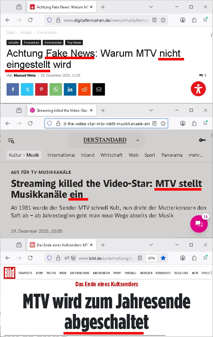 https://www.digitalfernsehen.de/news/inhalte/fernsehen/achtung-fake-news-warum-mtv-nicht-eingestellt-wird-1168921/ https://www.derstandard.at/story/3000000302243/streaming-killed-the-video-star-mtv-stellt-musikkanaele-ein https://www.bild.de/unterhaltung/tv-fernsehformate/das-ende-eines-kultsenders-mtv-wird-zum-jahresende-abgeschaltet-695227a2f6fc544dba9b61f5 https://www.bild.de/politik/ausland-und-internationales/weihnachtswunder-im-weissen-haus-trump-sprecherin-ist-wieder-schwanger-694eebd2ba368aa0126a3fd0 https://www.bild.de/unterhaltung/stars-und-leute/meghan-und-harry-verlieren-elften-pr-profi-in-nur-fuenf-jahren-69500f29ba368aa0126a49e0 Wasn los? Keine "Negermusik" mehr im freeTV? Das gibt Krieg! https://www.telekom.com/de/medien/medieninformationen/detail/magentatv-begeistert-mit-netflix-hit-stranger-things-1099512 | |
