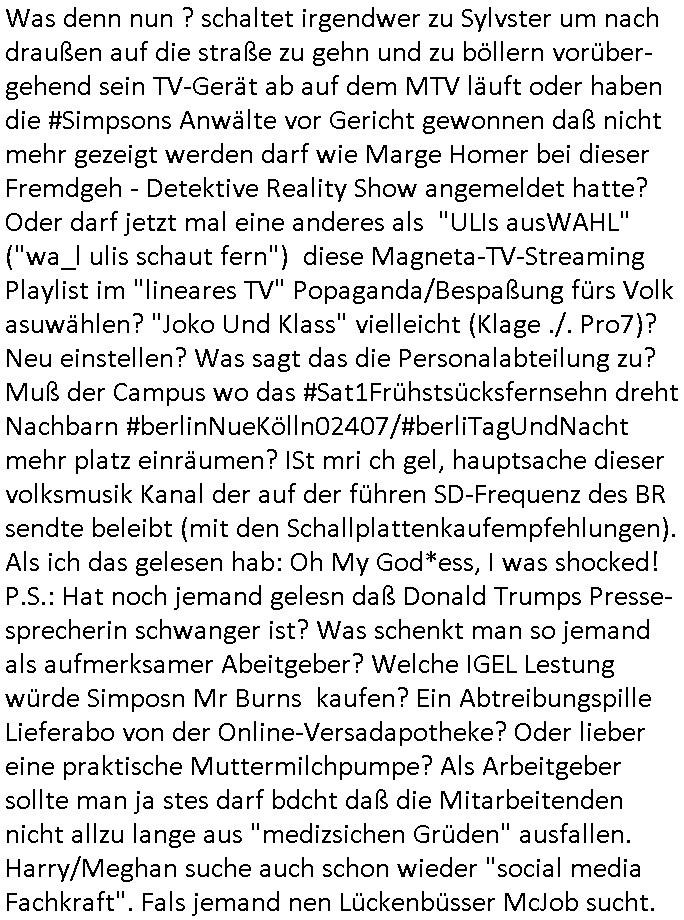 | Was denn nun ? schaltet irgendwer zu Sylvster um nach draußen auf die straße zu gehn und zu böllern vorüber-gehend sein TV-Gerät ab auf dem MTV läuft oder haben die #Simpsons Anwälte vor Gericht gewonnen daß nicht mehr gezeigt werden darf wie Marge Homer bei dieser Fremdgeh - Detektive Reality Show angemeldet hatte? Oder darf jetzt mal eine anderes als "ULIs ausWAHL" ("wa_l ulis schaut fern") diese Magneta-TV-Streaming Playlist im "lineares TV" Popaganda/Bespaßung fürs Volk asuwählen? "Joko Und Klass" vielleicht (Klage ./. Pro7)? Neu einstellen? Was sagt das die Personalabteilung zu? Muß der Campus wo das #Sat1Frühstsücksfernsehn dreht Nachbarn #berlinNueKölln02407/#berliTagUndNacht mehr platz einräumen? ISt mri ch gel, hauptsache dieser volksmusik Kanal der auf der führen SD-Frequenz des BR sendte beleibt (mit den Schallplattenkaufempfehlungen). Als ich das gelesen hab: Oh My God*ess, I was shocked! P.S.: Hat noch jemand gelesn daß Donald Trumps Presse-sprecherin schwanger ist? Was schenkt man so jemand als aufmerksamer Abeitgeber? Welche IGEL Lestung würde Simposn Mr Burns kaufen? Ein Abtreibungspille Lieferabo von der Online-Versadapotheke? Oder lieber eine praktische Muttermilchpumpe? Als Arbeitgeber sollte man ja stes darf bdcht daß die Mitarbeitenden nicht allzu lange aus "medizsichen Grüden" ausfallen. Harry/Meghan suche auch schon wieder "social media Fachkraft". Fals jemand nen Lückenbüsser McJob sucht.