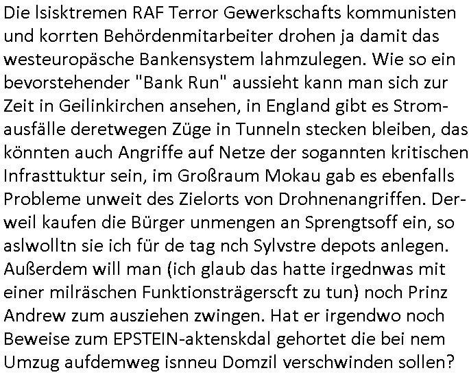 | Die lsisktremen RAF Terror Gewerkschafts kommunisten und korrten Behördenmitarbeiter drohen ja damit das westeuropäsche Bankensystem lahmzulegen. Wie so ein bevorstehender "Bank Run" aussieht kann man sich zur Zeit in Geilinkirchen ansehen, in England gibt es Strom-ausfälle deretwegen Züge in Tunneln stecken bleiben, das könnten auch Angriffe auf Netze der sogannten kritischen Infrasttuktur sein, im Großraum Mokau gab es ebenfalls Probleme unweit des Zielorts von Drohnenangriffen. Der-weil kaufen die Bürger unmengen an Sprengtsoff ein, so aslwolltn sie ich für de tag nch Sylvstre depots anlegen. Außerdem will man (ich glaub das hatte irgednwas mit einer milräschen Funktionsträgerscft zu tun) noch Prinz Andrew zum ausziehen zwingen. Hat er irgendwo noch Beweise zum EPSTEIN-aktenskdal gehortet die bei nem Umzug aufdemweg isnneu Domzil verschwinden sollen?