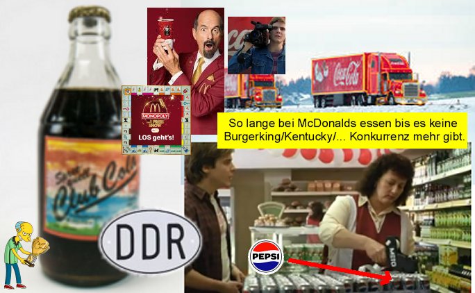 [ DDR "Club Cola" neben "Good Bye Lenin Supermarktregal" darüber Mc.DonaldTRucks ] https://www.youtube.com/watch?v=qyw09D_Ai_s So lange bei McDonalds essen bis es keine Burgerking/Kentucky/... Konkurrenz mehr gibt. | |