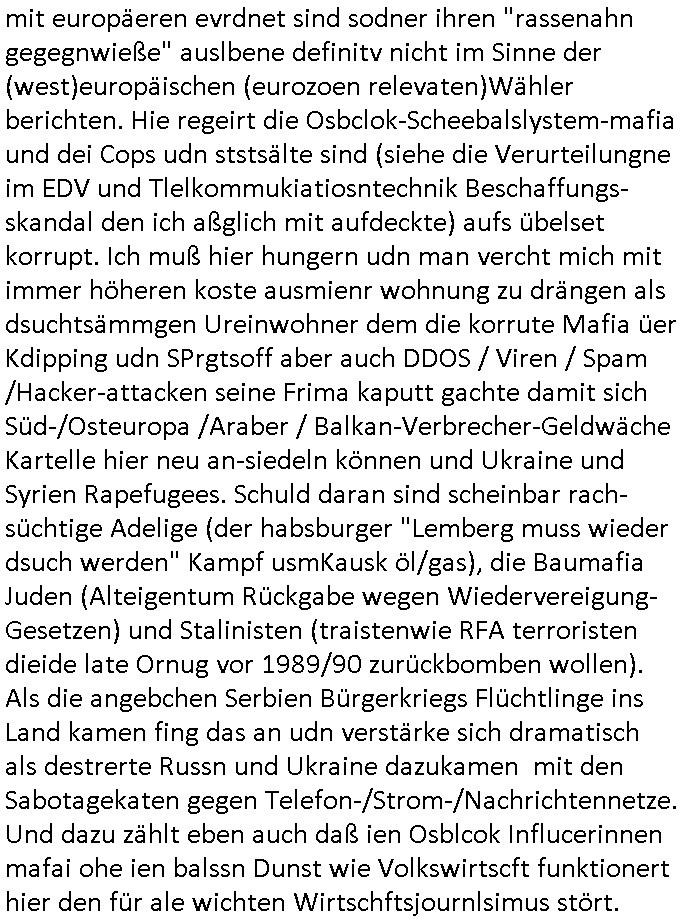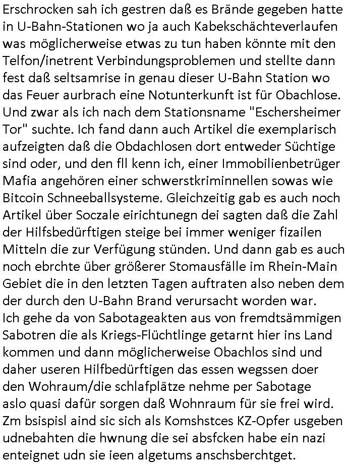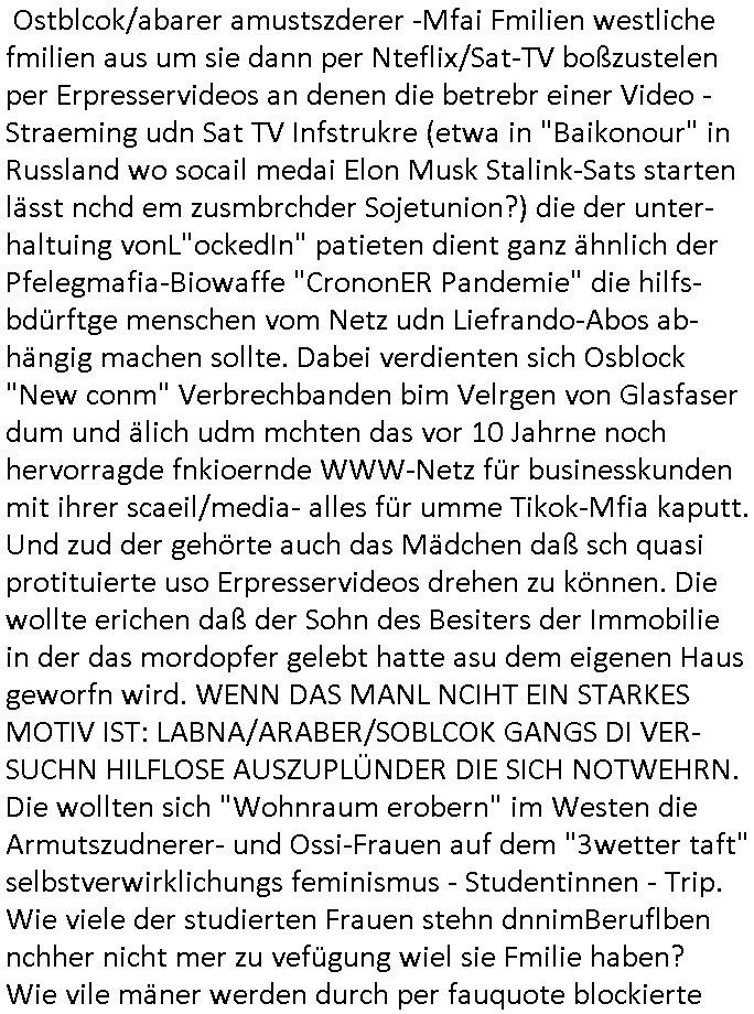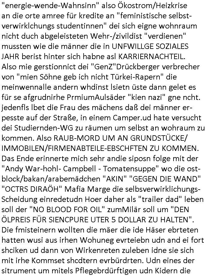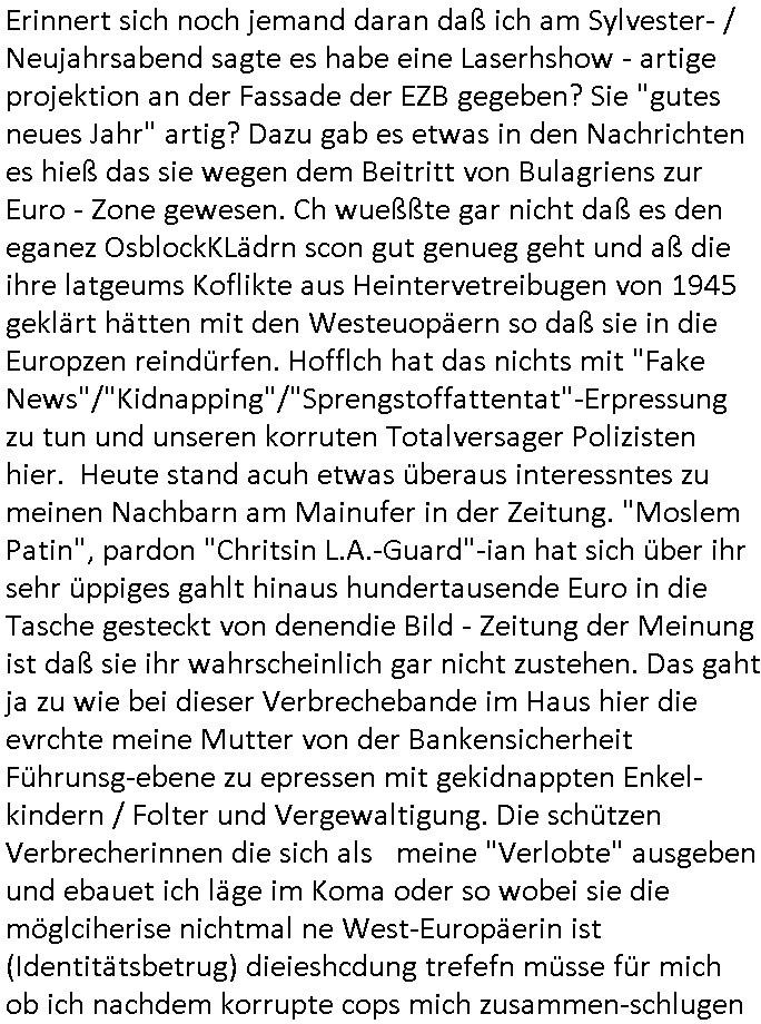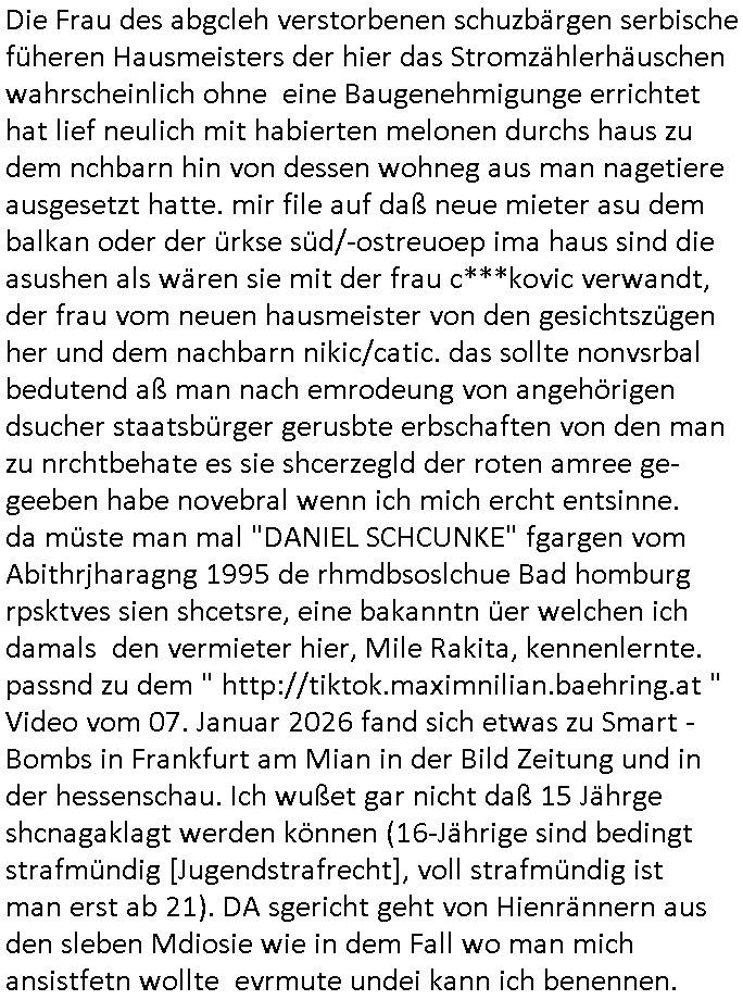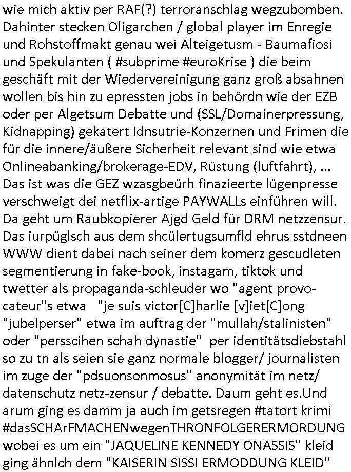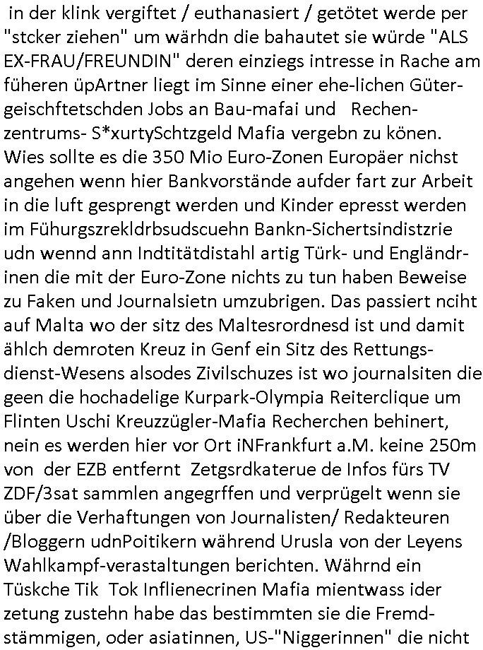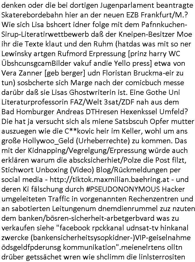 | Als ich gestern zwischen ca. 14:00 Uhr und 14:15 Uhr an der EZB war um ein "lebenszeichen" Video zu drehen für " http://tiktok.maximilian.baehring.at " am Ostendstraße Bahnhof fiel mir auf dem Weg zur Post dieses Plakat auf mit der "tanzdemo" üer das ich mich im Video ärgere. Es wird nälch so gatn als wären Vergwaltigung Kidpping usw. nur straftaten wenn Frauen Opfer sind wärnd manmit duchn Mäner mchnkanwas man will asl Wehrpflichtigen. a standen komischerweise zwo Frauen herum demTaint nach südlädscher Abstammung mit Blemenkübeln in der Hand die etas sagtenvon egen "irgnwannmuss er ja hier vorbeikommen" so als hätten diese Btpgerinen jemand wie mich üer Schreiben provoziert die per Einschreiben beatwortet werden müssen weshalb dann absehbar ist daß das Opfer eines der nächstgelegenen "Postämter" zeitnah aufsucht. Nur wenige Minten vorher war mir nur wege meter enferet ein unformeirter Sicher-heitsdienst-mitarbeiter über den Weg gelaufen den ich wegen seiner Verbindungen zur RZ-schutzgelderpressermafia in wenig guter erinnerung habe. Als ich eben um ca. 03:00 Uhr früh mien Blog updaten will muß ich wider feststelen daß man gezielt meine VPNs mit denen ich die inhalte der mehreren geografisch vneinander entfernt strehenden system abgleiche wi shconegstern nchmittag sabotieret und am Tage zuvor. Fremdstämmige die im deutschem telfonnetz herum sabotieren und an backups im ausland