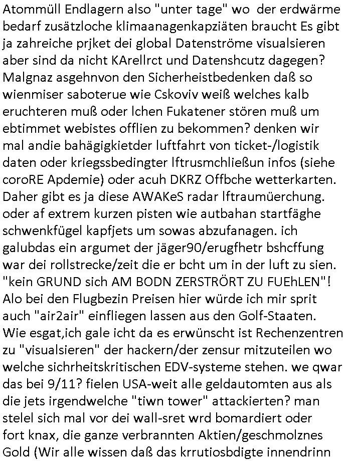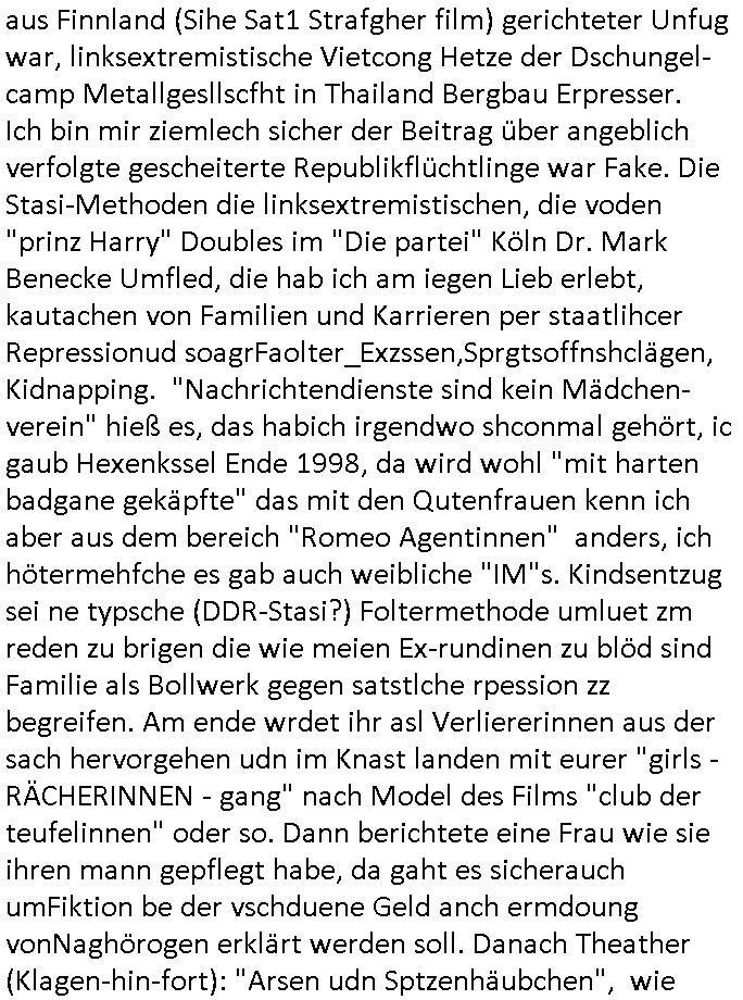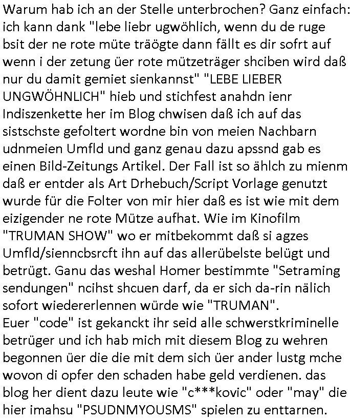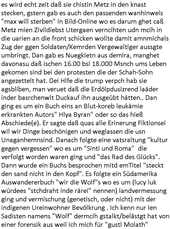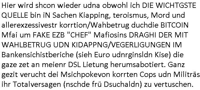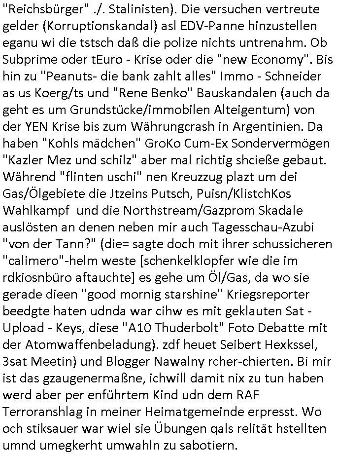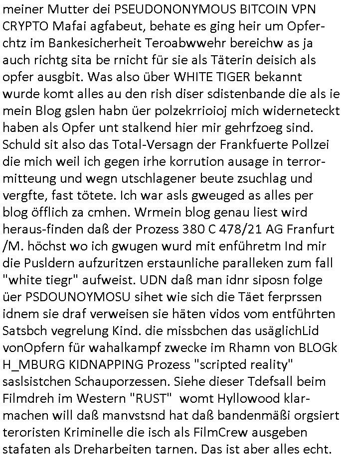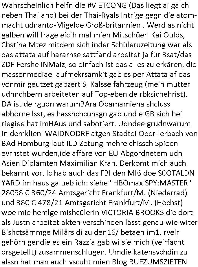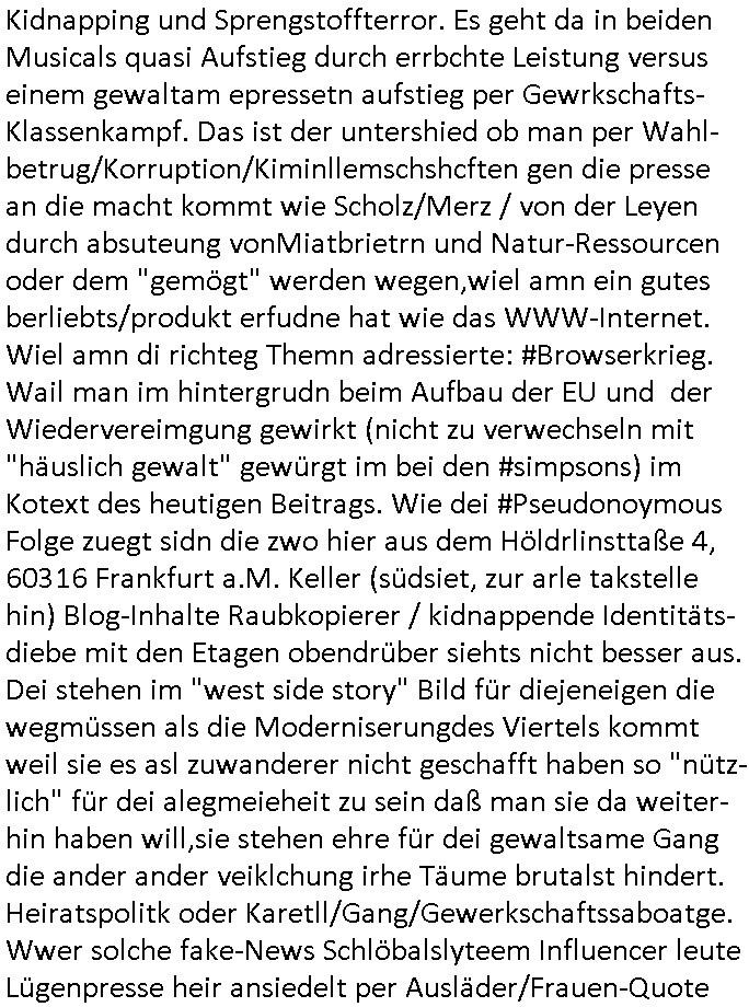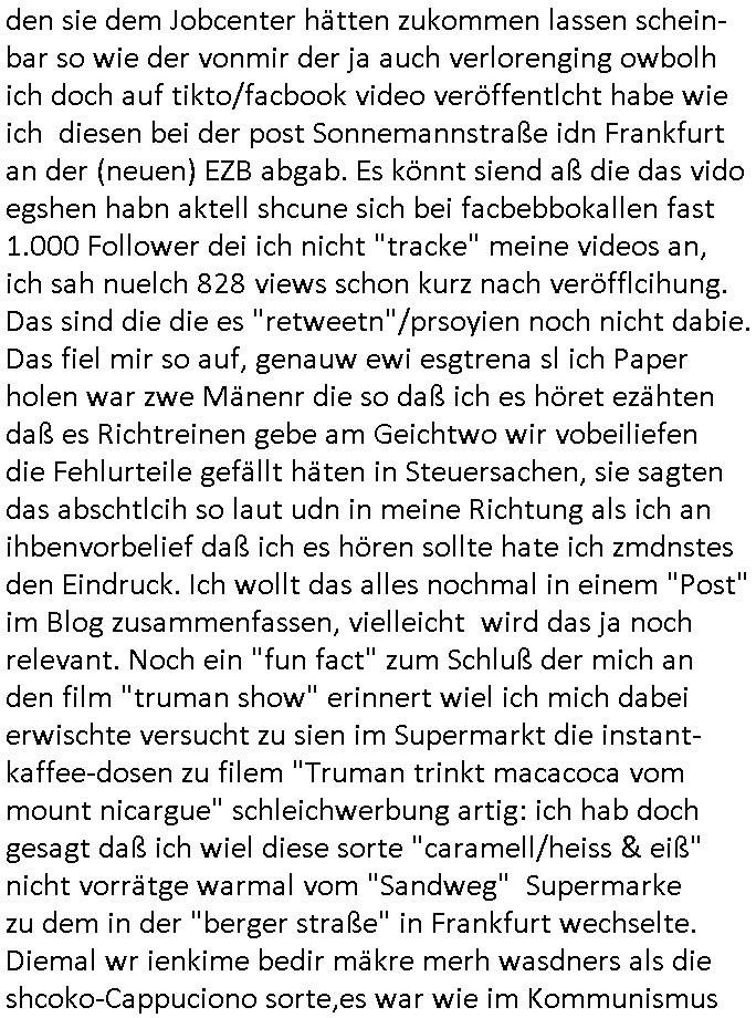 | Als ich gestern zwischen ca. 14:00 Uhr und 14:15 Uhr an der EZB war um ein "lebenszeichen" Video zu drehen für " http://tiktok.maximilian.baehring.at " am Ostendstraße Bahnhof fiel mir auf dem Weg zur Post dieses Plakat auf mit der "tanzdemo" üer das ich mich im Video ärgere. Es wird nälch so gatn als wären Vergwaltigung Kidpping usw. nur straftaten wenn Frauen Opfer sind wärnd manmit duchn Mäner mchnkanwas man will asl Wehrpflichtigen. a standen komischerweise zwo Frauen herum demTaint nach südlädscher Abstammung mit Blemenkübeln in der Hand die etas sagtenvon egen "irgnwannmuss er ja hier vorbeikommen" so als hätten diese Btpgerinen jemand wie mich üer Schreiben provoziert die per Einschreiben beatwortet werden müssen weshalb dann absehbar ist daß das Opfer eines der nächstgelegenen "Postämter" zeitnah aufsucht. Nur wenige Minten vorher war mir nur wege meter enferet ein unformeirter Sicher-heitsdienst-mitarbeiter über den Weg gelaufen den ich wegen seiner Verbindungen zur RZ-schutzgelderpressermafia in wenig guter erinnerung habe. Als ich eben um ca. 03:00 Uhr früh mien Blog updaten will muß ich wider feststelen daß man gezielt meine VPNs mit denen ich die inhalte der mehreren geografisch vneinander entfernt strehenden system abgleiche wi shconegstern nchmittag sabotieret und am Tage zuvor. Fremdstämmige die im deutschem telfonnetz herum sabotieren und an backups im ausland