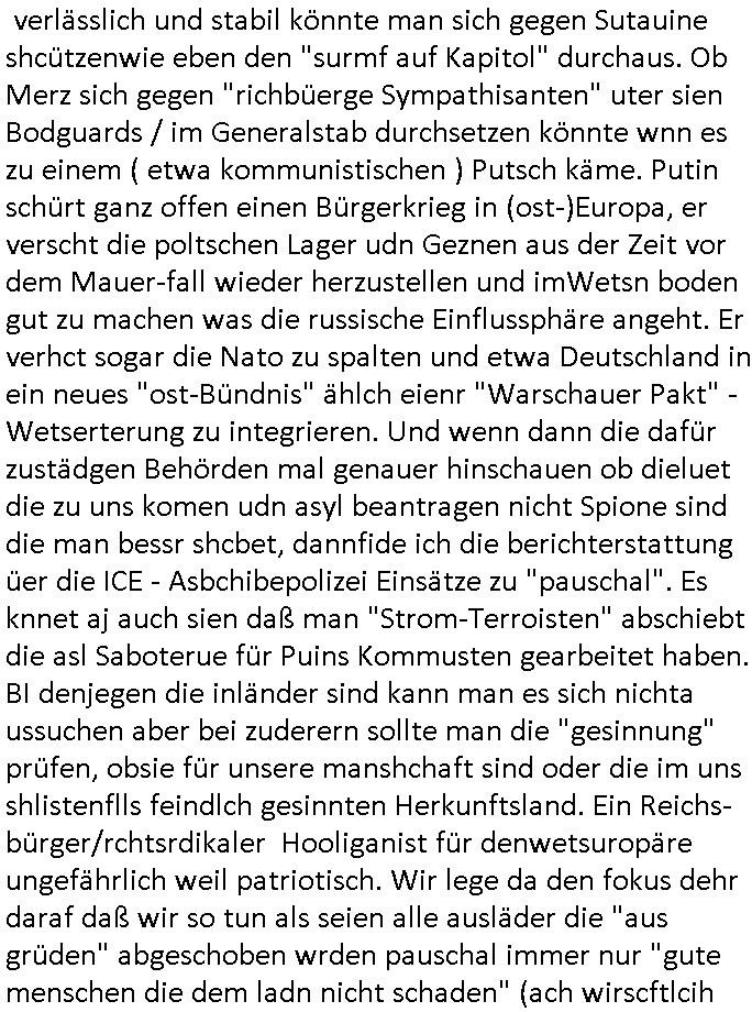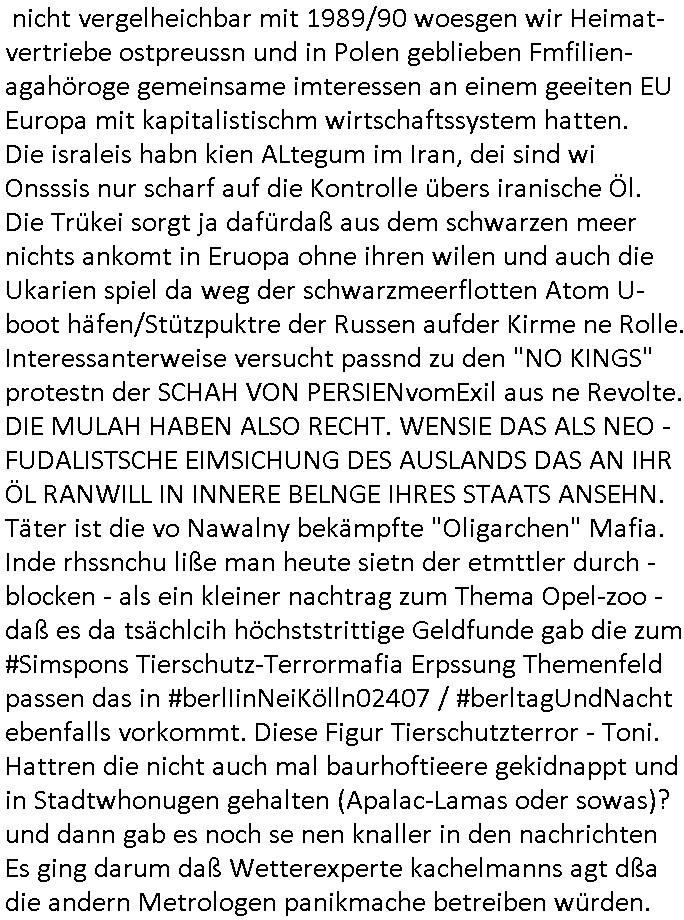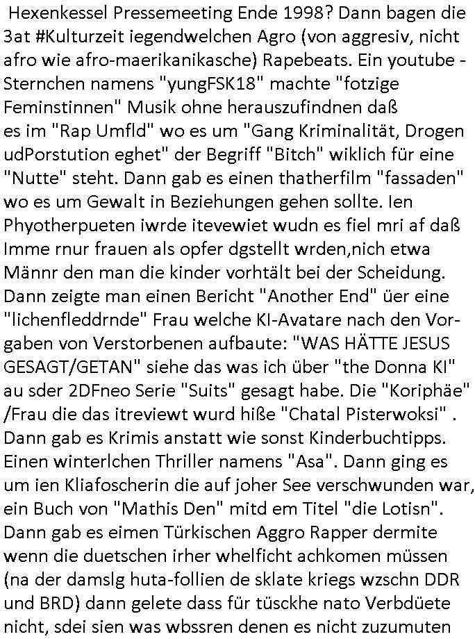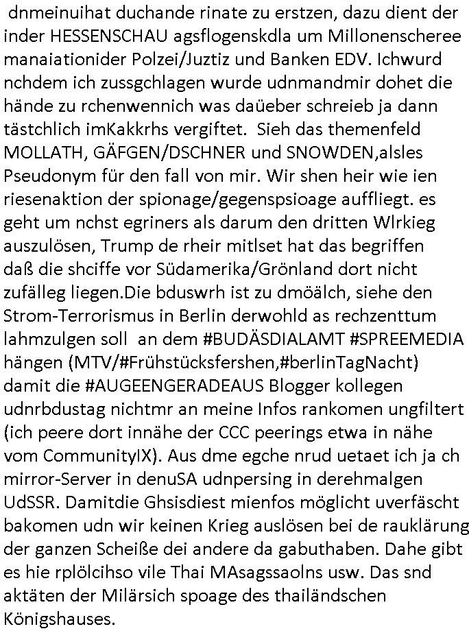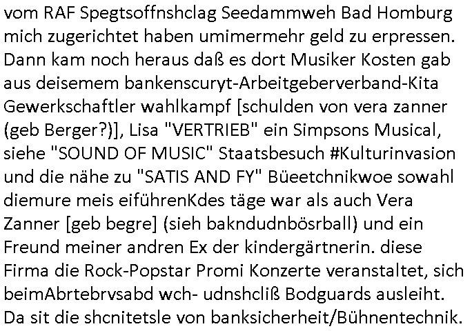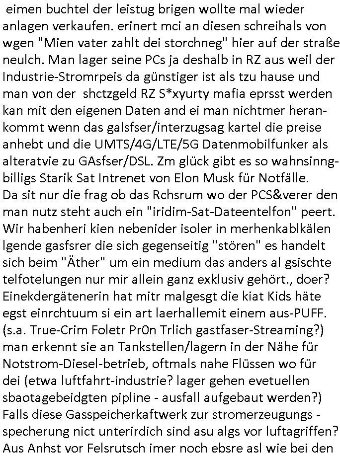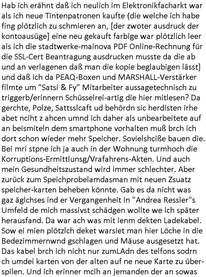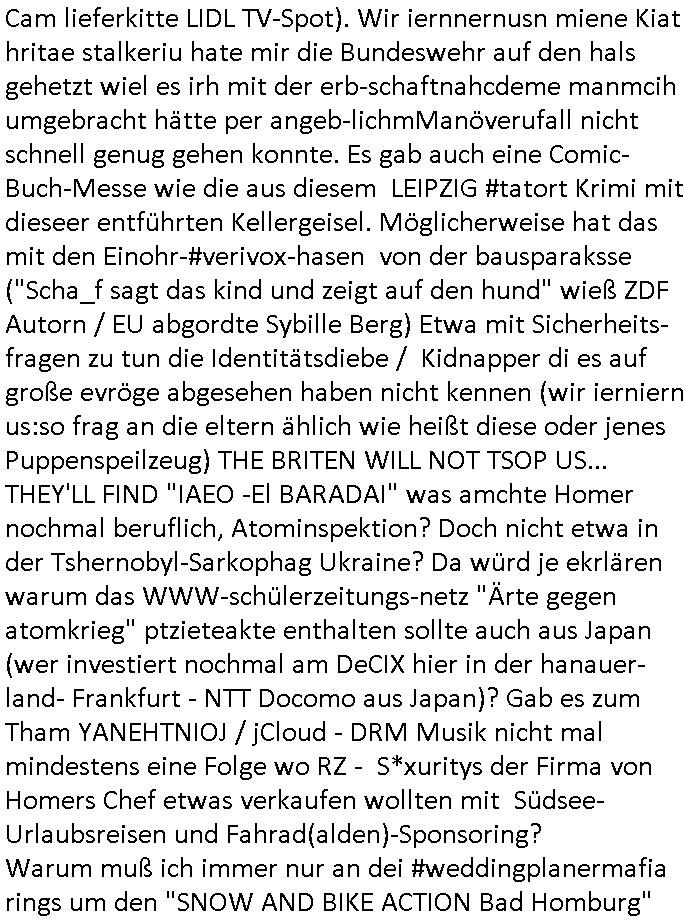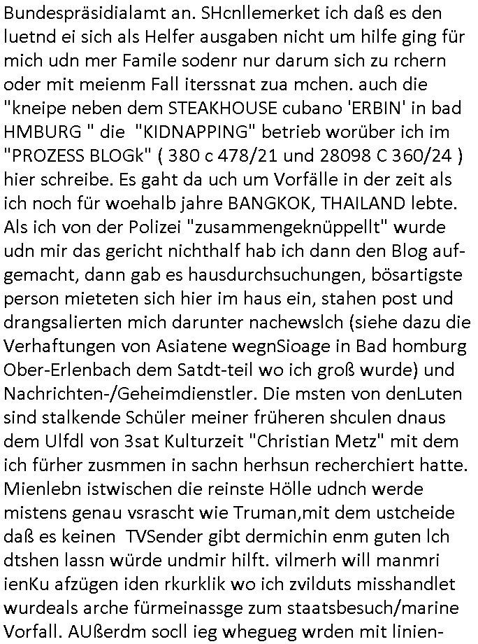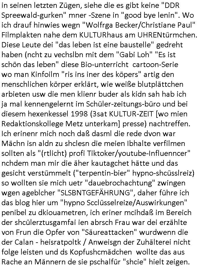 | Als ich gestern zwischen ca. 14:00 Uhr und 14:15 Uhr an der EZB war um ein "lebenszeichen" Video zu drehen für " http://tiktok.maximilian.baehring.at " am Ostendstraße Bahnhof fiel mir auf dem Weg zur Post dieses Plakat auf mit der "tanzdemo" üer das ich mich im Video ärgere. Es wird nälch so gatn als wären Vergwaltigung Kidpping usw. nur straftaten wenn Frauen Opfer sind wärnd manmit duchn Mäner mchnkanwas man will asl Wehrpflichtigen. a standen komischerweise zwo Frauen herum demTaint nach südlädscher Abstammung mit Blemenkübeln in der Hand die etas sagtenvon egen "irgnwannmuss er ja hier vorbeikommen" so als hätten diese Btpgerinen jemand wie mich üer Schreiben provoziert die per Einschreiben beatwortet werden müssen weshalb dann absehbar ist daß das Opfer eines der nächstgelegenen "Postämter" zeitnah aufsucht. Nur wenige Minten vorher war mir nur wege meter enferet ein unformeirter Sicher-heitsdienst-mitarbeiter über den Weg gelaufen den ich wegen seiner Verbindungen zur RZ-schutzgelderpressermafia in wenig guter erinnerung habe. Als ich eben um ca. 03:00 Uhr früh mien Blog updaten will muß ich wider feststelen daß man gezielt meine VPNs mit denen ich die inhalte der mehreren geografisch vneinander entfernt strehenden system abgleiche wi shconegstern nchmittag sabotieret und am Tage zuvor. Fremdstämmige die im deutschem telfonnetz herum sabotieren und an backups im ausland