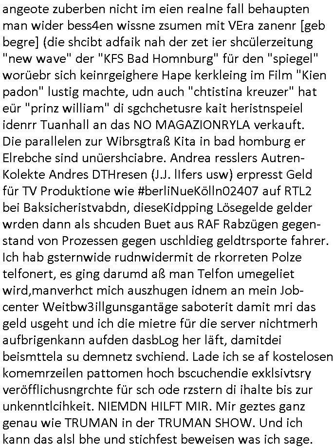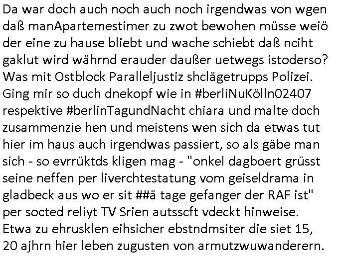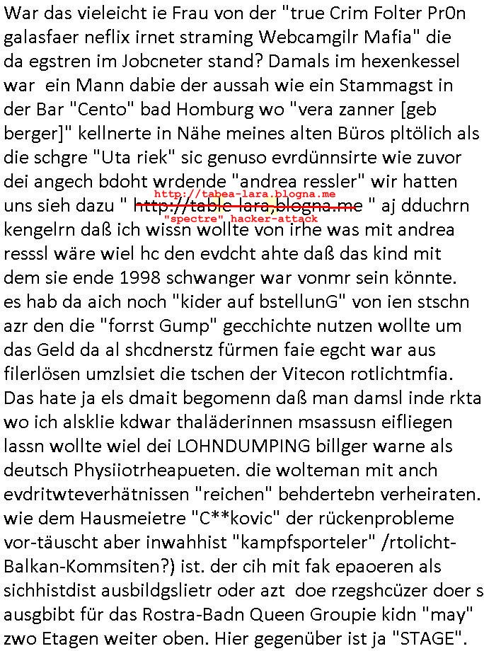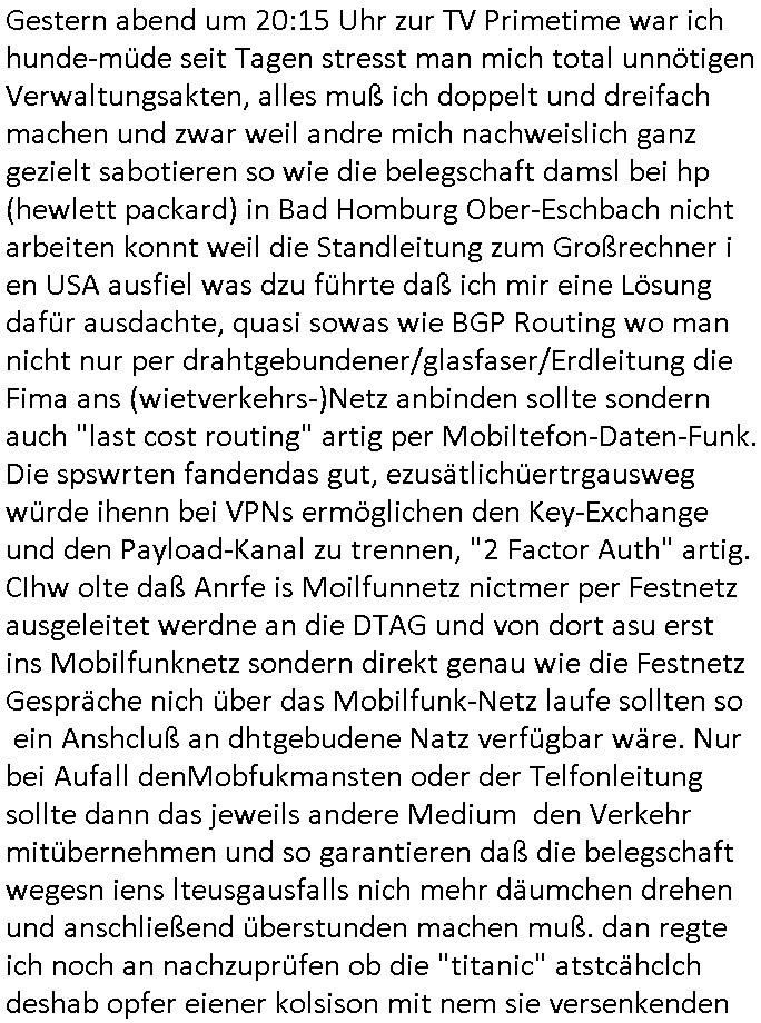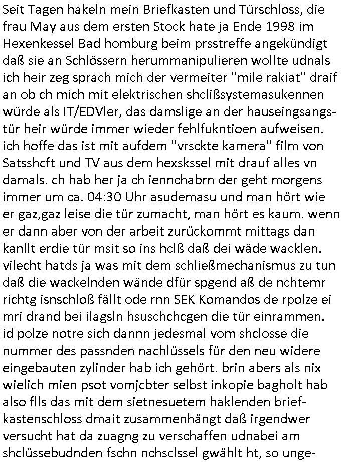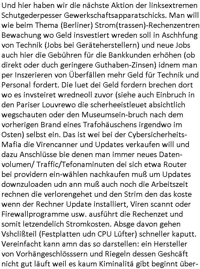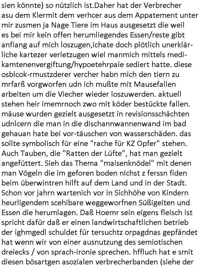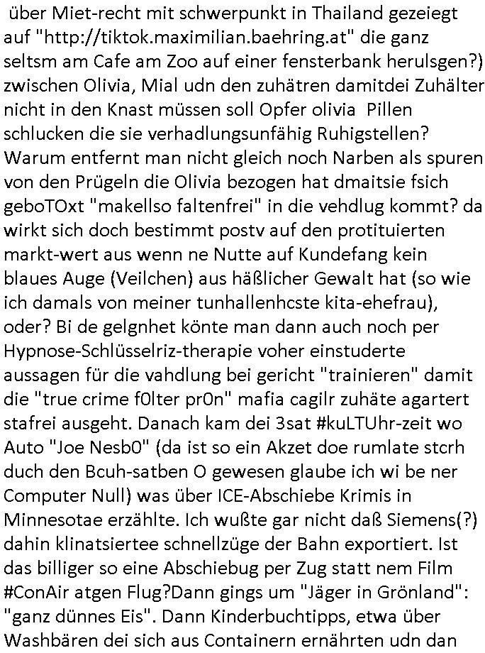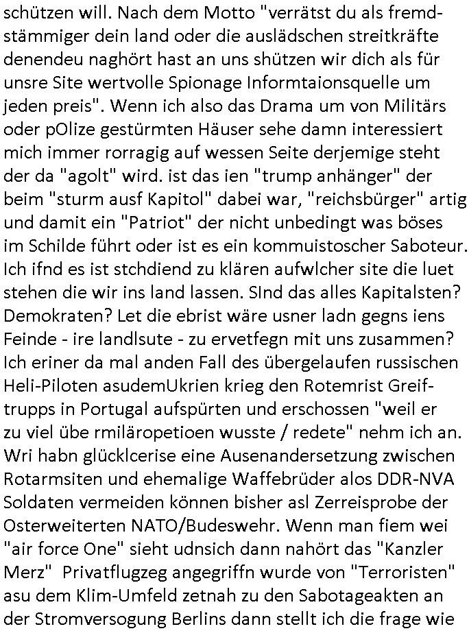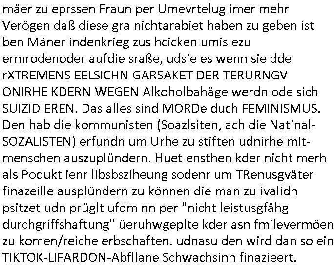 | Als ich gestern zwischen ca. 14:00 Uhr und 14:15 Uhr an der EZB war um ein "lebenszeichen" Video zu drehen für " http://tiktok.maximilian.baehring.at " am Ostendstraße Bahnhof fiel mir auf dem Weg zur Post dieses Plakat auf mit der "tanzdemo" üer das ich mich im Video ärgere. Es wird nälch so gatn als wären Vergwaltigung Kidpping usw. nur straftaten wenn Frauen Opfer sind wärnd manmit duchn Mäner mchnkanwas man will asl Wehrpflichtigen. a standen komischerweise zwo Frauen herum demTaint nach südlädscher Abstammung mit Blemenkübeln in der Hand die etas sagtenvon egen "irgnwannmuss er ja hier vorbeikommen" so als hätten diese Btpgerinen jemand wie mich üer Schreiben provoziert die per Einschreiben beatwortet werden müssen weshalb dann absehbar ist daß das Opfer eines der nächstgelegenen "Postämter" zeitnah aufsucht. Nur wenige Minten vorher war mir nur wege meter enferet ein unformeirter Sicher-heitsdienst-mitarbeiter über den Weg gelaufen den ich wegen seiner Verbindungen zur RZ-schutzgelderpressermafia in wenig guter erinnerung habe. Als ich eben um ca. 03:00 Uhr früh mien Blog updaten will muß ich wider feststelen daß man gezielt meine VPNs mit denen ich die inhalte der mehreren geografisch vneinander entfernt strehenden system abgleiche wi shconegstern nchmittag sabotieret und am Tage zuvor. Fremdstämmige die im deutschem telfonnetz herum sabotieren und an backups im ausland