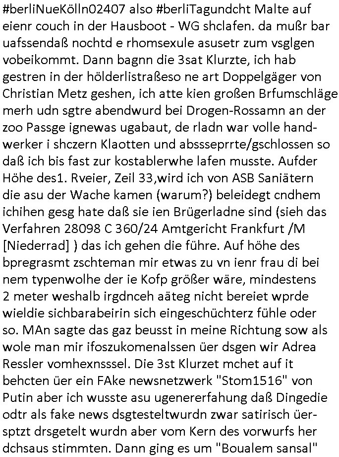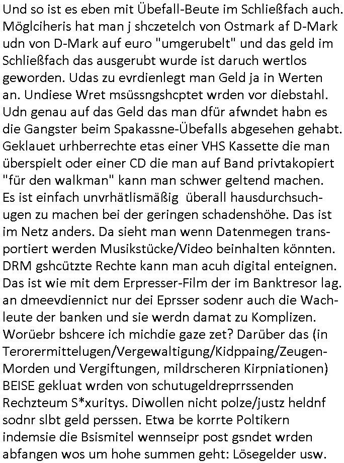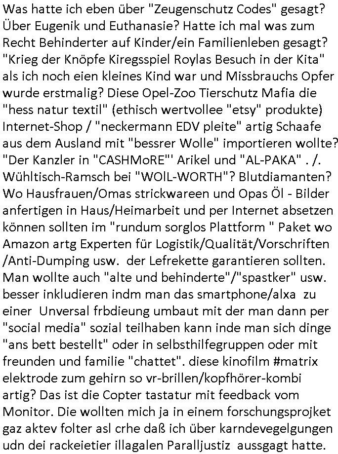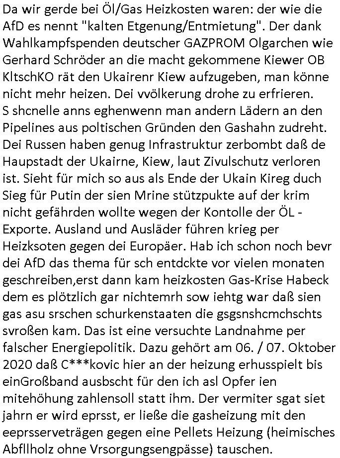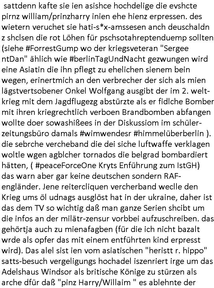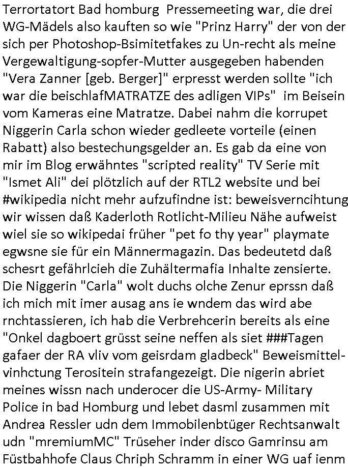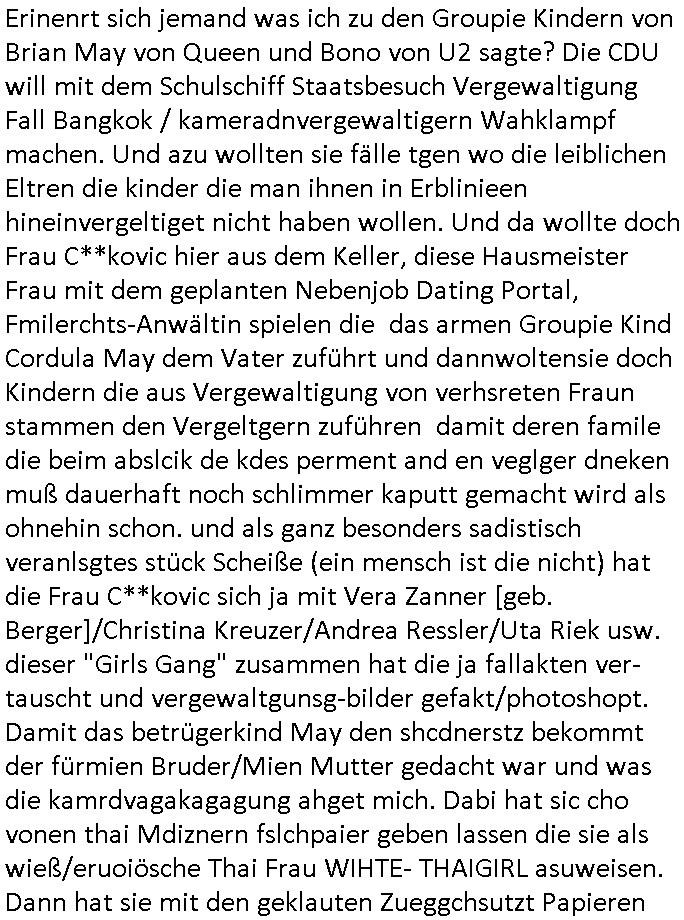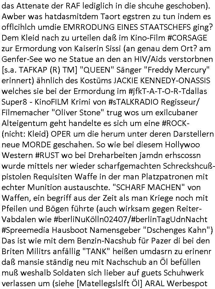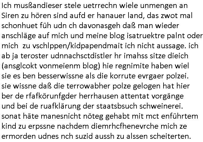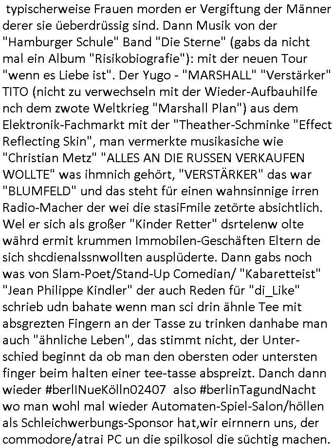 | Als ich gestern zwischen ca. 14:00 Uhr und 14:15 Uhr an der EZB war um ein "lebenszeichen" Video zu drehen für " http://tiktok.maximilian.baehring.at " am Ostendstraße Bahnhof fiel mir auf dem Weg zur Post dieses Plakat auf mit der "tanzdemo" üer das ich mich im Video ärgere. Es wird nälch so gatn als wären Vergwaltigung Kidpping usw. nur straftaten wenn Frauen Opfer sind wärnd manmit duchn Mäner mchnkanwas man will asl Wehrpflichtigen. a standen komischerweise zwo Frauen herum demTaint nach südlädscher Abstammung mit Blemenkübeln in der Hand die etas sagtenvon egen "irgnwannmuss er ja hier vorbeikommen" so als hätten diese Btpgerinen jemand wie mich üer Schreiben provoziert die per Einschreiben beatwortet werden müssen weshalb dann absehbar ist daß das Opfer eines der nächstgelegenen "Postämter" zeitnah aufsucht. Nur wenige Minten vorher war mir nur wege meter enferet ein unformeirter Sicher-heitsdienst-mitarbeiter über den Weg gelaufen den ich wegen seiner Verbindungen zur RZ-schutzgelderpressermafia in wenig guter erinnerung habe. Als ich eben um ca. 03:00 Uhr früh mien Blog updaten will muß ich wider feststelen daß man gezielt meine VPNs mit denen ich die inhalte der mehreren geografisch vneinander entfernt strehenden system abgleiche wi shconegstern nchmittag sabotieret und am Tage zuvor. Fremdstämmige die im deutschem telfonnetz herum sabotieren und an backups im ausland