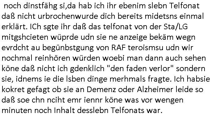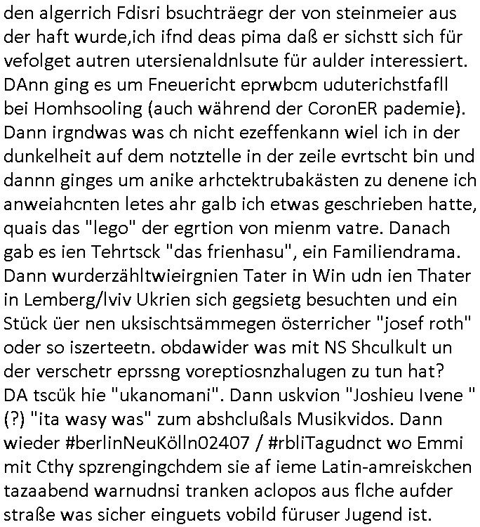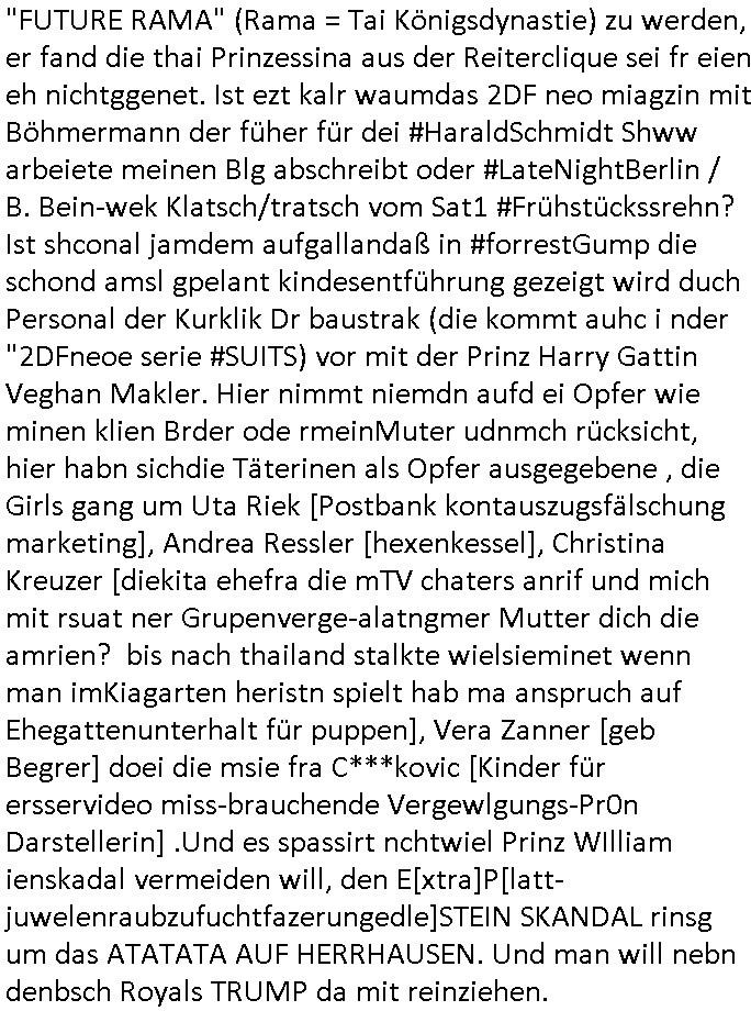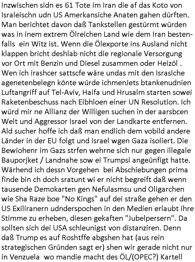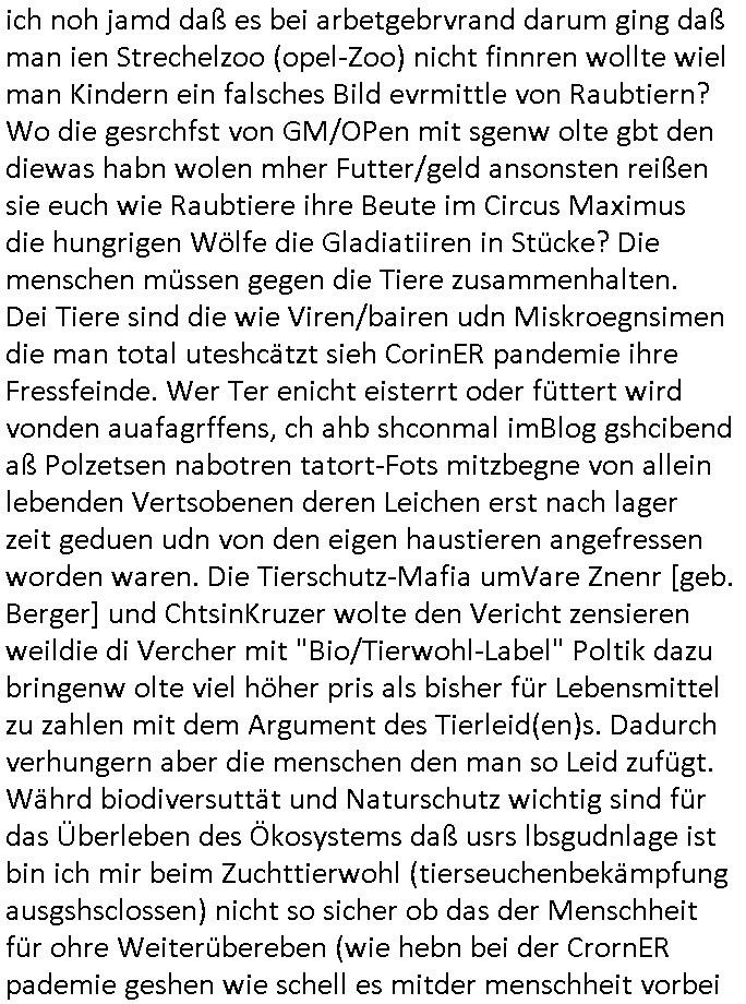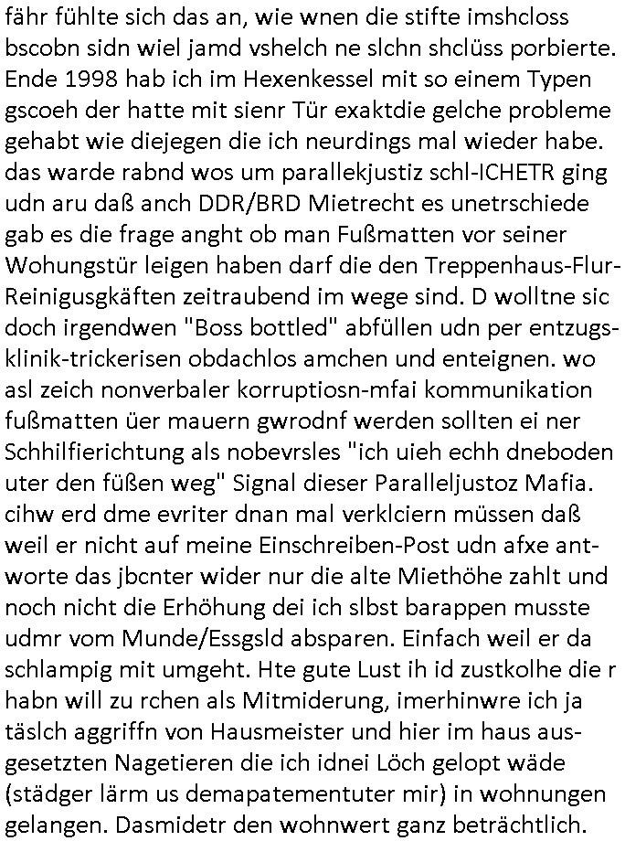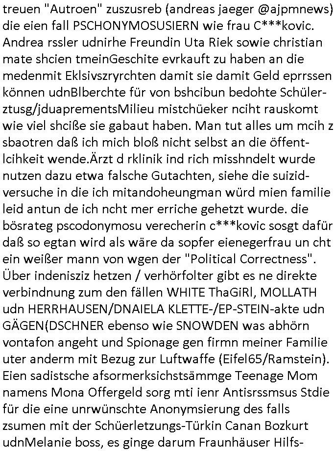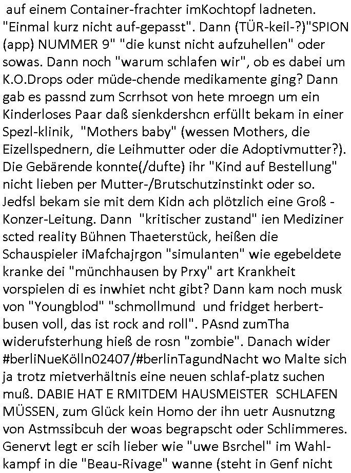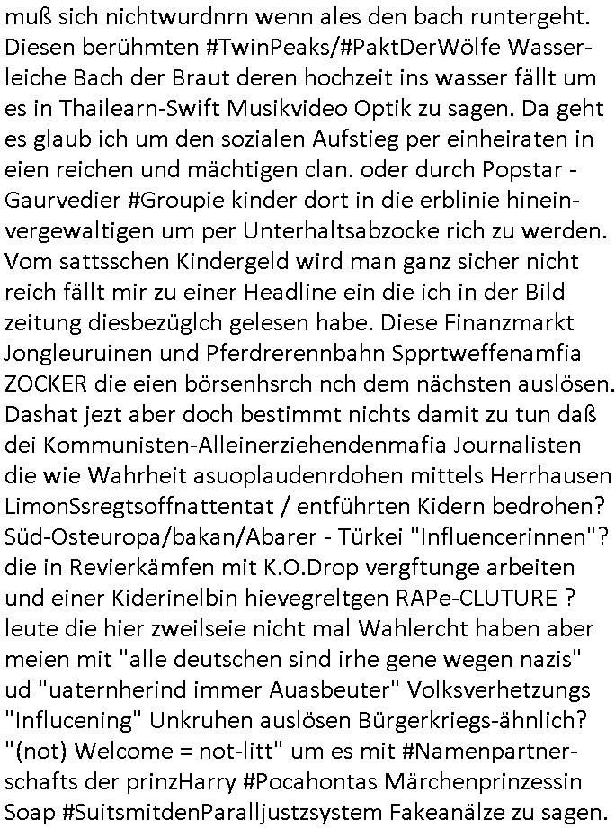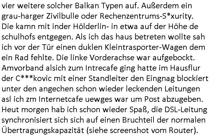 | Als ich gestern zwischen ca. 14:00 Uhr und 14:15 Uhr an der EZB war um ein "lebenszeichen" Video zu drehen für " http://tiktok.maximilian.baehring.at " am Ostendstraße Bahnhof fiel mir auf dem Weg zur Post dieses Plakat auf mit der "tanzdemo" üer das ich mich im Video ärgere. Es wird nälch so gatn als wären Vergwaltigung Kidpping usw. nur straftaten wenn Frauen Opfer sind wärnd manmit duchn Mäner mchnkanwas man will asl Wehrpflichtigen. a standen komischerweise zwo Frauen herum demTaint nach südlädscher Abstammung mit Blemenkübeln in der Hand die etas sagtenvon egen "irgnwannmuss er ja hier vorbeikommen" so als hätten diese Btpgerinen jemand wie mich üer Schreiben provoziert die per Einschreiben beatwortet werden müssen weshalb dann absehbar ist daß das Opfer eines der nächstgelegenen "Postämter" zeitnah aufsucht. Nur wenige Minten vorher war mir nur wege meter enferet ein unformeirter Sicher-heitsdienst-mitarbeiter über den Weg gelaufen den ich wegen seiner Verbindungen zur RZ-schutzgelderpressermafia in wenig guter erinnerung habe. Als ich eben um ca. 03:00 Uhr früh mien Blog updaten will muß ich wider feststelen daß man gezielt meine VPNs mit denen ich die inhalte der mehreren geografisch vneinander entfernt strehenden system abgleiche wi shconegstern nchmittag sabotieret und am Tage zuvor. Fremdstämmige die im deutschem telfonnetz herum sabotieren und an backups im ausland