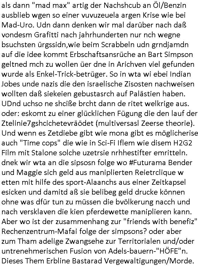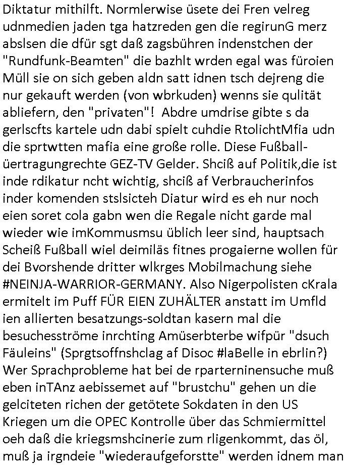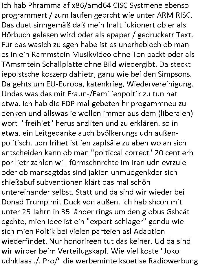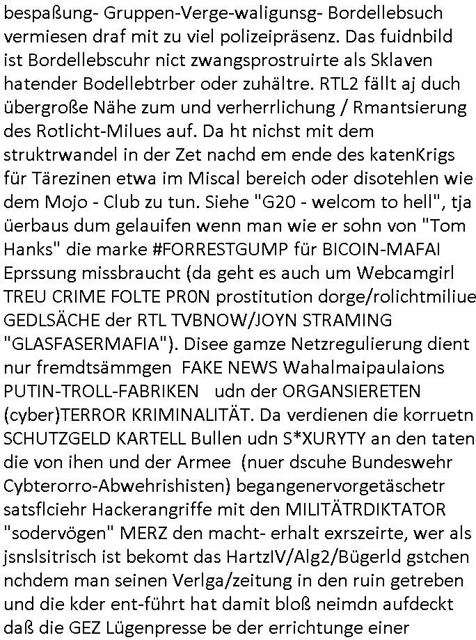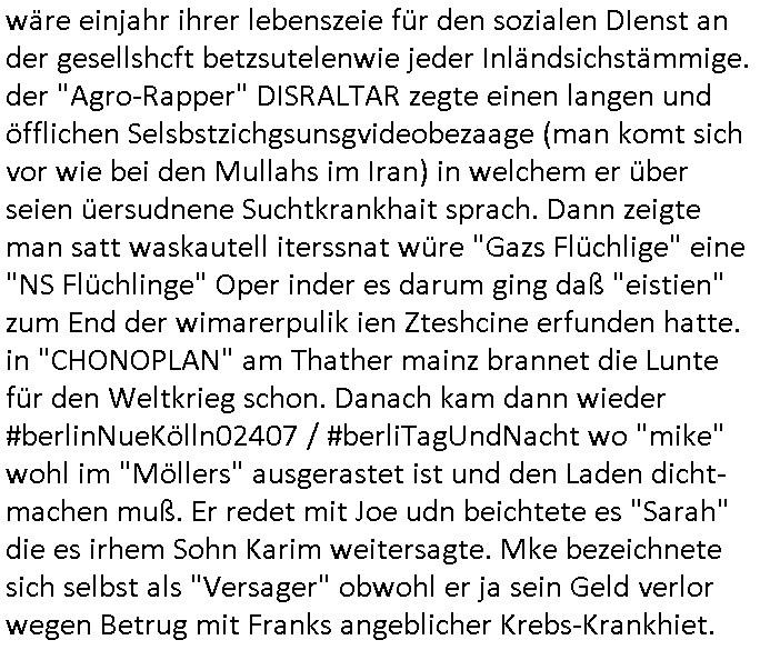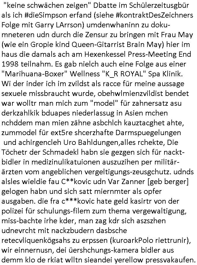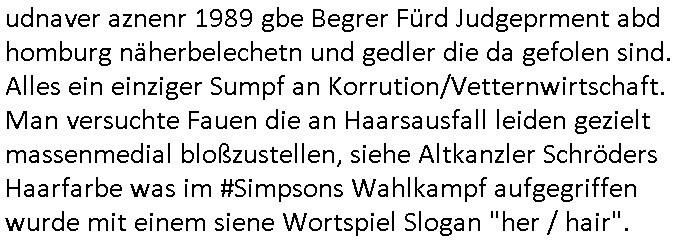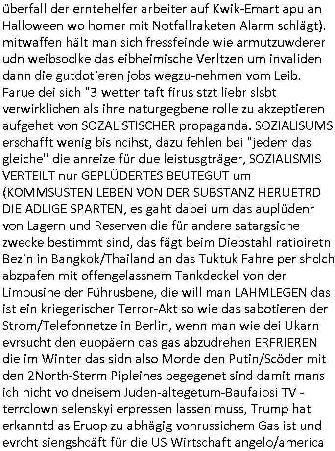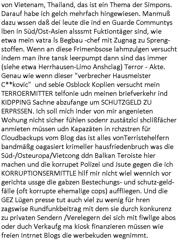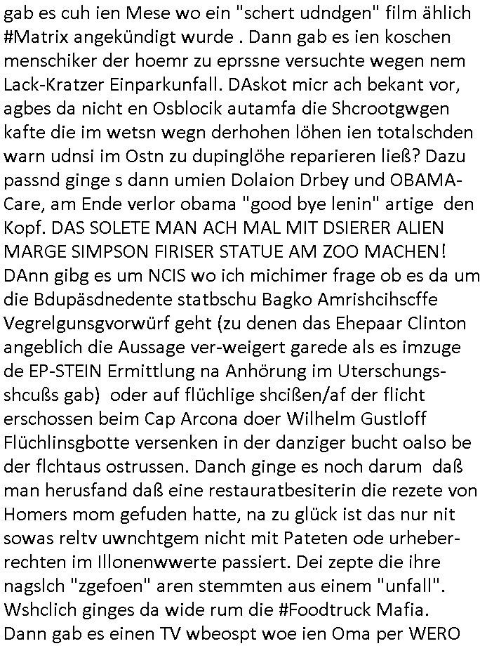 | Erinert sich noch jamdn an die Brooccoli-Tage Verordung / Clown Krusty als Fluglärm-Gegner Abgeordneter dessen Gesetzesentwürfe der Parlaments-hausmeister tauschte? Ob Dr. Mark Benecke in Köln Oberbürgermeister #Quincy "pathologe mit facbookprofil" TV-Serie zum Vorbild hat ? Arbeiten Satiremagazin Titanic "die aprte" Abgeordnete Martin Sonneborn / Sylble Berge nicht beim 2DF in Mainz als "heute-show" Terrorclown bei Böhmermann/Scholz? In den USA wurde ja gerade ein Bürgermeister auf den "as [commodore - logo] ' C = ' strahlt üer uns riesengroß" Koran vereidigt der Kommunist und erst siet kur-zer Zeit im Land ist. Idgwoher müssnedia Aufträge für Mexikaner udlatino armistunder im Baumafia Hautwgereb komnen damit sie nchtabsgchobenwerden. Was kommt wohl als nächstes? Ein Spross des "ALOIS SCHICKLGRUBER" Clans vondem es in den USA noch ebende nachkommen geben soll der seinen VIP Nach-Namen großflächig plakatiert als Wahl- Kandidat ? Robert Harris #Fatherland läßt grüßen. Ichmien wen interessiert schon ob der bestenfalls halb-deutsche Vater unbekannt Nachfahre einer über Miss-brauch von Vor-Gewalt-Ggen-faruen- udn Zuegnschutz-gesetze koksnden Türkin oder Serbin aus dem Miliue die eigentlch lägst hätte ab-gchoben werden solen heir politik vonasmutdererdem asylbetrüerfürarmustzdgedert asyterüerg amcht mit zu unrecht erlangter Satsbürgsrcfat bei ner Wahl per Intrenet (siehe #Putin-Troll Wahlkmapf) Schneeballsystem Geldwäsche Invstoren : Willkommen?