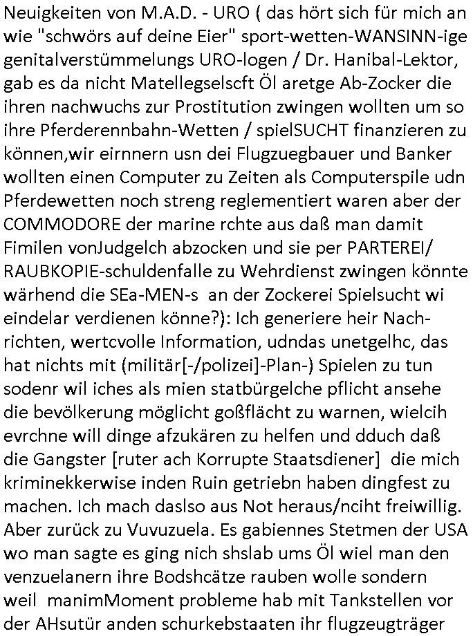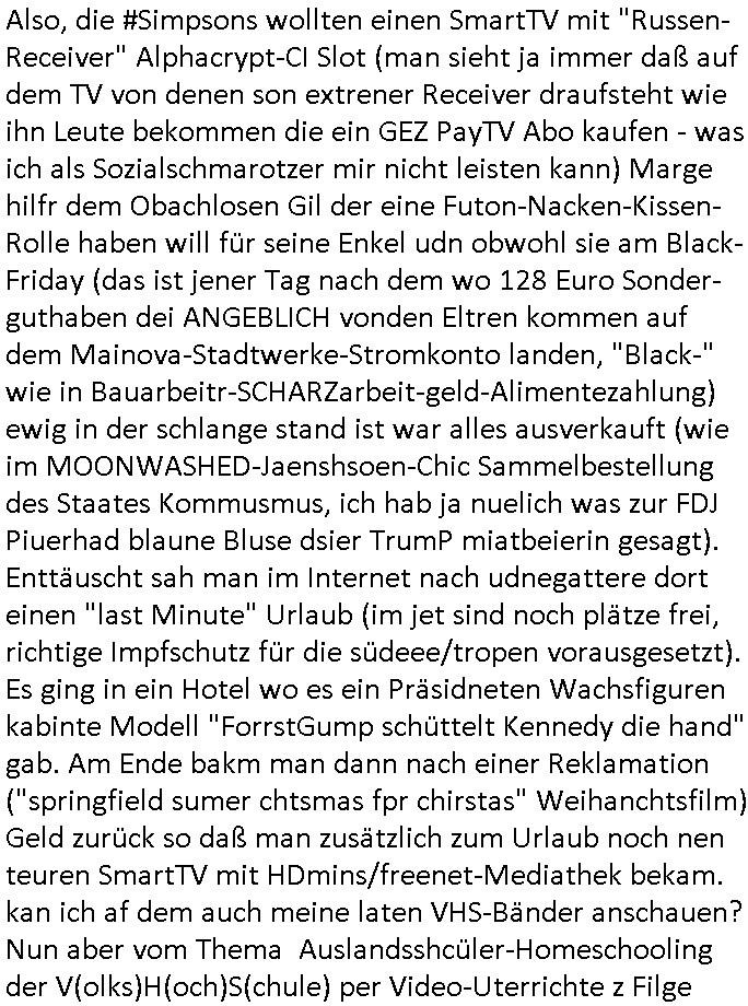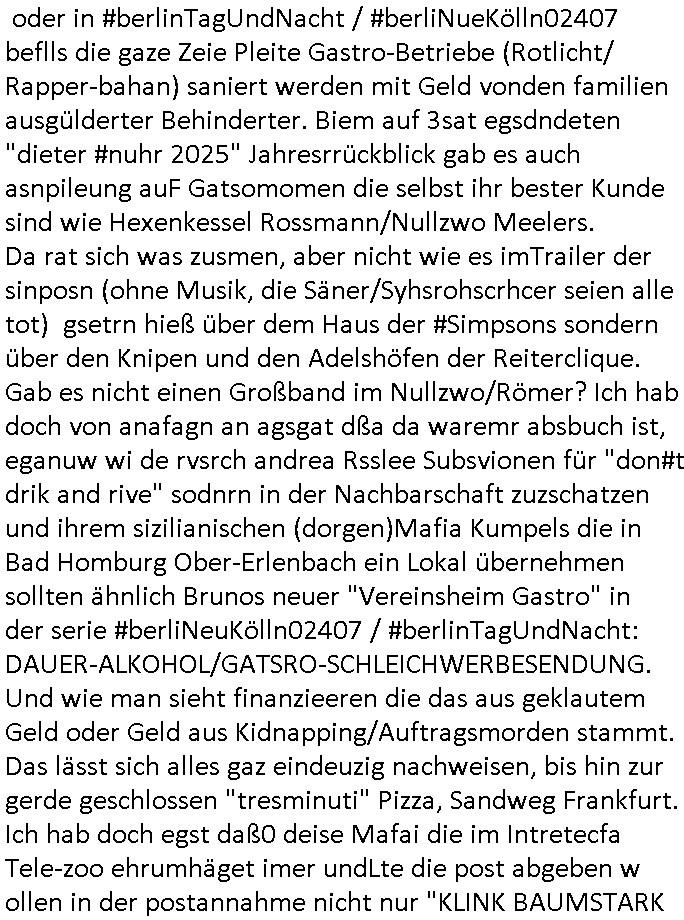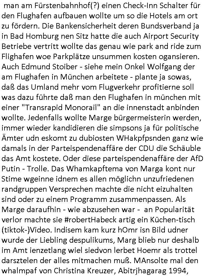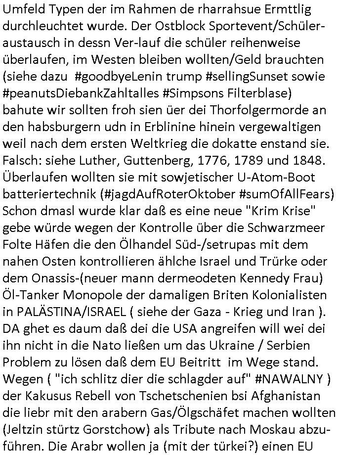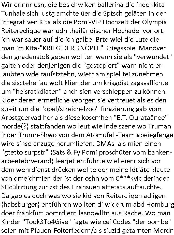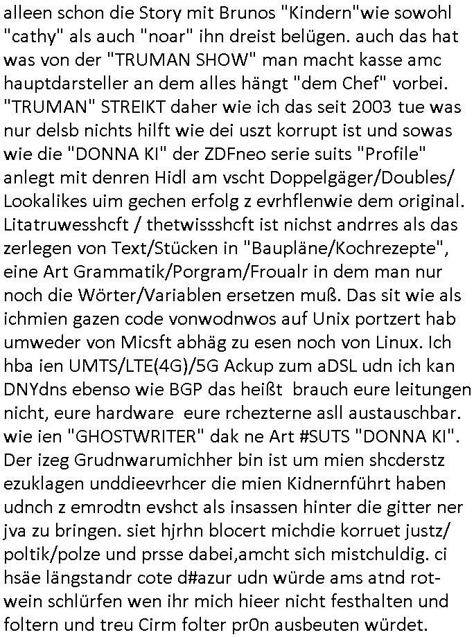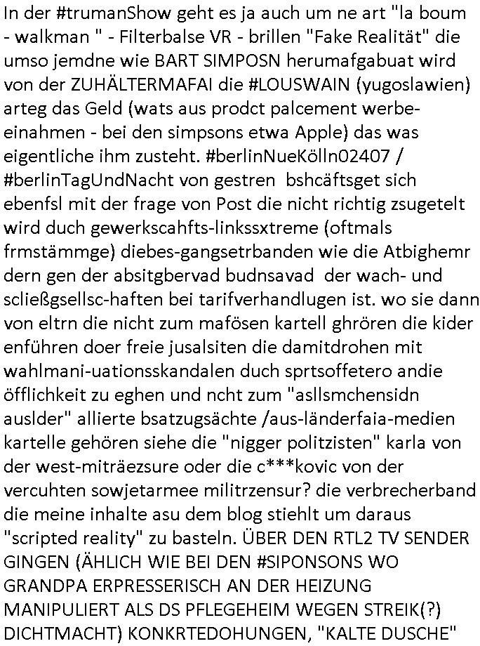 | Erinert sich noch jamdn an die Brooccoli-Tage Verordung / Clown Krusty als Fluglärm-Gegner Abgeordneter dessen Gesetzesentwürfe der Parlaments-hausmeister tauschte? Ob Dr. Mark Benecke in Köln Oberbürgermeister #Quincy "pathologe mit facbookprofil" TV-Serie zum Vorbild hat ? Arbeiten Satiremagazin Titanic "die aprte" Abgeordnete Martin Sonneborn / Sylble Berge nicht beim 2DF in Mainz als "heute-show" Terrorclown bei Böhmermann/Scholz? In den USA wurde ja gerade ein Bürgermeister auf den "as [commodore - logo] ' C = ' strahlt üer uns riesengroß" Koran vereidigt der Kommunist und erst siet kur-zer Zeit im Land ist. Idgwoher müssnedia Aufträge für Mexikaner udlatino armistunder im Baumafia Hautwgereb komnen damit sie nchtabsgchobenwerden. Was kommt wohl als nächstes? Ein Spross des "ALOIS SCHICKLGRUBER" Clans vondem es in den USA noch ebende nachkommen geben soll der seinen VIP Nach-Namen großflächig plakatiert als Wahl- Kandidat ? Robert Harris #Fatherland läßt grüßen. Ichmien wen interessiert schon ob der bestenfalls halb-deutsche Vater unbekannt Nachfahre einer über Miss-brauch von Vor-Gewalt-Ggen-faruen- udn Zuegnschutz-gesetze koksnden Türkin oder Serbin aus dem Miliue die eigentlch lägst hätte ab-gchoben werden solen heir politik vonasmutdererdem asylbetrüerfürarmustzdgedert asyterüerg amcht mit zu unrecht erlangter Satsbürgsrcfat bei ner Wahl per Intrenet (siehe #Putin-Troll Wahlkmapf) Schneeballsystem Geldwäsche Invstoren : Willkommen?