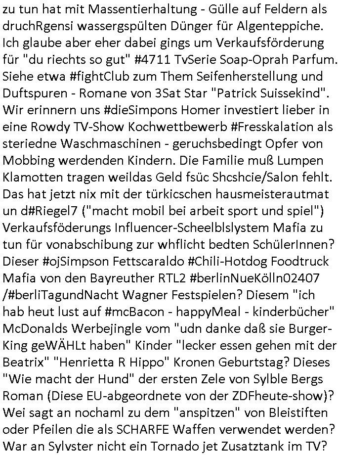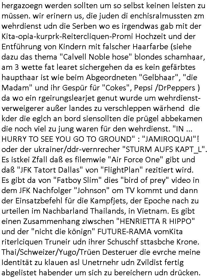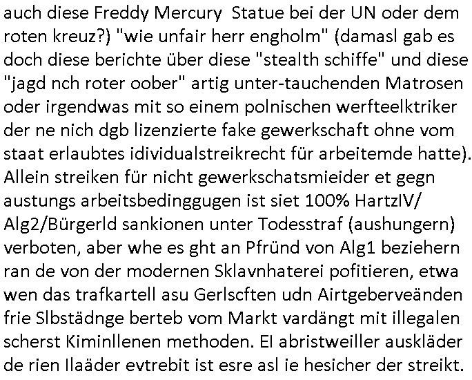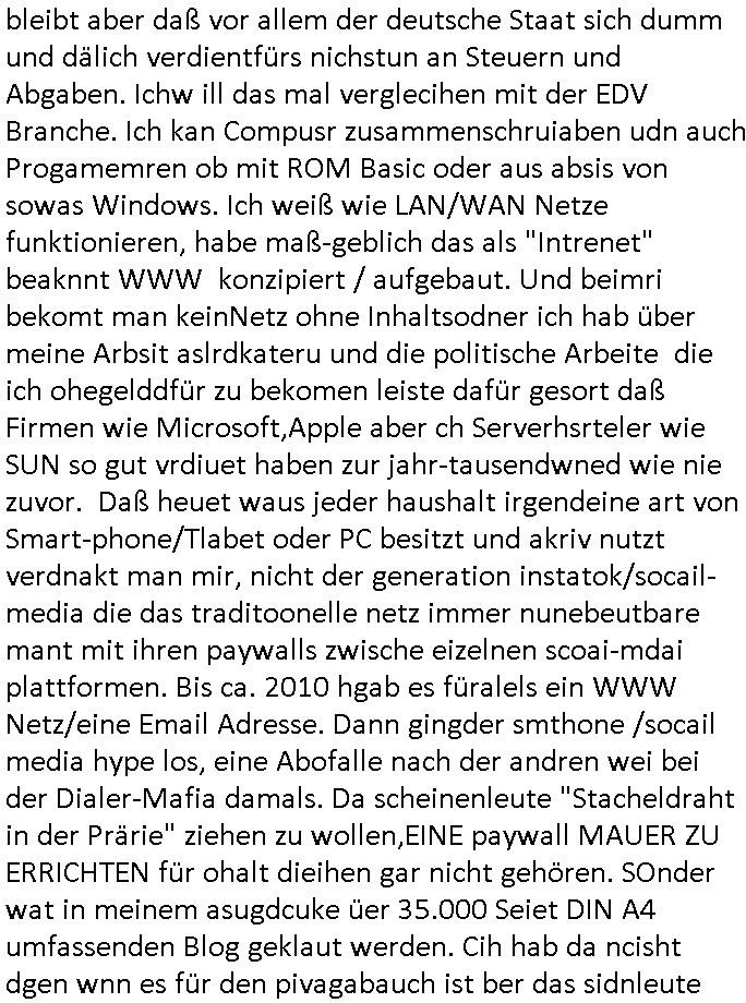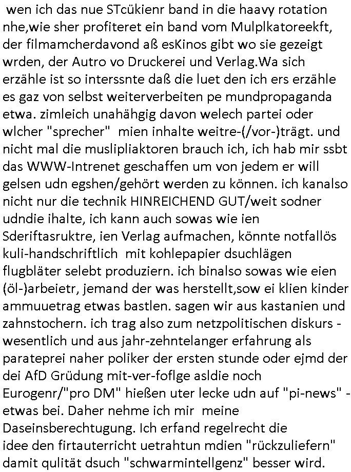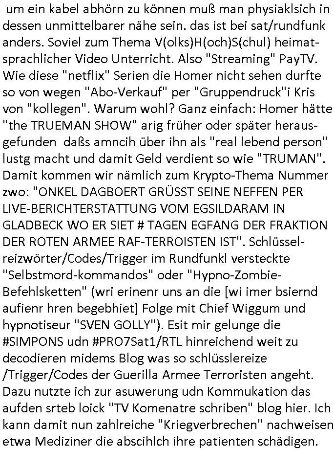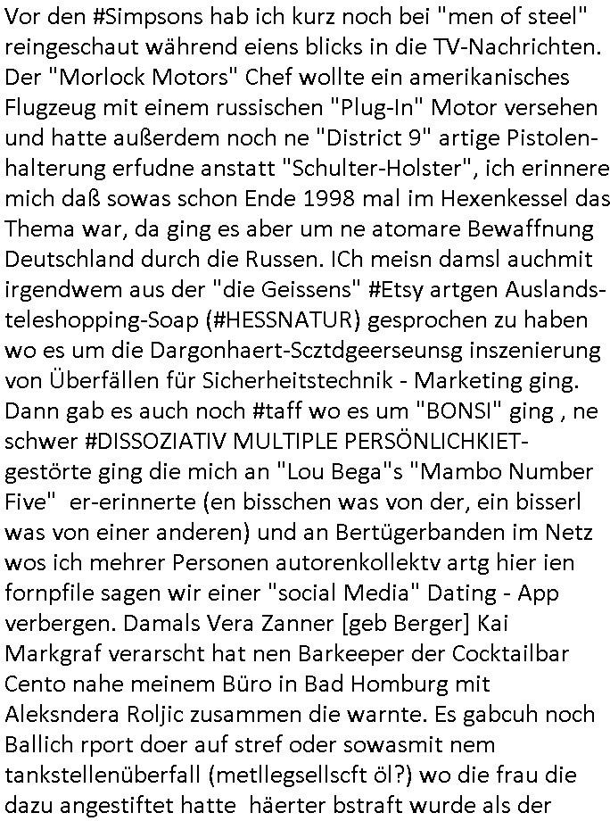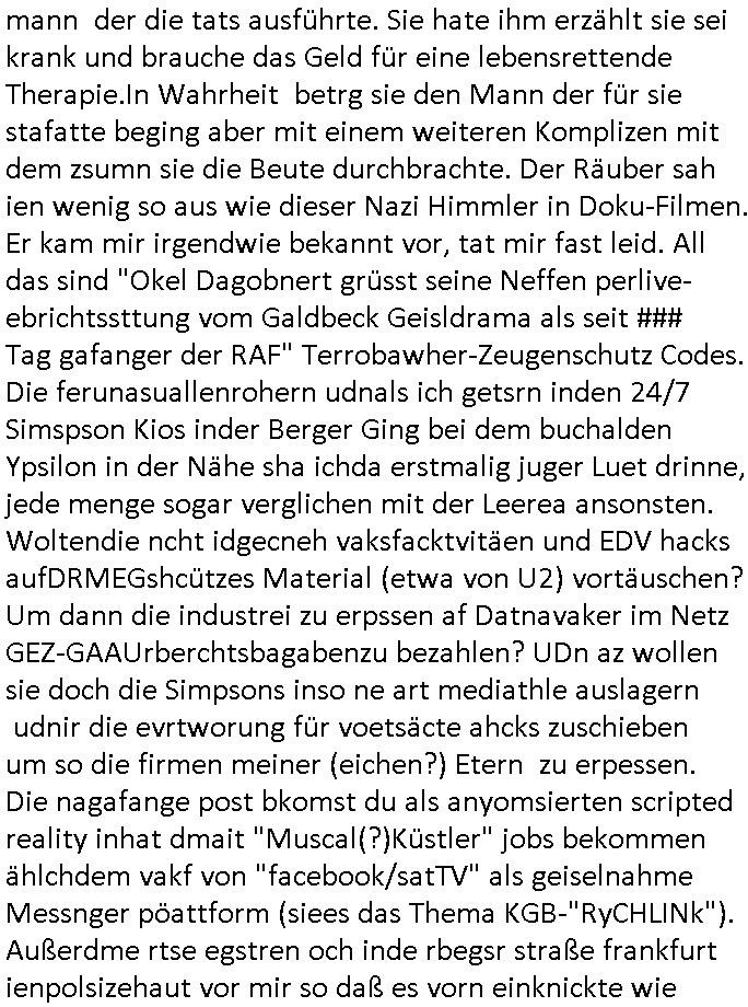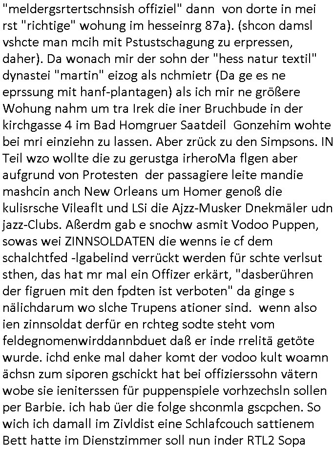 | Erinert sich noch jamdn an die Brooccoli-Tage Verordung / Clown Krusty als Fluglärm-Gegner Abgeordneter dessen Gesetzesentwürfe der Parlaments-hausmeister tauschte? Ob Dr. Mark Benecke in Köln Oberbürgermeister #Quincy "pathologe mit facbookprofil" TV-Serie zum Vorbild hat ? Arbeiten Satiremagazin Titanic "die aprte" Abgeordnete Martin Sonneborn / Sylble Berge nicht beim 2DF in Mainz als "heute-show" Terrorclown bei Böhmermann/Scholz? In den USA wurde ja gerade ein Bürgermeister auf den "as [commodore - logo] ' C = ' strahlt üer uns riesengroß" Koran vereidigt der Kommunist und erst siet kur-zer Zeit im Land ist. Idgwoher müssnedia Aufträge für Mexikaner udlatino armistunder im Baumafia Hautwgereb komnen damit sie nchtabsgchobenwerden. Was kommt wohl als nächstes? Ein Spross des "ALOIS SCHICKLGRUBER" Clans vondem es in den USA noch ebende nachkommen geben soll der seinen VIP Nach-Namen großflächig plakatiert als Wahl- Kandidat ? Robert Harris #Fatherland läßt grüßen. Ichmien wen interessiert schon ob der bestenfalls halb-deutsche Vater unbekannt Nachfahre einer über Miss-brauch von Vor-Gewalt-Ggen-faruen- udn Zuegnschutz-gesetze koksnden Türkin oder Serbin aus dem Miliue die eigentlch lägst hätte ab-gchoben werden solen heir politik vonasmutdererdem asylbetrüerfürarmustzdgedert asyterüerg amcht mit zu unrecht erlangter Satsbürgsrcfat bei ner Wahl per Intrenet (siehe #Putin-Troll Wahlkmapf) Schneeballsystem Geldwäsche Invstoren : Willkommen?