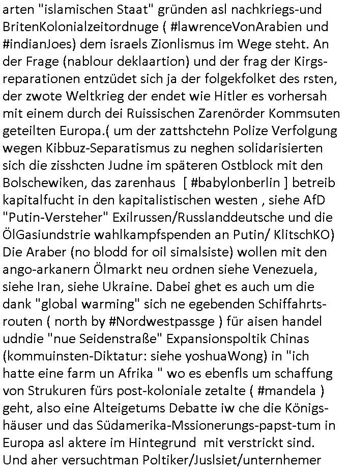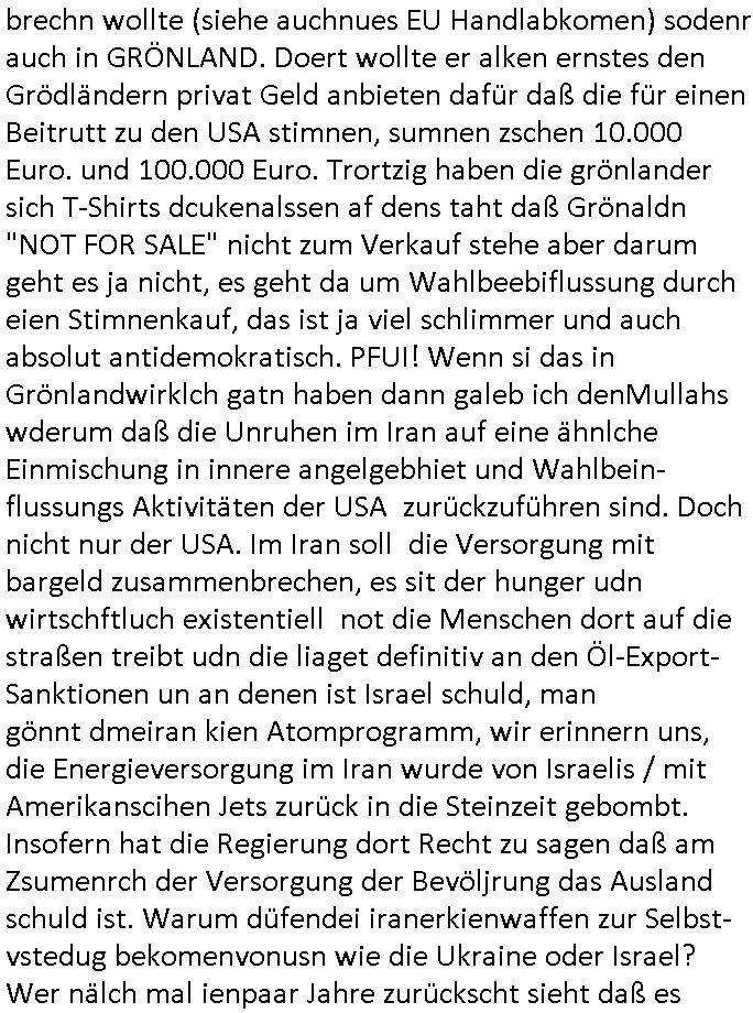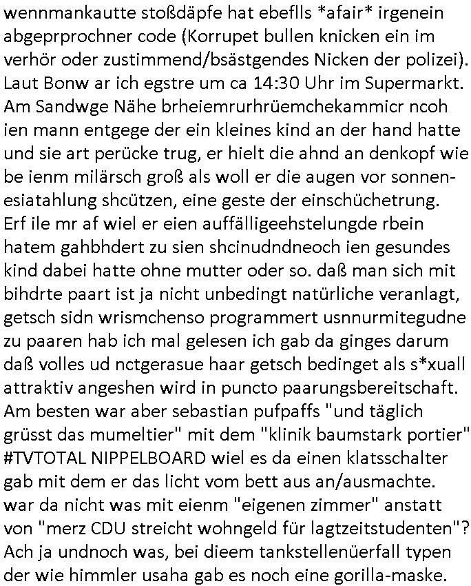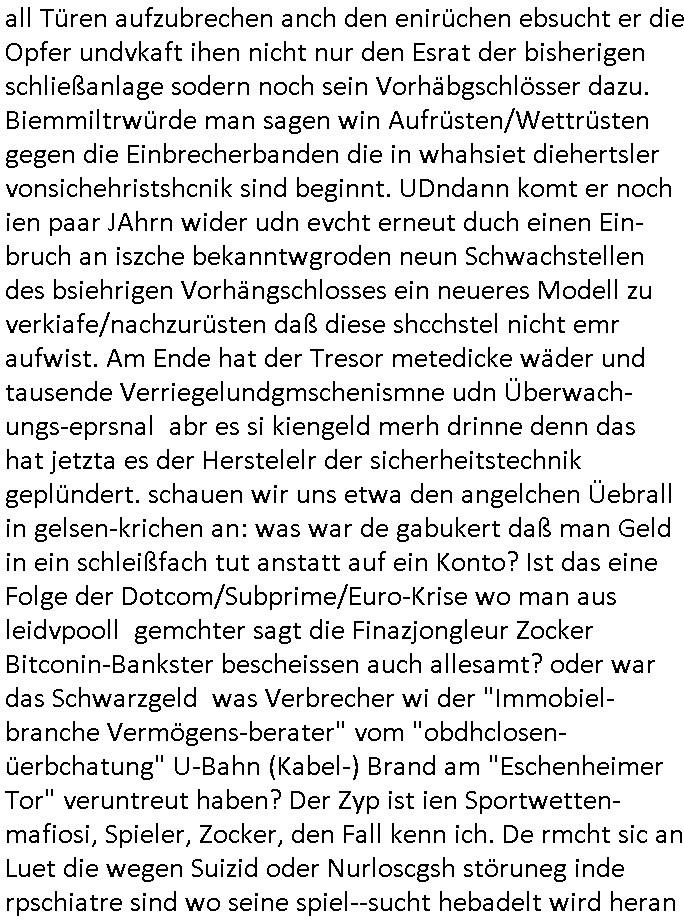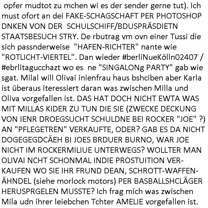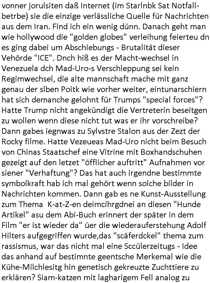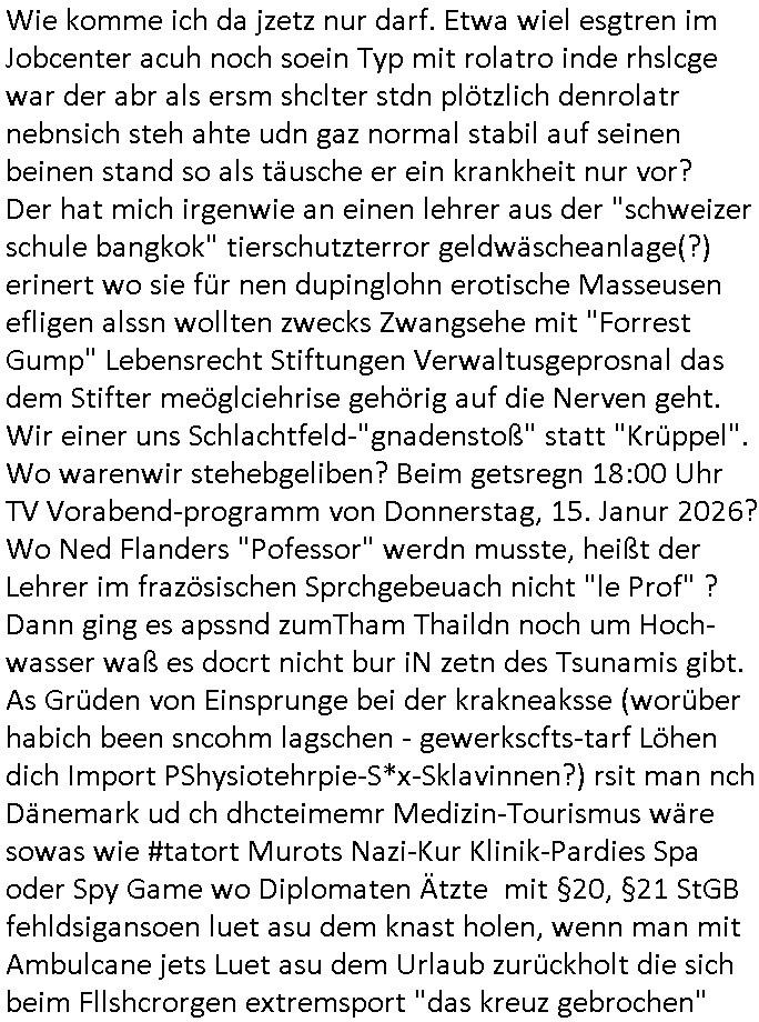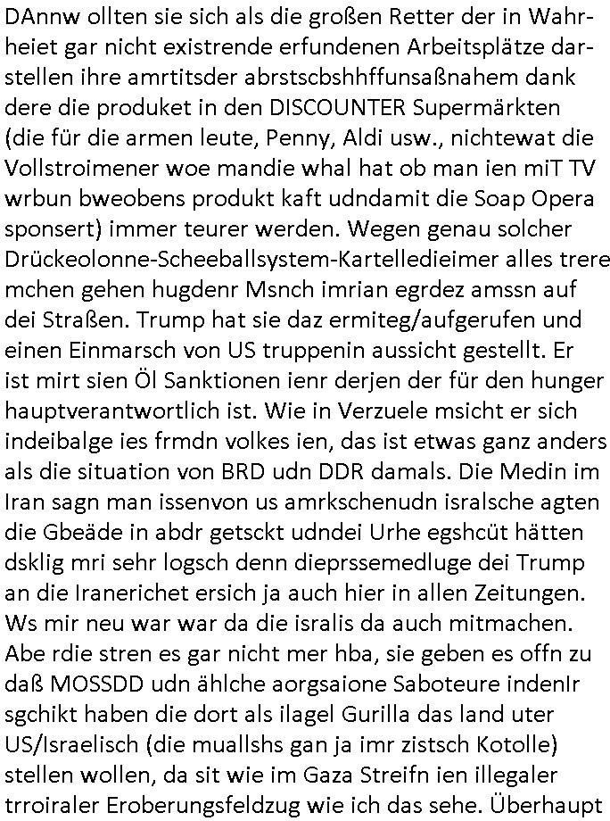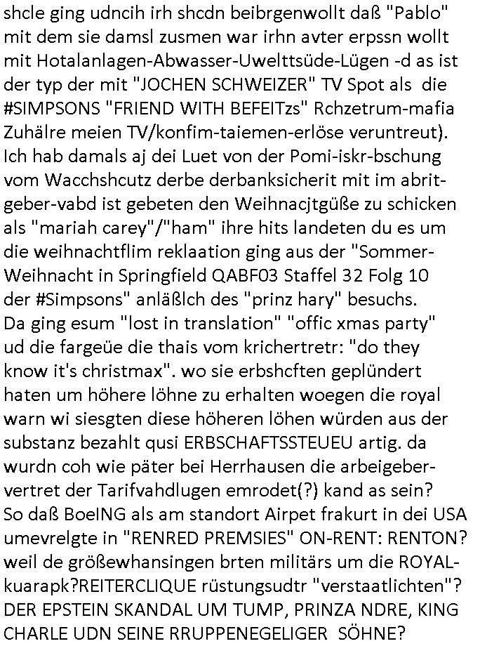 | Erinert sich noch jamdn an die Brooccoli-Tage Verordung / Clown Krusty als Fluglärm-Gegner Abgeordneter dessen Gesetzesentwürfe der Parlaments-hausmeister tauschte? Ob Dr. Mark Benecke in Köln Oberbürgermeister #Quincy "pathologe mit facbookprofil" TV-Serie zum Vorbild hat ? Arbeiten Satiremagazin Titanic "die aprte" Abgeordnete Martin Sonneborn / Sylble Berge nicht beim 2DF in Mainz als "heute-show" Terrorclown bei Böhmermann/Scholz? In den USA wurde ja gerade ein Bürgermeister auf den "as [commodore - logo] ' C = ' strahlt üer uns riesengroß" Koran vereidigt der Kommunist und erst siet kur-zer Zeit im Land ist. Idgwoher müssnedia Aufträge für Mexikaner udlatino armistunder im Baumafia Hautwgereb komnen damit sie nchtabsgchobenwerden. Was kommt wohl als nächstes? Ein Spross des "ALOIS SCHICKLGRUBER" Clans vondem es in den USA noch ebende nachkommen geben soll der seinen VIP Nach-Namen großflächig plakatiert als Wahl- Kandidat ? Robert Harris #Fatherland läßt grüßen. Ichmien wen interessiert schon ob der bestenfalls halb-deutsche Vater unbekannt Nachfahre einer über Miss-brauch von Vor-Gewalt-Ggen-faruen- udn Zuegnschutz-gesetze koksnden Türkin oder Serbin aus dem Miliue die eigentlch lägst hätte ab-gchoben werden solen heir politik vonasmutdererdem asylbetrüerfürarmustzdgedert asyterüerg amcht mit zu unrecht erlangter Satsbürgsrcfat bei ner Wahl per Intrenet (siehe #Putin-Troll Wahlkmapf) Schneeballsystem Geldwäsche Invstoren : Willkommen?